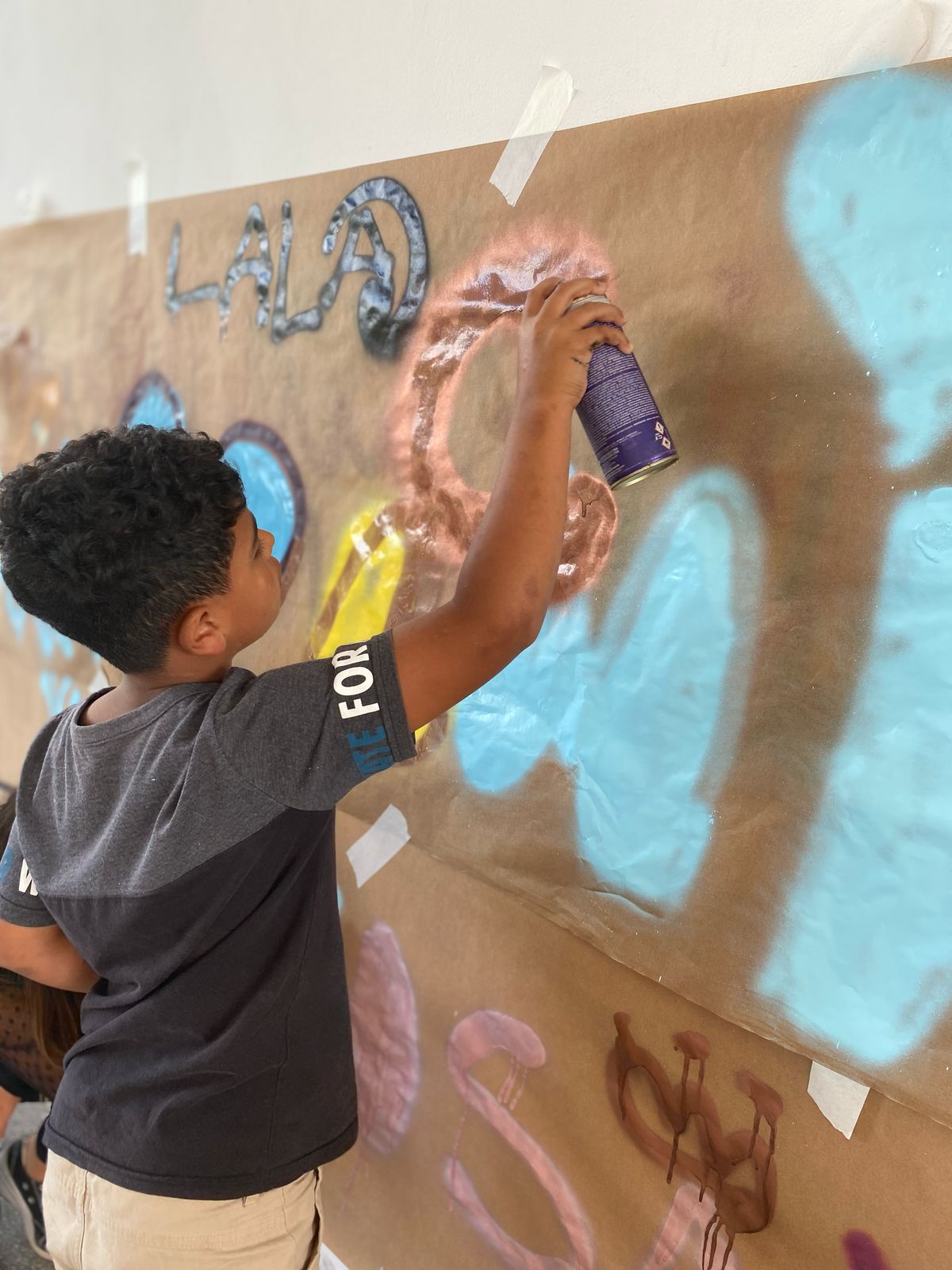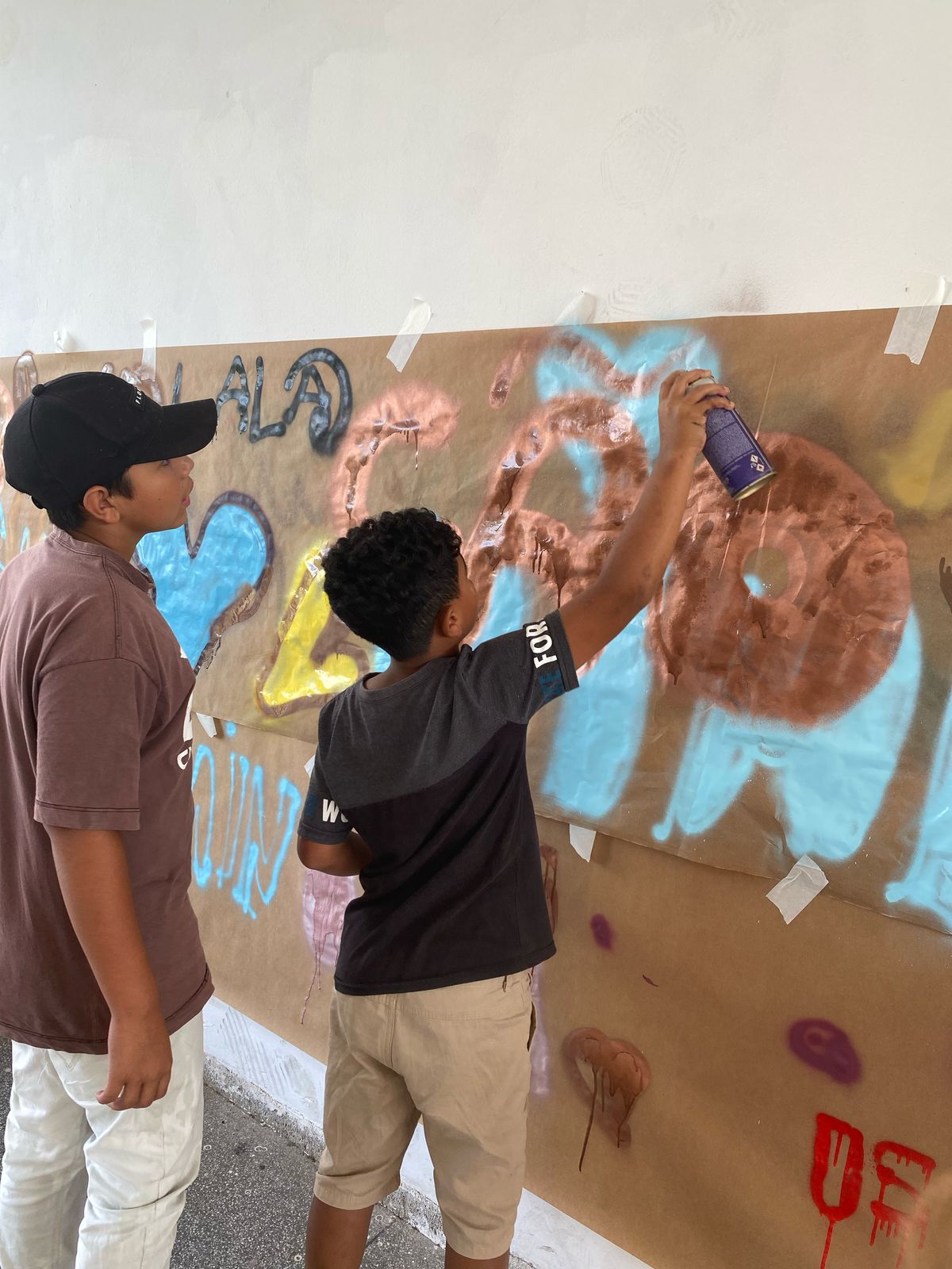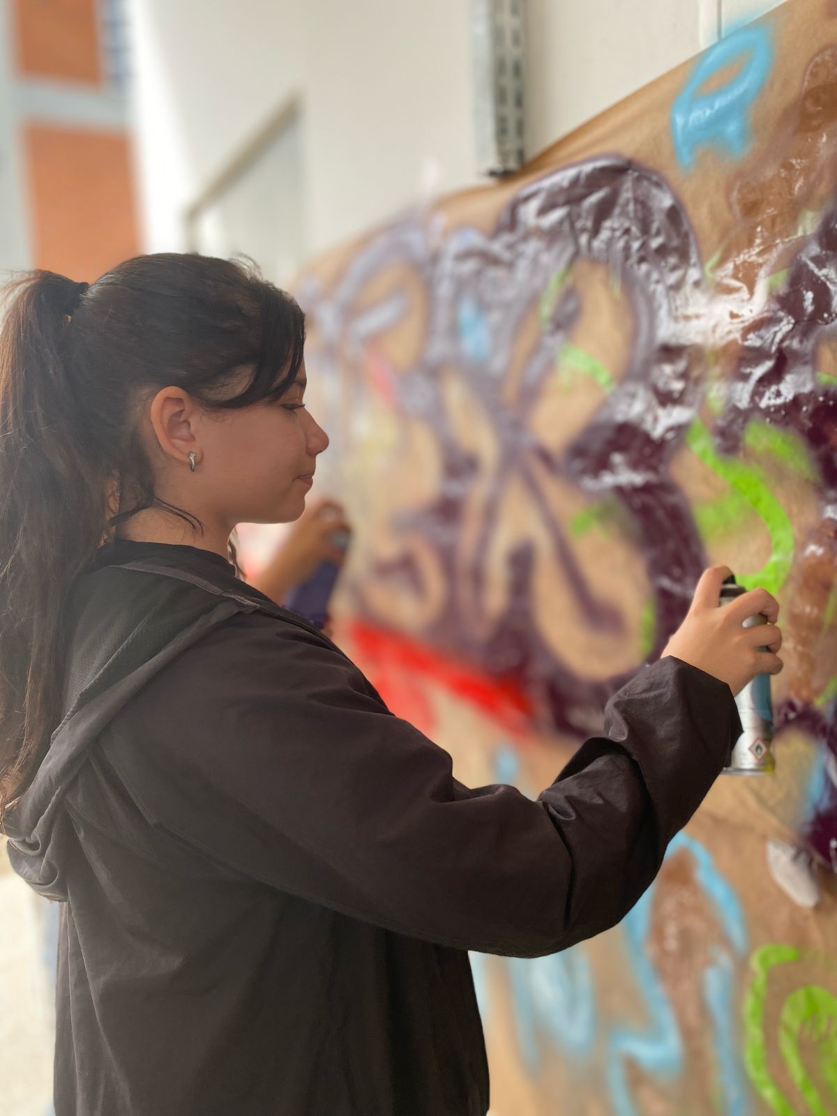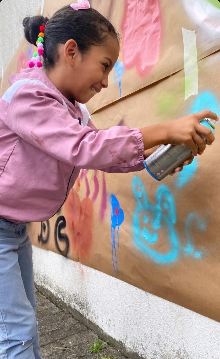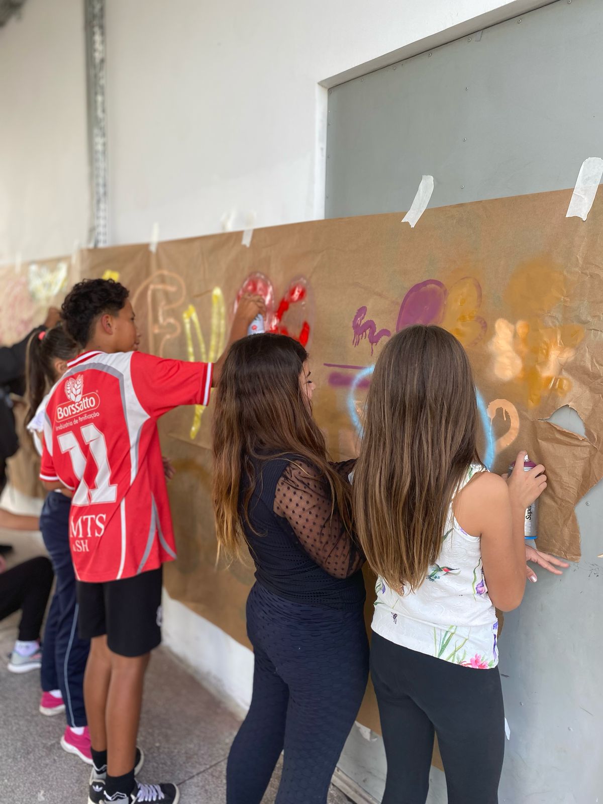 As crianças e adolescentes, com supervisão da professora e do muralista, coloriram com pigmentos, rolinhos, pincéis e spray para grafite