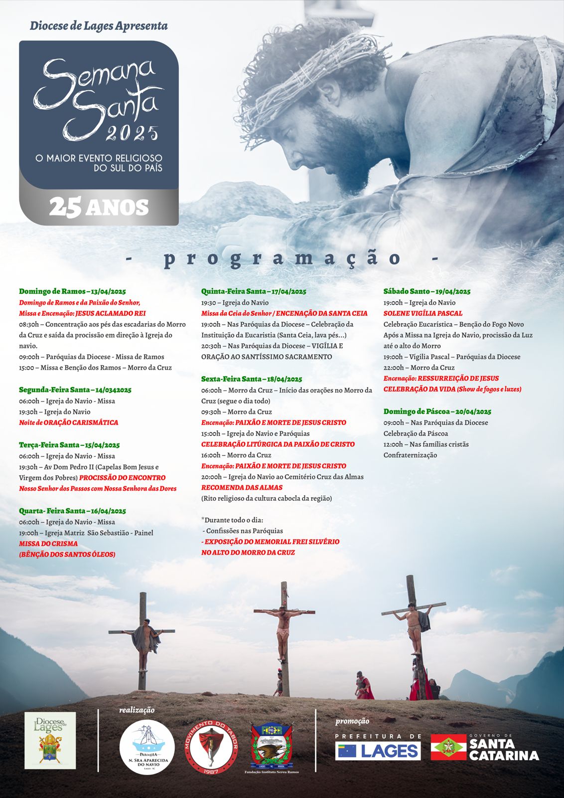 Apresentada pela Diocese de Lages, a Semana Santa será desenvolvida pela Paróquia Nossa Senhora Aparecida, Movimento do Tabor e Fundação Instituto Nereu Ramos, com promoção pela Prefeitura de Lages e Governo do Estado de Santa Catarina.