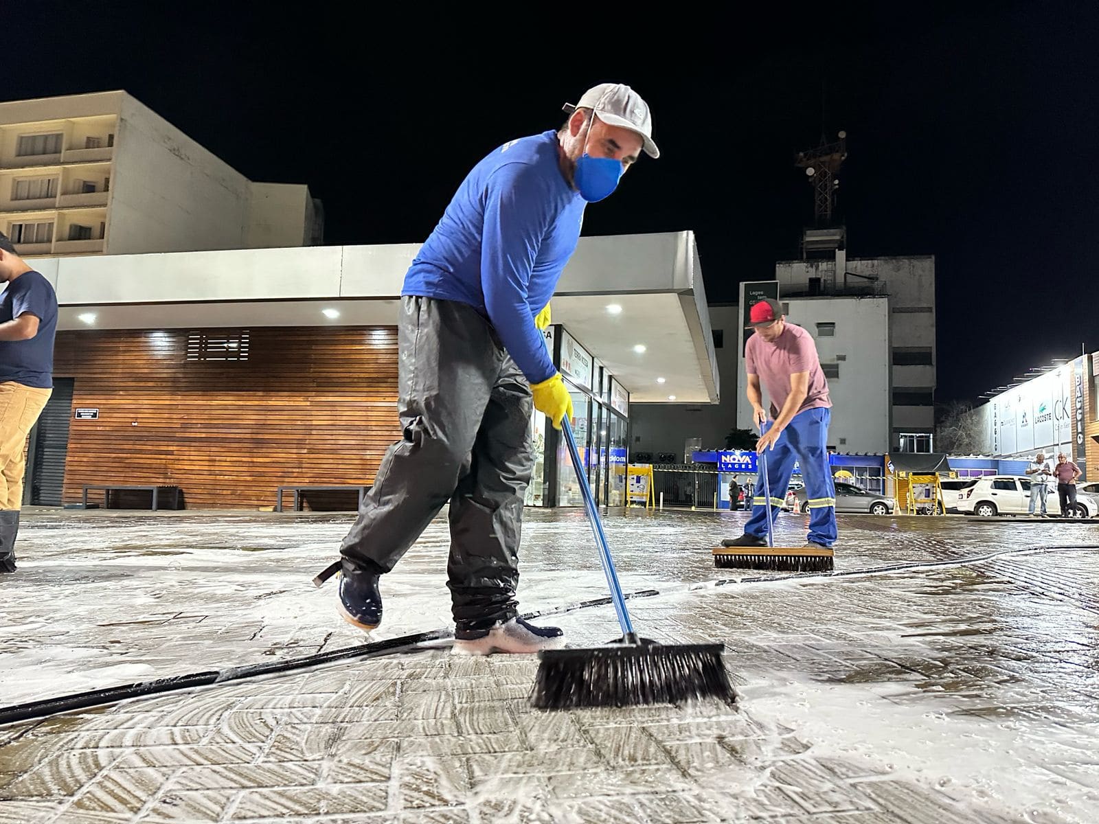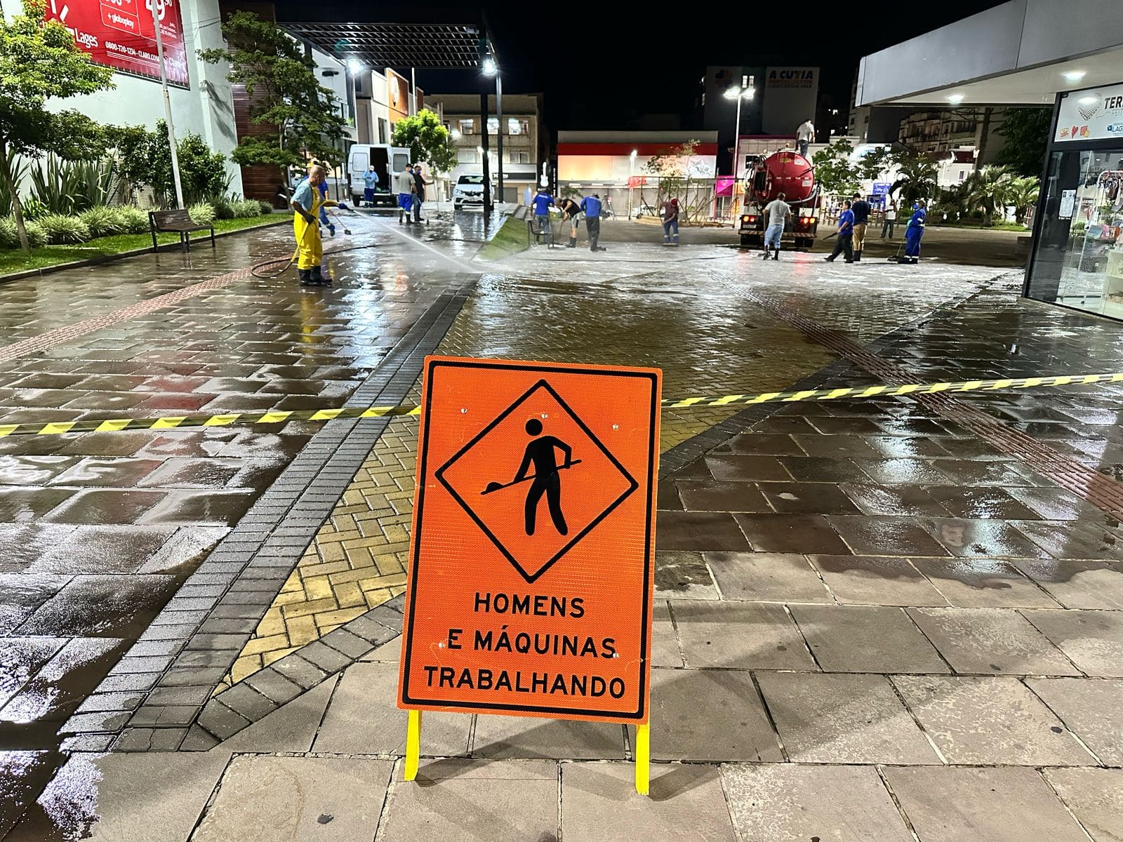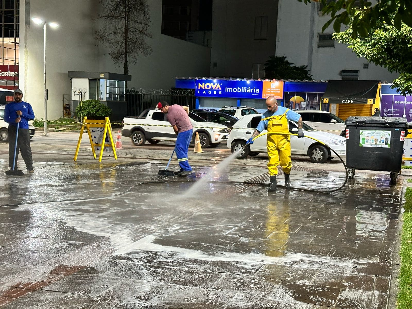 A Prefeitura de Lages, por meio da Secretaria de Serviços Públicos, realizou na noite de terça-feira (1º de abril) uma ação de higienização intensiva no Calçadão da Praça João Costa. O trabalho, que envolveu uma equipe de 15 servidores, foi feito no período noturno para evitar transtornos ao fluxo de pedestres durante o dia.