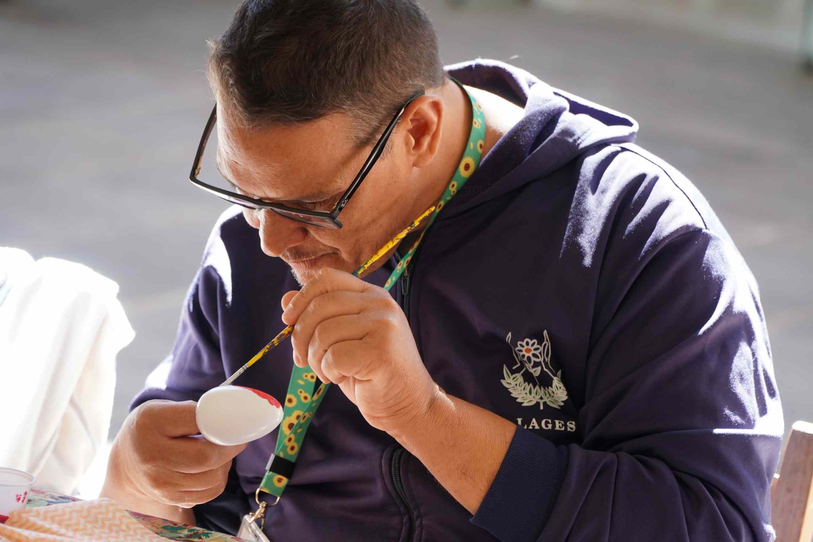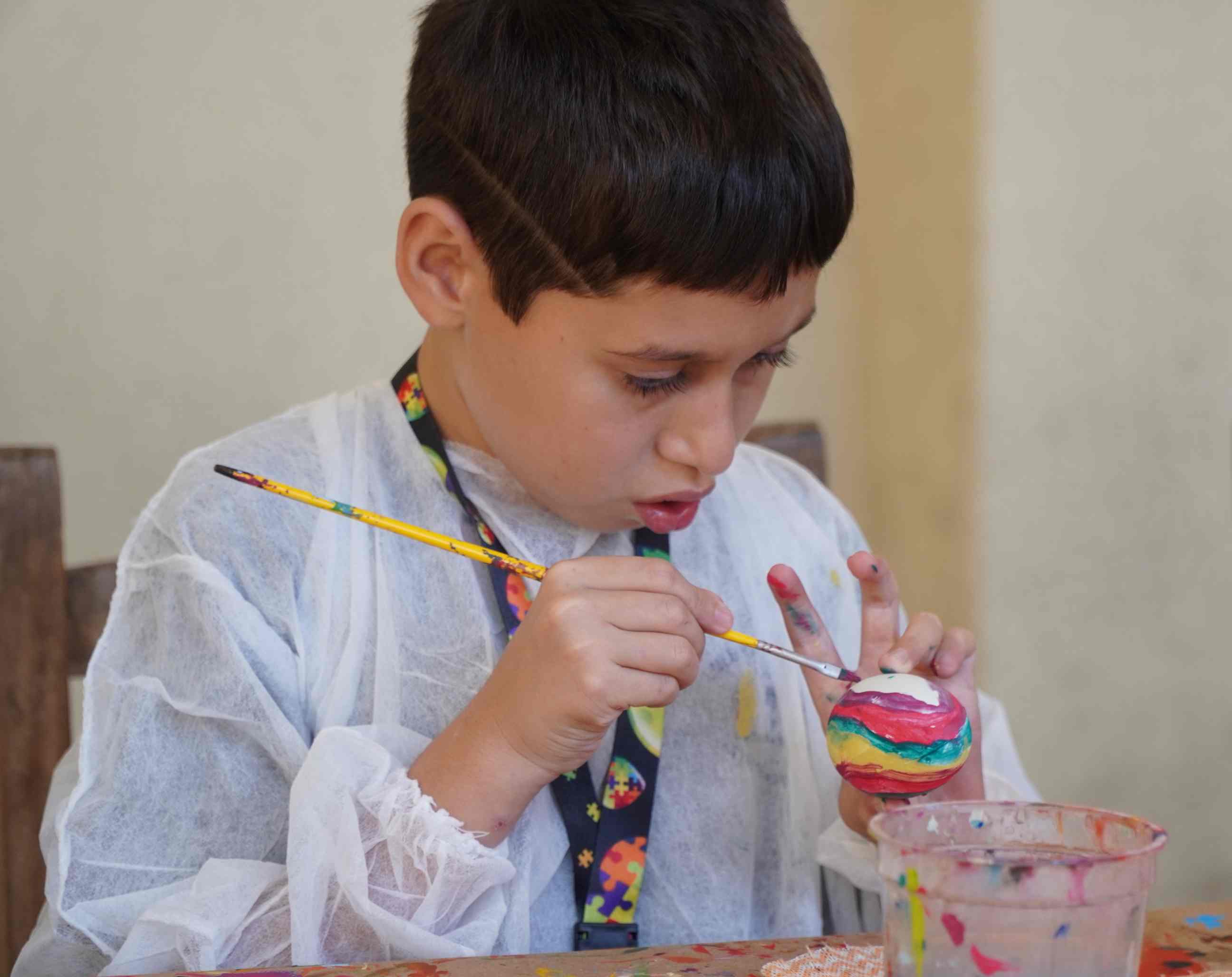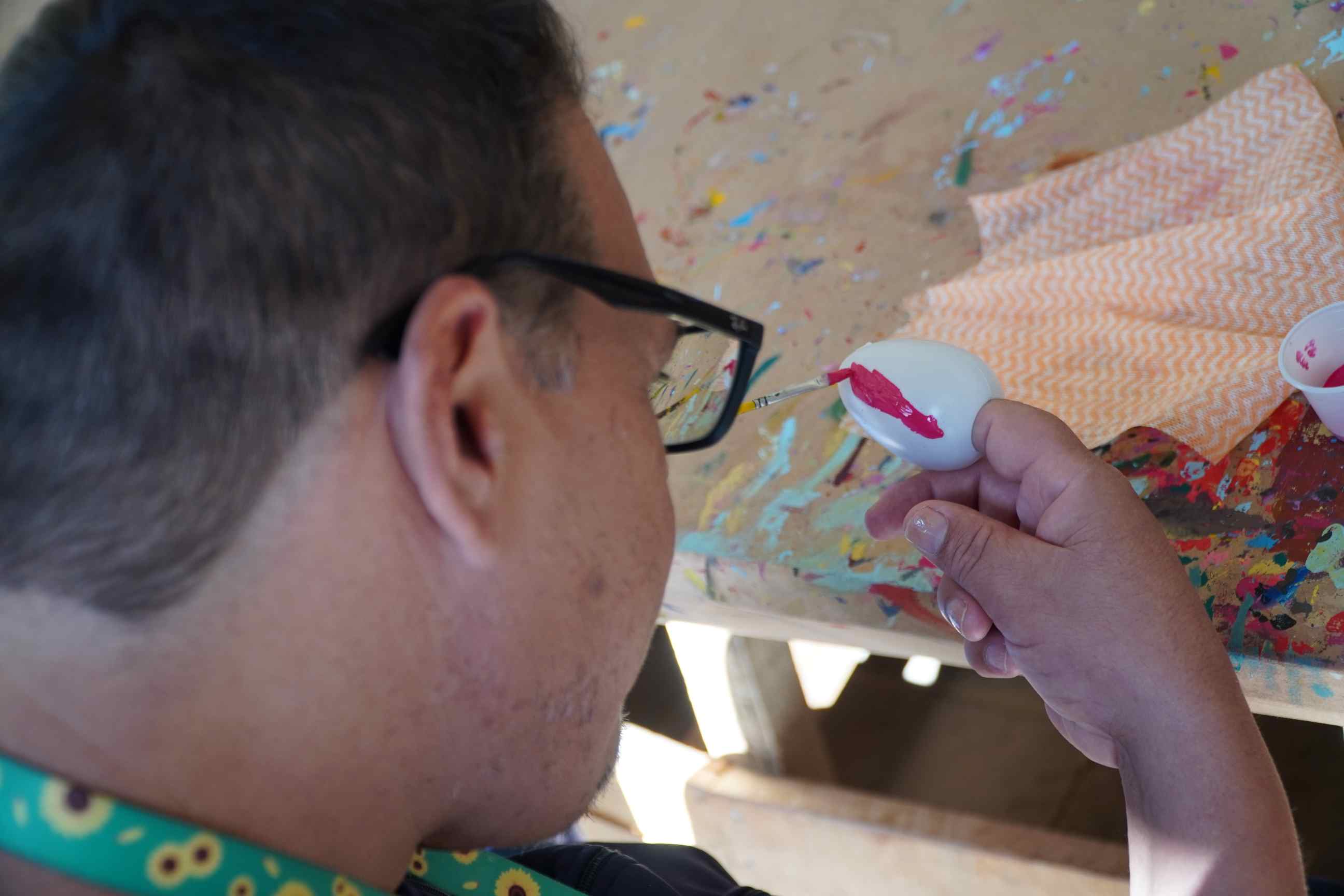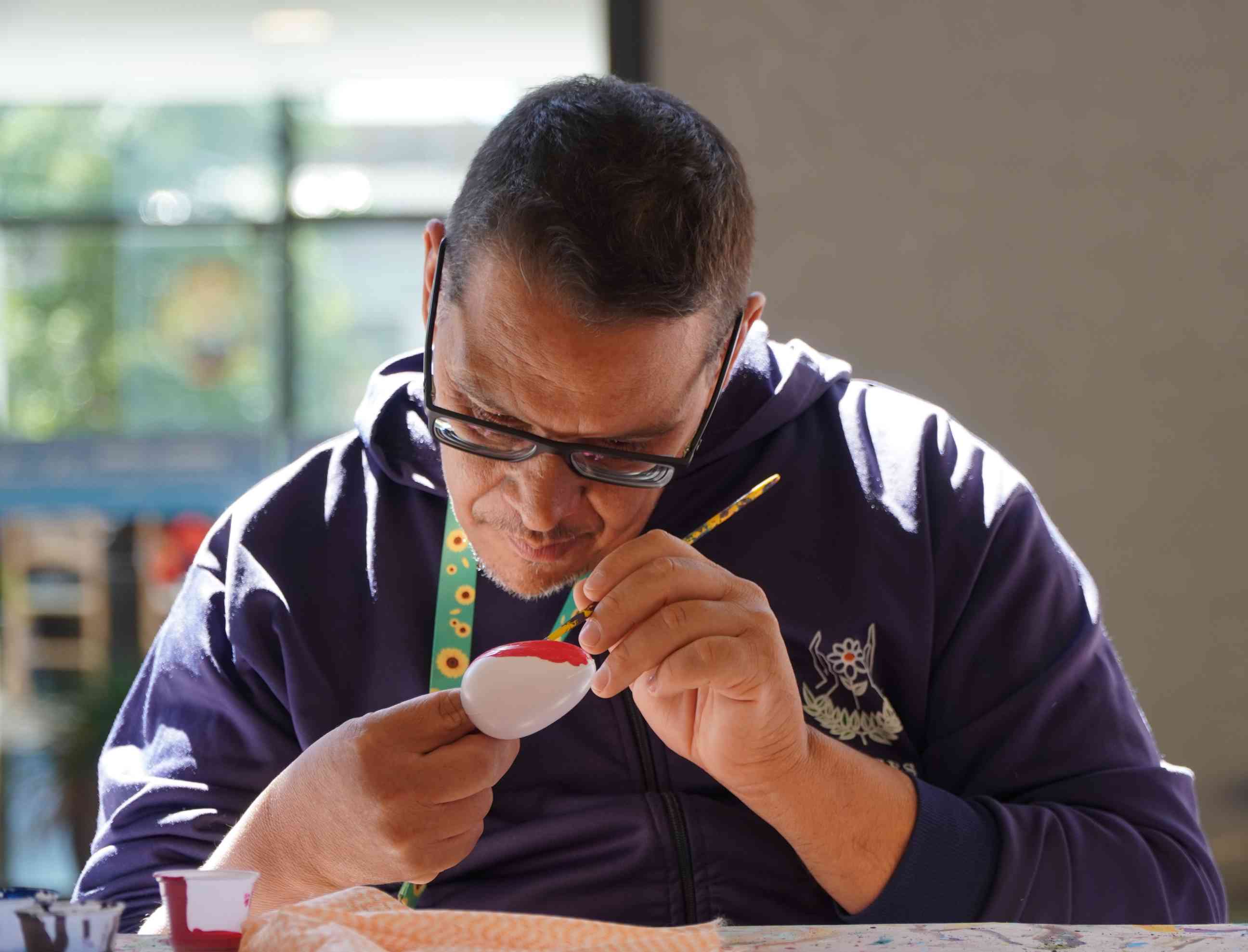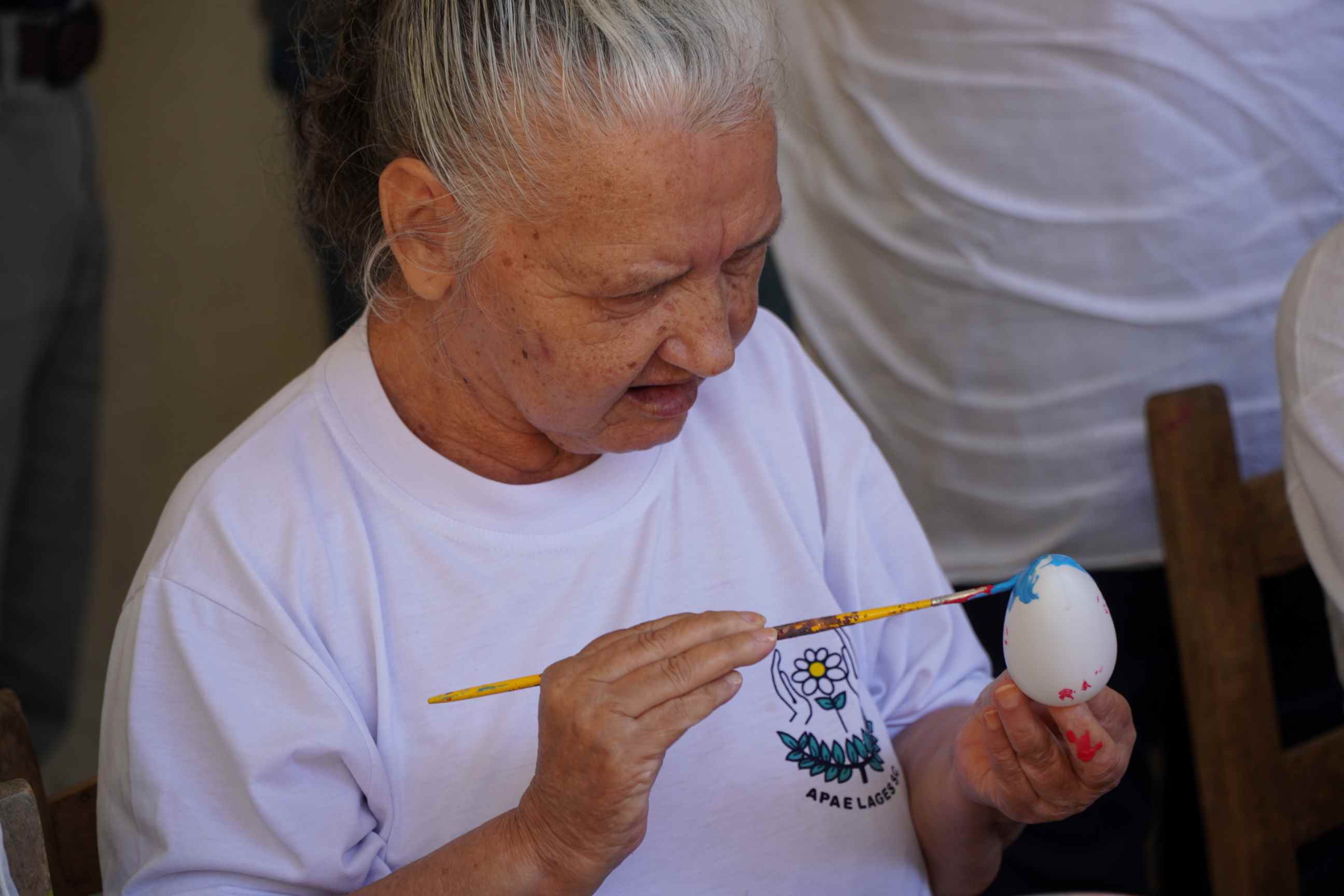Grupo de 15 alunos maduros e idosos da Apae atuam na pintura de ovos da Páscoa nesta sexta