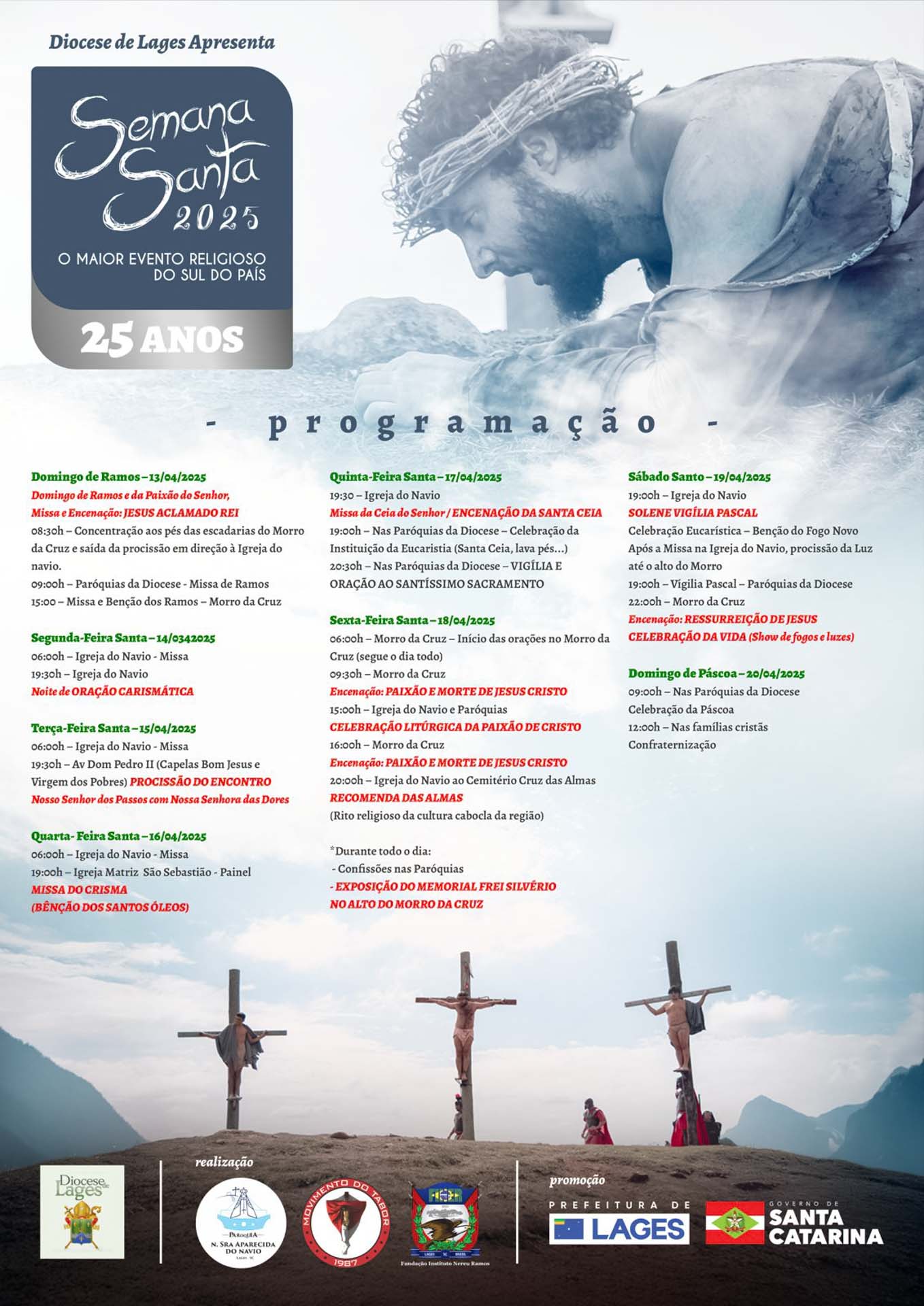 Este ano a Semana Santa de Lages, o maior evento religioso e maior espetáculo teatral religioso da região Sul do Brasil, completa 25 anos. Possuirá oito dias de programação, iniciando pelo Domingo de Ramos, em 13 de abril, passando pelos dias 14, 15, 16, 17, Sexta-feira Santa (18), Sábado Santo - de Aleluia (19) e Domingo de Páscoa (20).