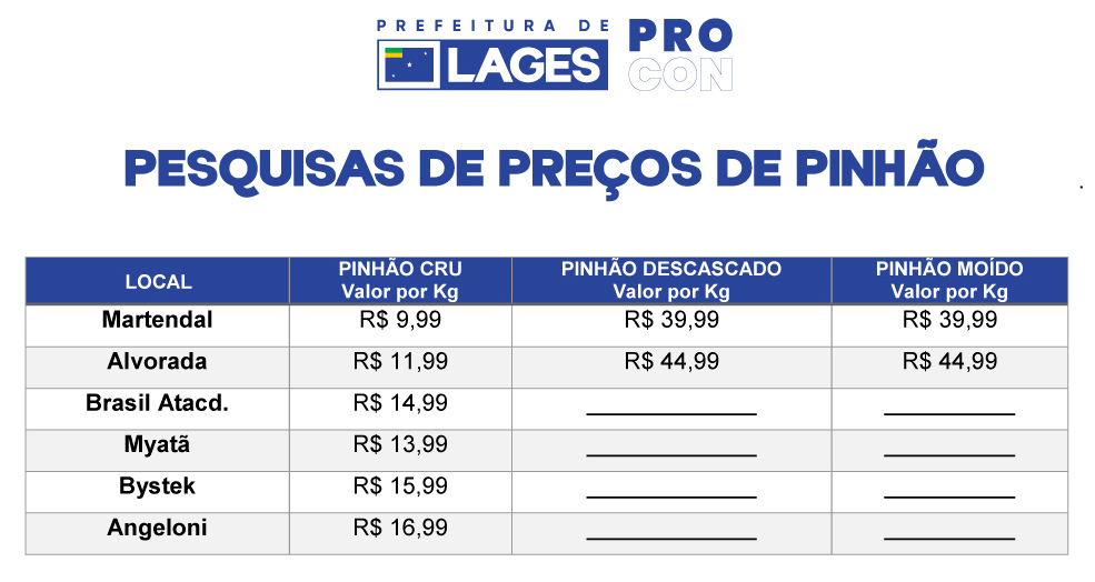Em alguns supermercados o consumidor também consegue encontrar o pinhão já cozido, descascado e até mesmo moído. Nestes dois casos, os valores ficam entre R$ 39,99/kg e R$ 44,99/kg. “O pinhão é importante para nosso povo, ótimo para inúmeros pratos e, como sabemos que o lageano já está se preparando para comer o tradicional entrevero ou a típica paçoca de pinhão, os dados dessa pesquisa contribuem para a melhor escolha na hora da compra”, explica Kevin.