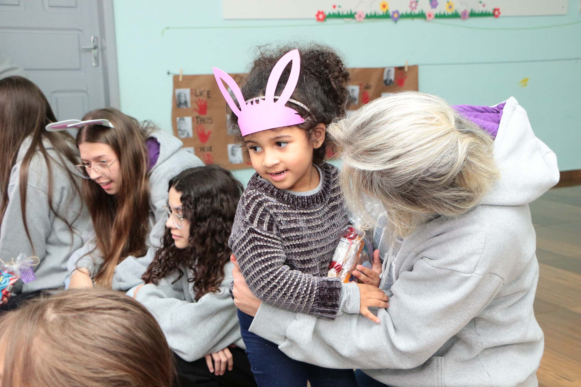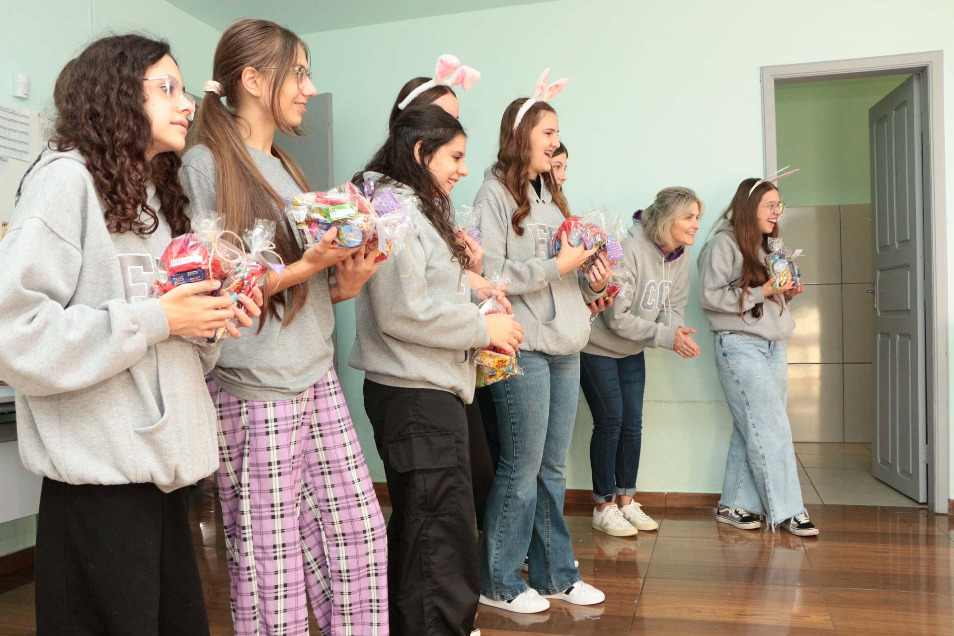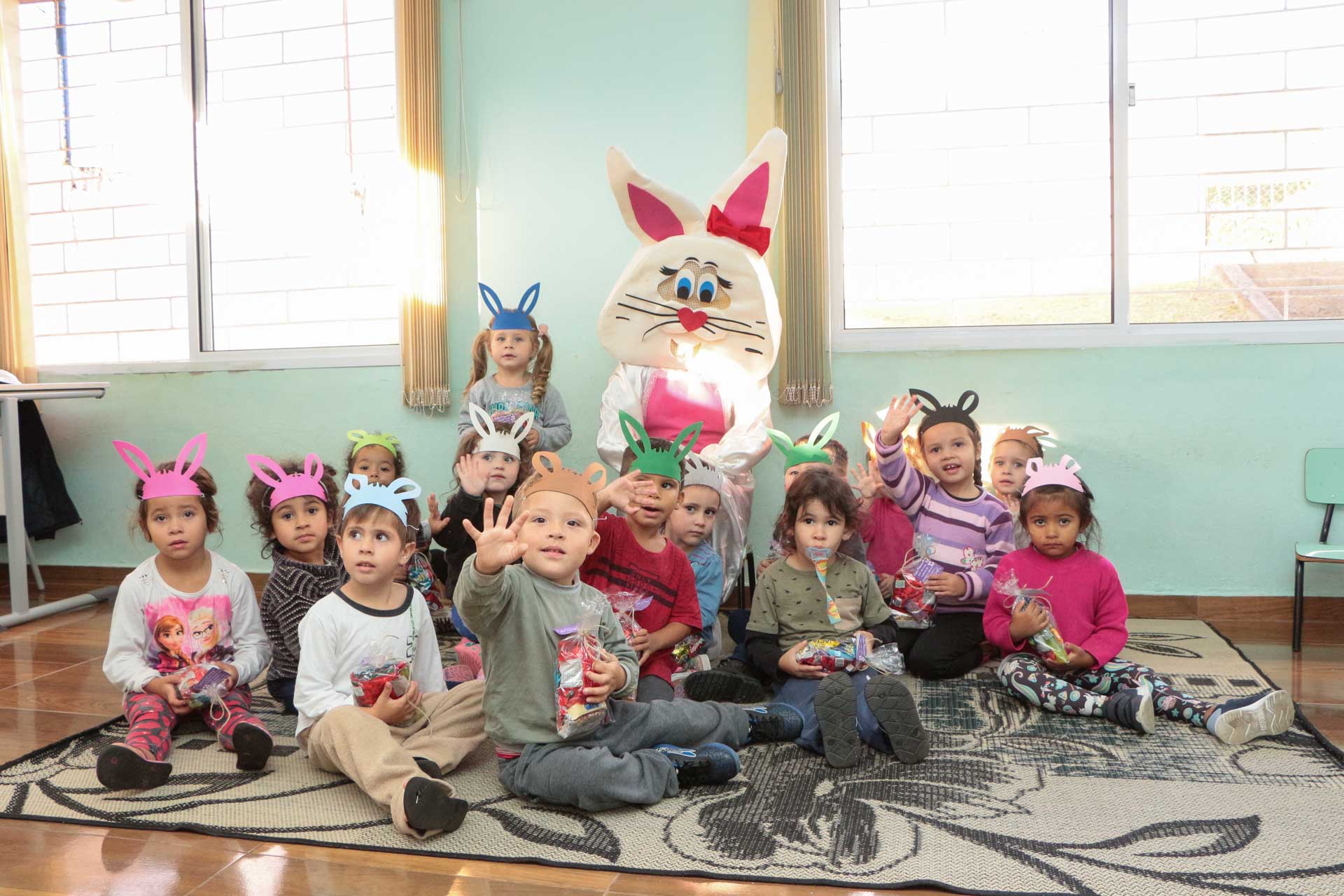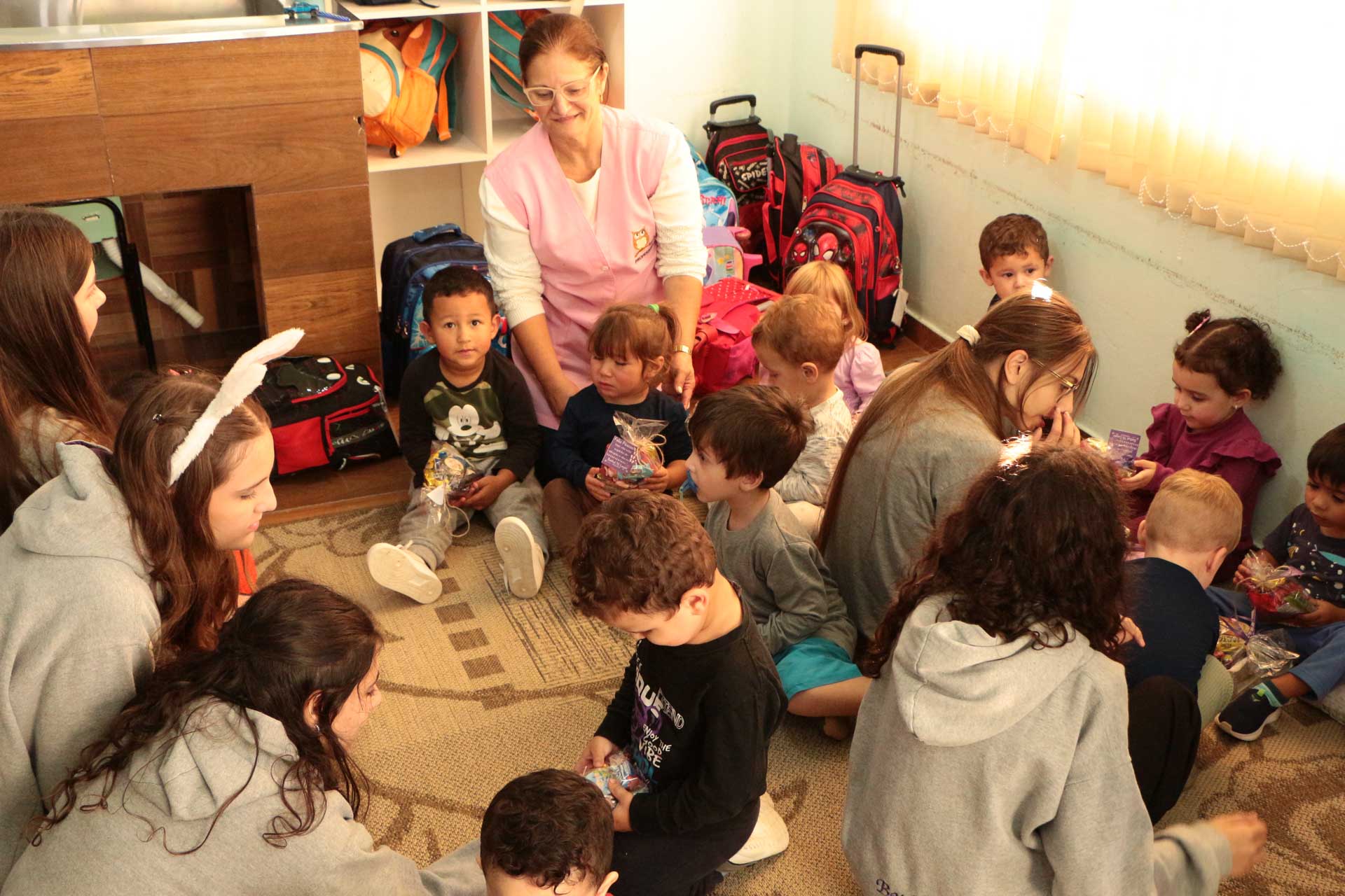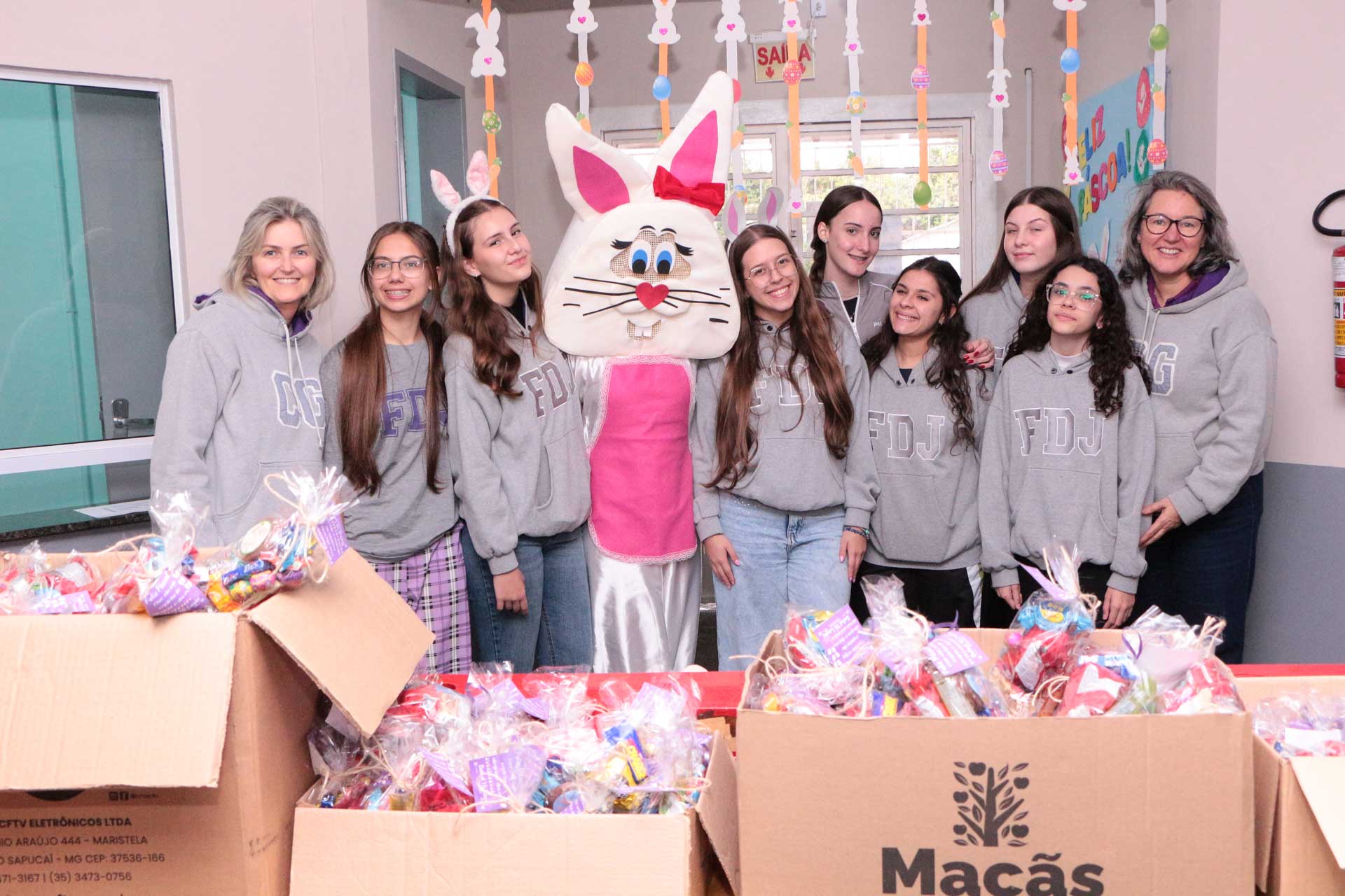 São muitas as instituições e empresas do município que desenvolvem ações beneficentes em parceria com as unidades de ensino. No caso do Ceim Vivaldino Silva Lourenço, em parceria com o grupo de meninas, Filhas de Jó, foram confeccionadas cestinhas de Páscoa, repletas de chocolates, guloseimas e as bolachas feitas pelas próprias crianças. Nesta semana, as meninas do grupo, acompanhadas do coelhinho da Páscoa, entregaram as cestinhas nas salas de aula do Ceim. A alegria e encanto das crianças era visível.