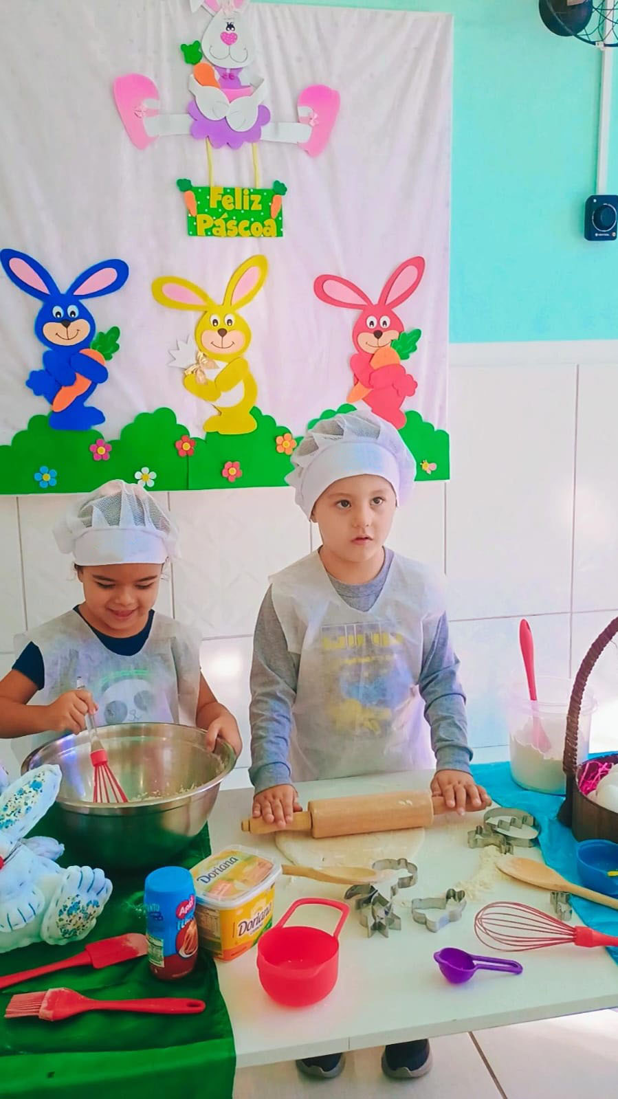 No Centro de Educação Infantil Municipal (Ceim) Vivaldino Silva Lourenço, no bairro Promorar, o espírito da Páscoa contagiou direção, professores, colaboradores e crianças. Com o auxílio de professores e cozinheiras, as crianças produziram bolachas de Páscoa, que foram degustadas em um café da manhã especial e divididas entre colegas e familiares.