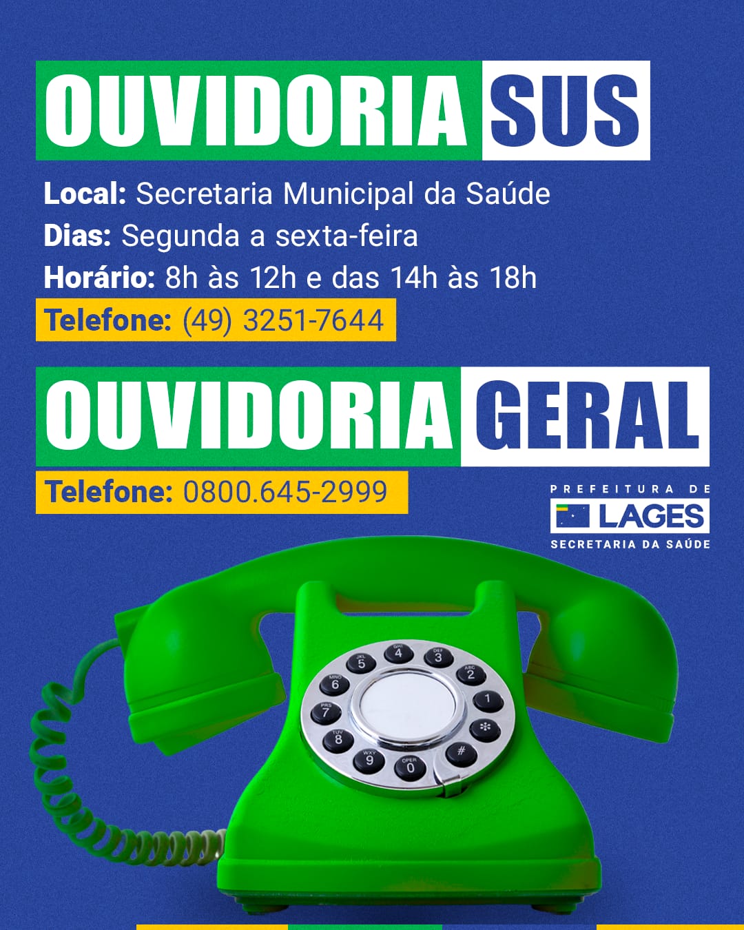 A Secretaria da Saúde de Lages aderiu ao Sistema Ouvidor SUS, coordenado e implementado pela Ouvidoria-Geral do Sistema Único da Saúde, do Ministério da Saúde (MS), em parceria com o Departamento de Informática do Sistema Único de Saúde (DataSUS). Como intuito, oferecer uma plataforma web gratuita aos Estados e municípios e aos seus órgãos e entidades vinculadas a fim de que possam instituir seus canais de recebimento, análise e resposta às manifestações dos usuários de serviços públicos no âmbito do SUS.