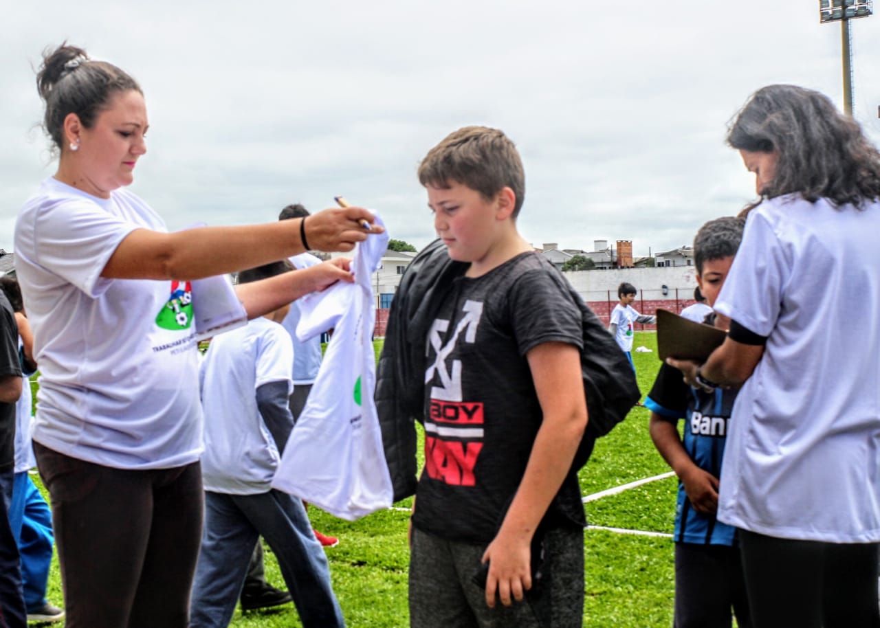 Um total de 645 camisetas foram adquiridas com recursos provenientes do Programa de Erradicação do Trabalho Infantil (PETI) e distribuídas aos 12 núcleos do Lages Leãozinho. “Neste dia de integração esportiva, destaca-se a parceria firmada entre o PETI e o Lages Leãozinho, com a entrega de camisetas, uma forma de incentivar o esporte e da prevenção do trabalho infantil”, fala a coordenadora do PETI em Lages, Mariana Coelho.