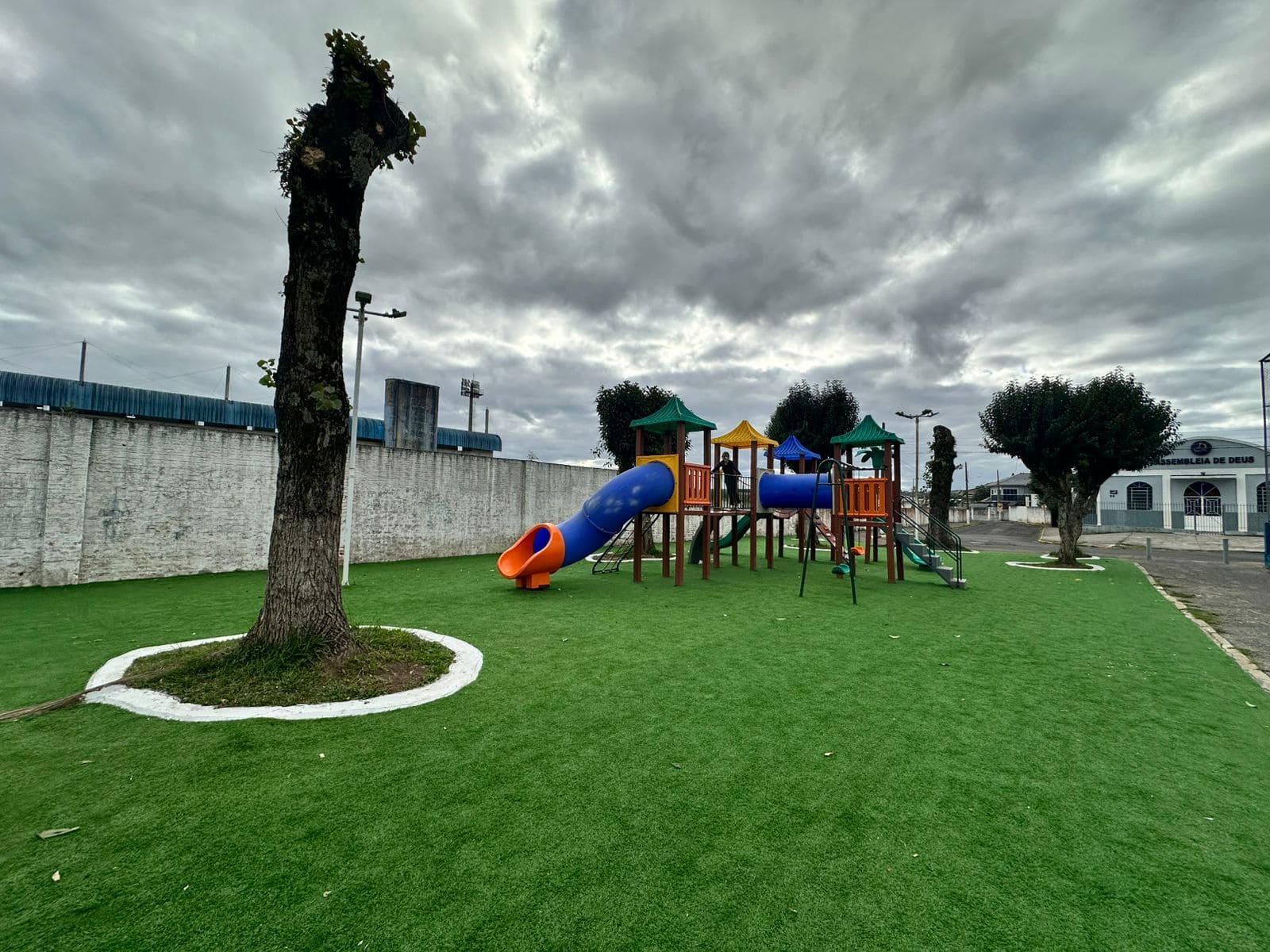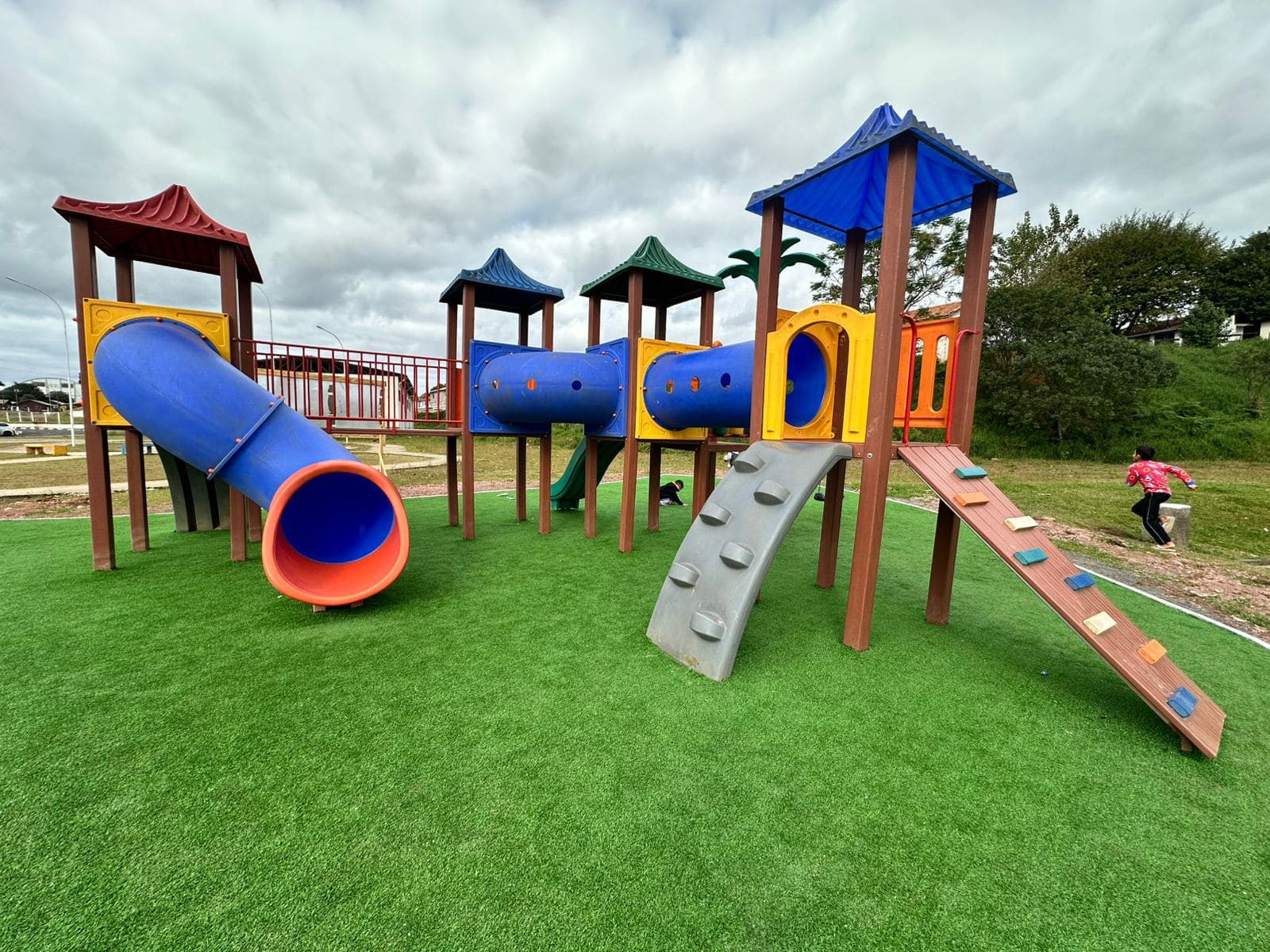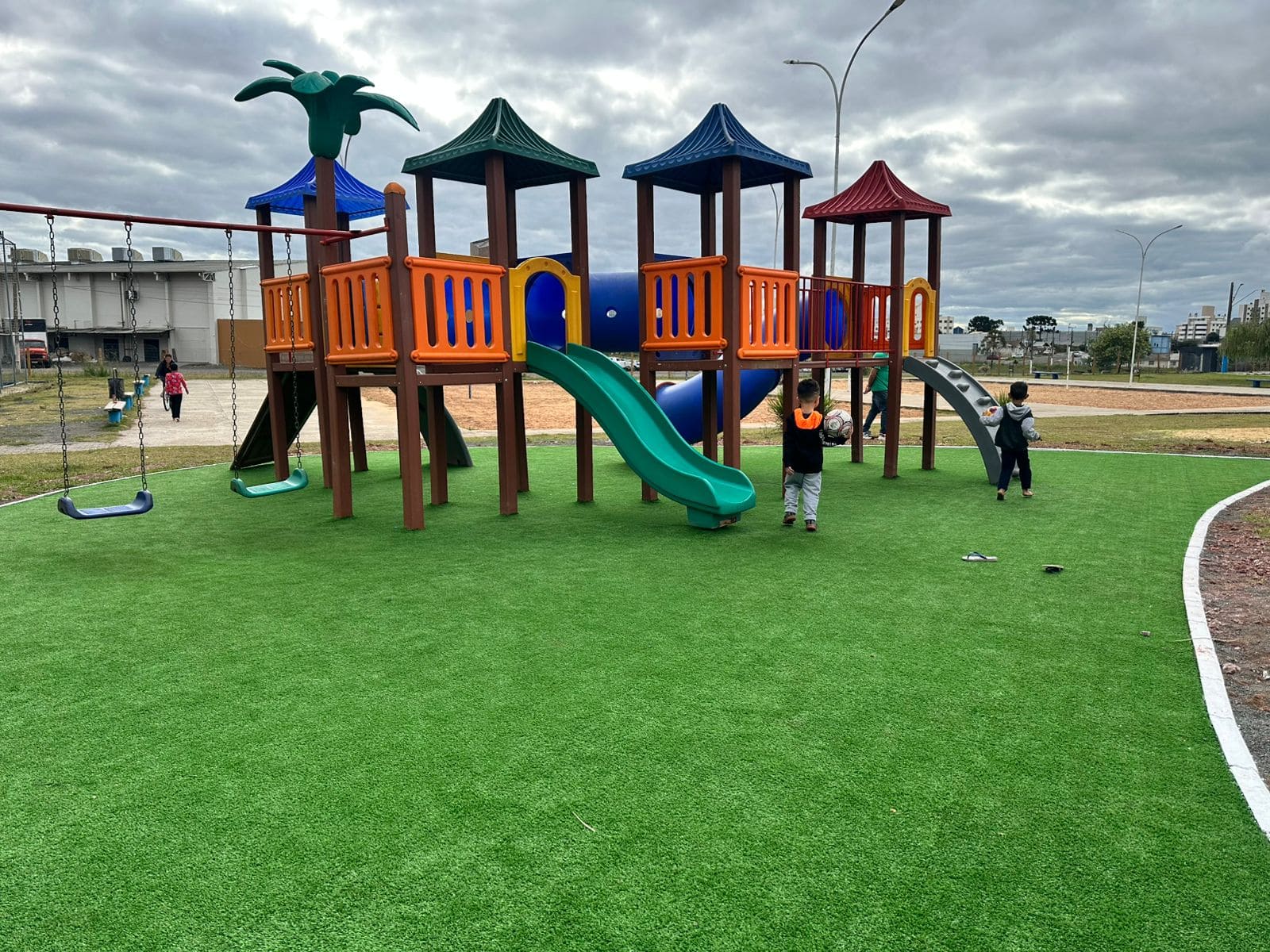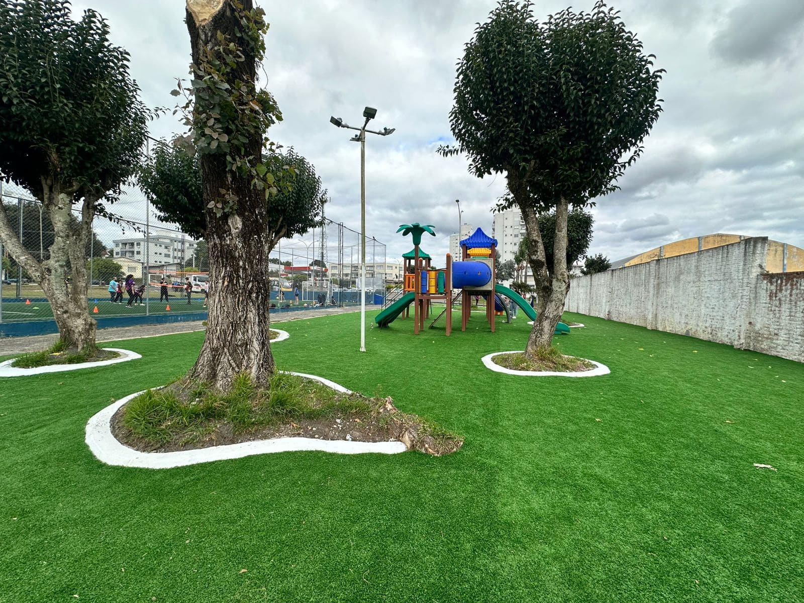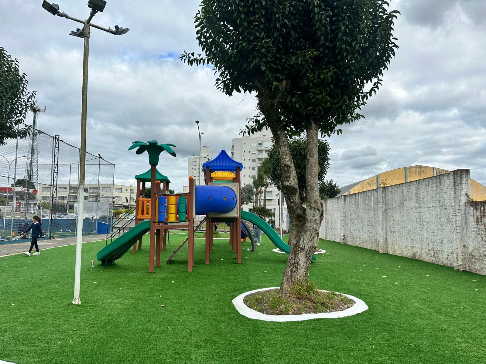 Instalação de grama sintética é concluída em parquinhos infantis de Lages