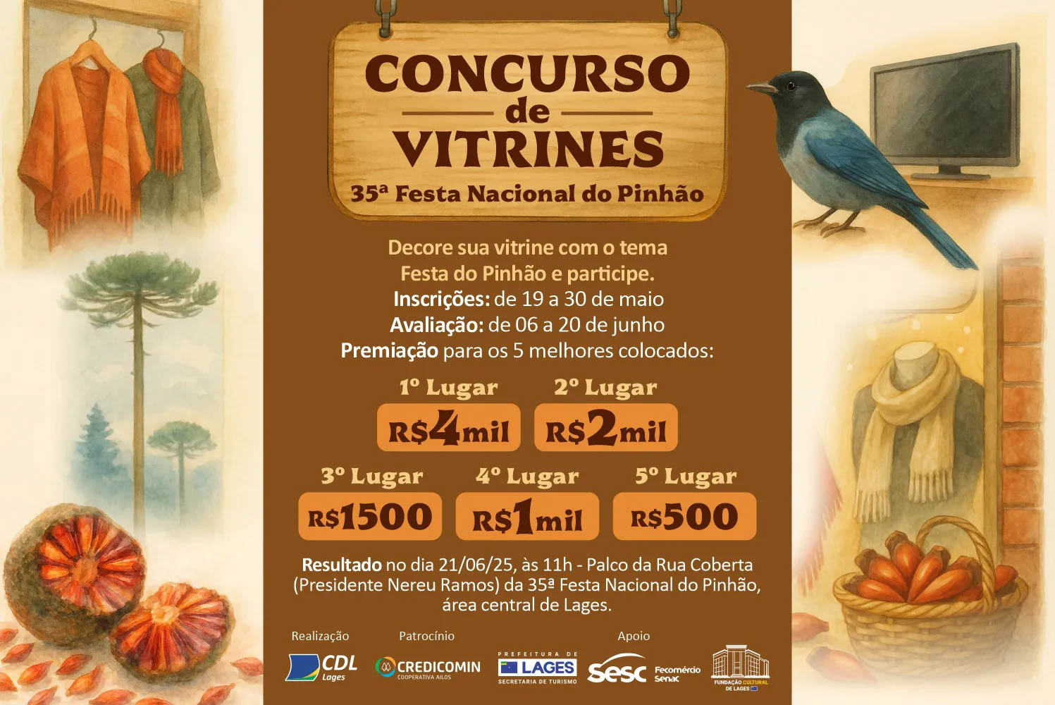 O comércio de Lages terá um papel ainda mais ativo na 35ª Festa Nacional do Pinhão. A Câmara de Dirigentes Lojistas (CDL), com apoio da Prefeitura de Lages, por meio da Secretaria de Turismo, Fundação Cultural de Lages, Sesc e patrocínio da Credicomin, lançou o Concurso de Vitrines, integrando o setor comercial com a festa. O objetivo da ação é valorizar o envolvimento cultural e visual do comércio local com a Festa do Pinhão, atraindo a atenção de moradores e turistas que passam pelo comércio da cidade durante o evento. A competição é aberta a todas as empresas associadas à CDL Lages.