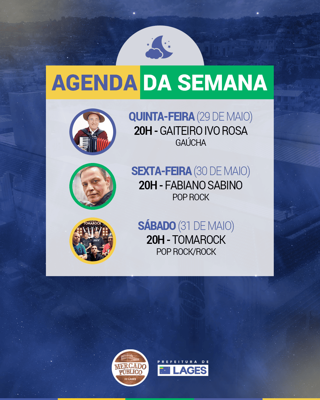 A programação iniciará às 20h, com o show do gaiteiro Ivo Rosa, que leva ao público um repertório marcado pela tradição da música gaúcha. O artista deseja resgatar a essência do Sul com canções que remetem à identidade regional e à cultura campeira.