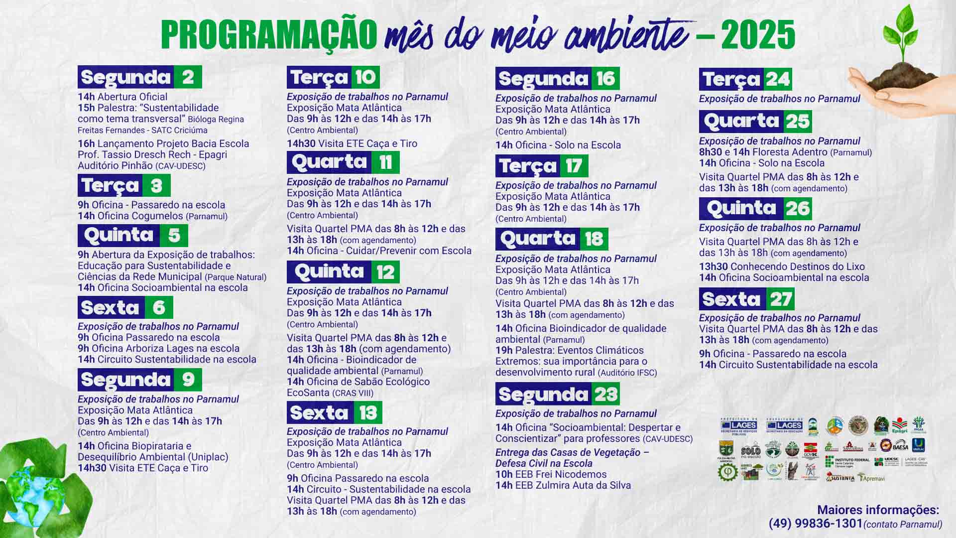 A Secretaria de Serviços Públicos e o Parque Natural Municipal João Jose Teodoro da Costa Neto, promovem junto com seus parceiros, mais de 25 instituições e projetos, uma programação especial alusiva ao Dia Mundial do Meio Ambiente, celebrado no dia 5 de junho. Será um mês de atividades voltadas à conscientização, preservação e educação ambiental, que atenderá toda a comunidade, incluindo crianças e estudantes.