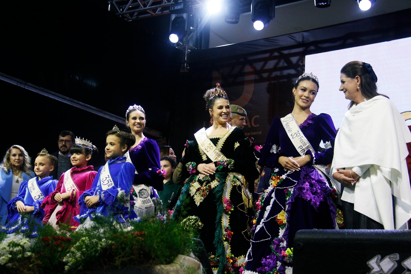 Elas também ganharam um vestido de gala para estarem a altura do momento tão especial, representando a cultura e história de Lages. Também com tecido em veludo, o vestido da rainha é cor-de-rosa e as princesas ostentam um tom de azul royal, com saia volumosa e muitos bordados que rementem à araucária e aos campos de Lages.