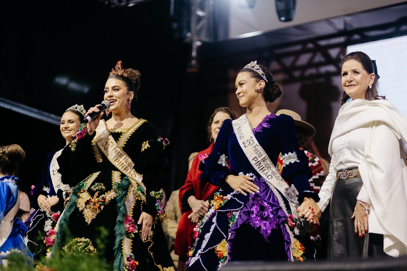 Assim que subiram ao palco do Recanto, a rainha Amanda Bianchini e princesas, Lariane Rodrigues e Alice Cunha Ramos revelaram os trajes de gala da realeza da 35ª Festa Nacional do Pinhão. Com a assinatura da empresa lageana La Unica Ateliê, os vestidos trazem uma homenagem especial às mulheres lageanas. Idealizado pela estilista Ana Lopes, em parceria com a Rádio Clube de Lages, neste ano a confecção dos trajes teve caráter voltado a uma ação social para enaltecer a força da mulher lageana.