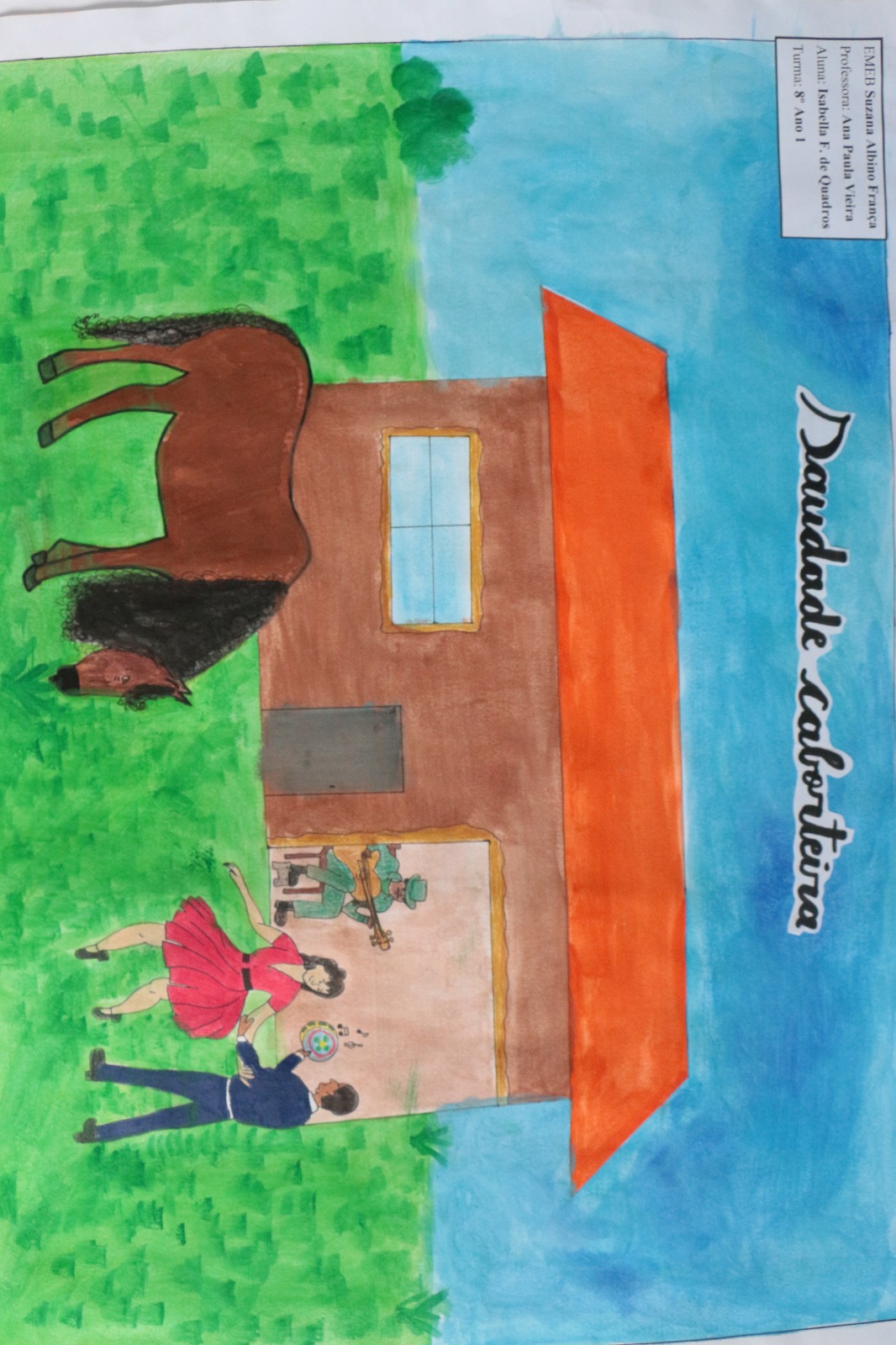 Mais de 60 trabalhos foram entregues à equipe organizadora do Festival e, a partir da noite desta sexta-feira (6), estarão expostos no telão do palco do Recanto durante as apresentações os artistas, bem como no salão da Secretaria de Turismo, atrás do palco. De acordo com Marcia Vieira, também da equipe da coordenação da Sapecada, a ideia inicial era levar o projeto para várias escolas. “Tínhamos pouco tempo para uma demanda grande de trabalho que seria produzida durante as aulas, então optamos em convidar uma escola do sistema municipal e outra da rede estadual. Deste modo, os professores de Língua Portuguesa trabalharam os temas com pesquisa das expressões regionalistas, fizeram também a interpretação dos textos e, a partir disso, passaram para a execução com as pinturas dos trabalhos nas aulas de Arte”, explica Marcia.