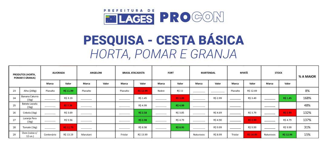 Foram analisados produtos de sete estabelecimentos diferentes em Lages: quatro supermercados e três atacadistas. Para os produtos da cesta básica, a variação de valores para o Açúcar Refinado (5kg), por exemplo, é de 35%, sendo R$ 16,99 para o mais barato e R$ 22,99 para o mais caro.
