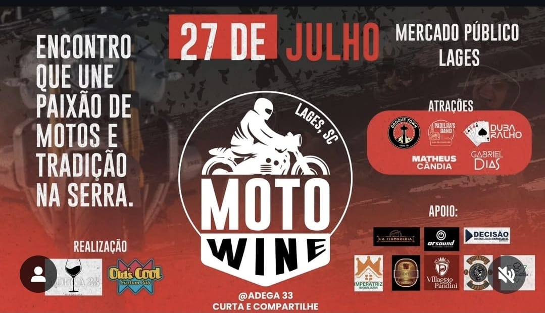 Por iniciativa do Box Adega 33, o próximo domingo (27 de julho) será marcado por um encontro que reúne a paixão por motos com o melhor da música, gastronomia e, claro, muito vinho. É a primeira edição do Moto Wine que trará muita adrenalina e tradição nas dependências do Mercado Público Municipal, em uma tarde de confraternização e comemoração ao Dia do Motociclista.