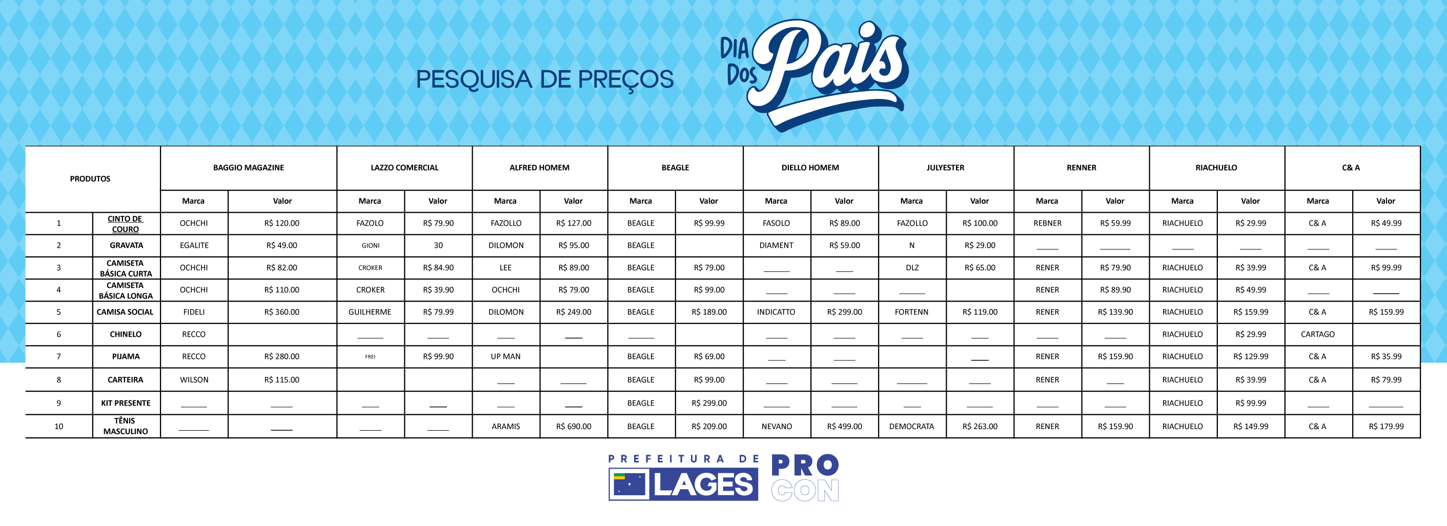 Uma pesquisa realizada pelo Procon de Lages nos dias que antecedem o Dia dos Pais, neste ano comemorado em 10 de agosto, apresenta variações significativas nos preços de itens de vestuário masculino, como camisas, chinelo, pijamas, cintos e gravatas. O estudo abrangeu nove estabelecimentos comerciais da cidade, incluindo redes de varejo e lojas de padrão mais elevado.