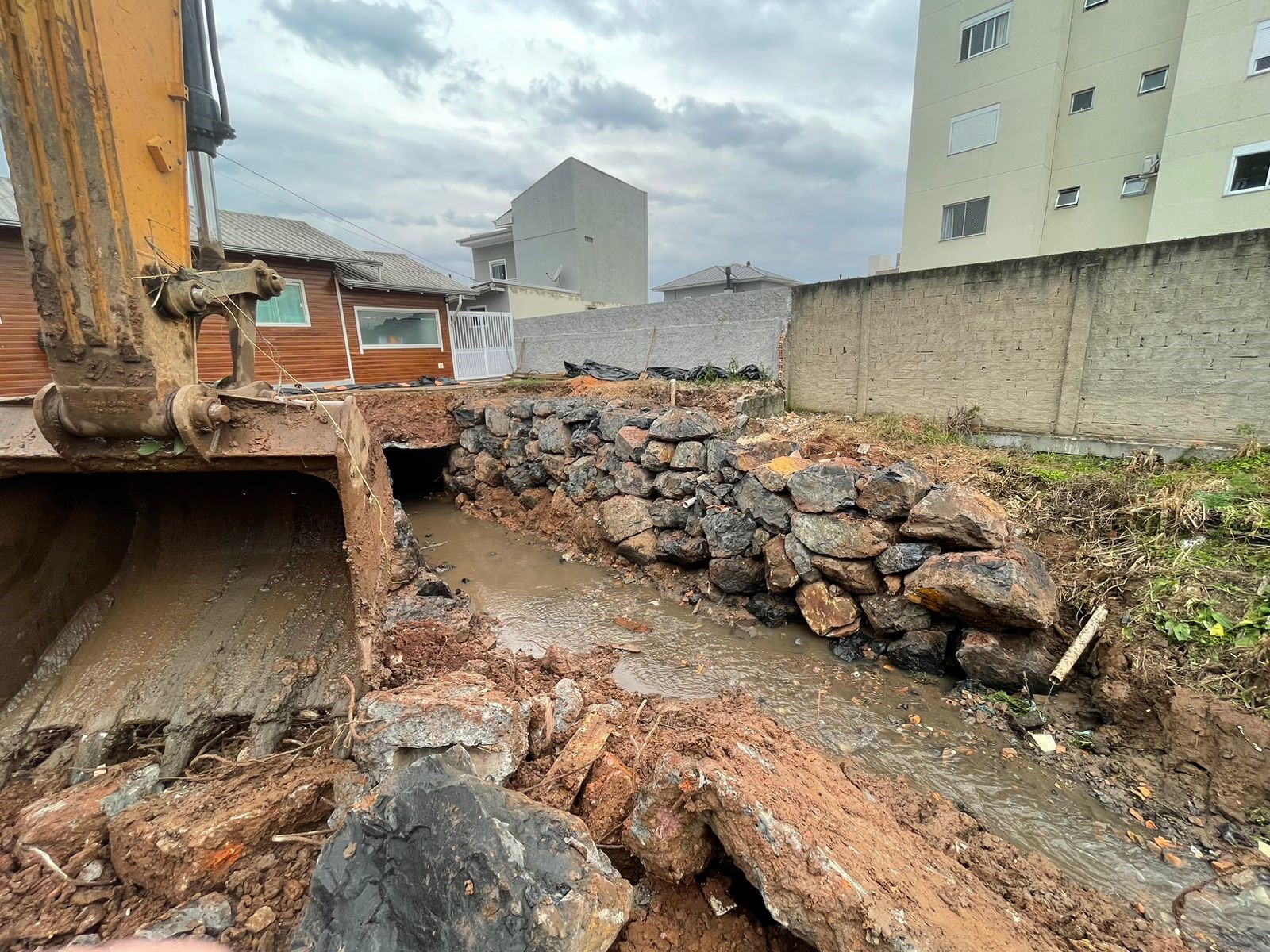 No caso do enrocamento de pedras, o material não é apenas descarregado, mas distribuído unitariamente, alternando entre o auxílio de máquinas e o trabalho manual das equipes operacionais, de modo a formar a devida contenção. Após finalizado, o serviço permite que o solo volte a se estabilizar e garante a devida segurança a moradores que passam diariamente pelas redondezas.
