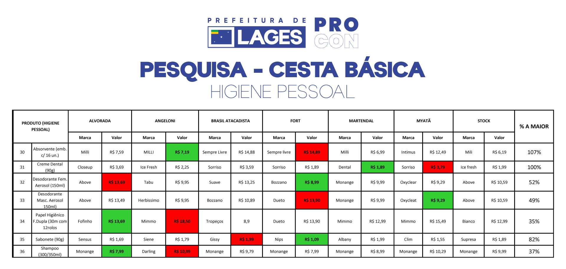 O doce de frutas e o creme dental foram os itens que mais apresentaram variações de preços nos locais pesquisados, chegando a respectivamente 132% e 100% de diferença entre um estabelecimento e outro. Importante considerar que os produtos não possuem a mesma marca.