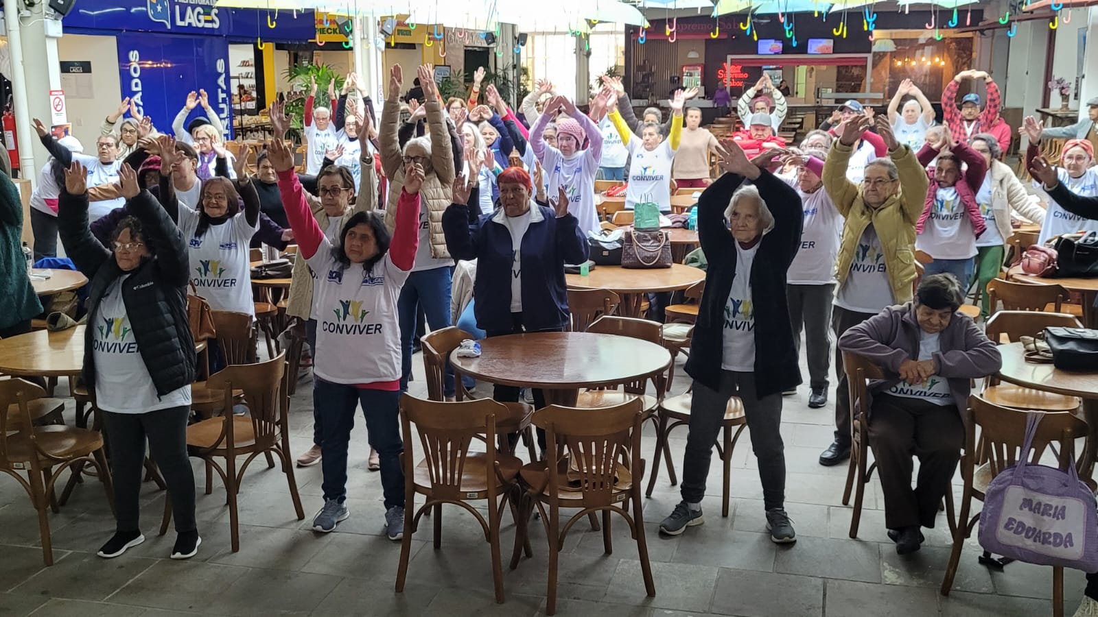 Os idosos do programa Conviver se reuniram para mais um aulão no Mercado Público Municipal Osvaldo Uncini, importante espaço explorado por diferentes frentes de atividades, na quinta-feira (30 de agosto). Neste aulão os idosos foram presenteados com a camiseta personalizada do projeto para uso na prática de atividades físicas no seu CRAS. O Programa Conviver tem como objetivo disseminar a importância da prática regular de exercícios físicos para a manutenção da qualidade de vida e da saúde.