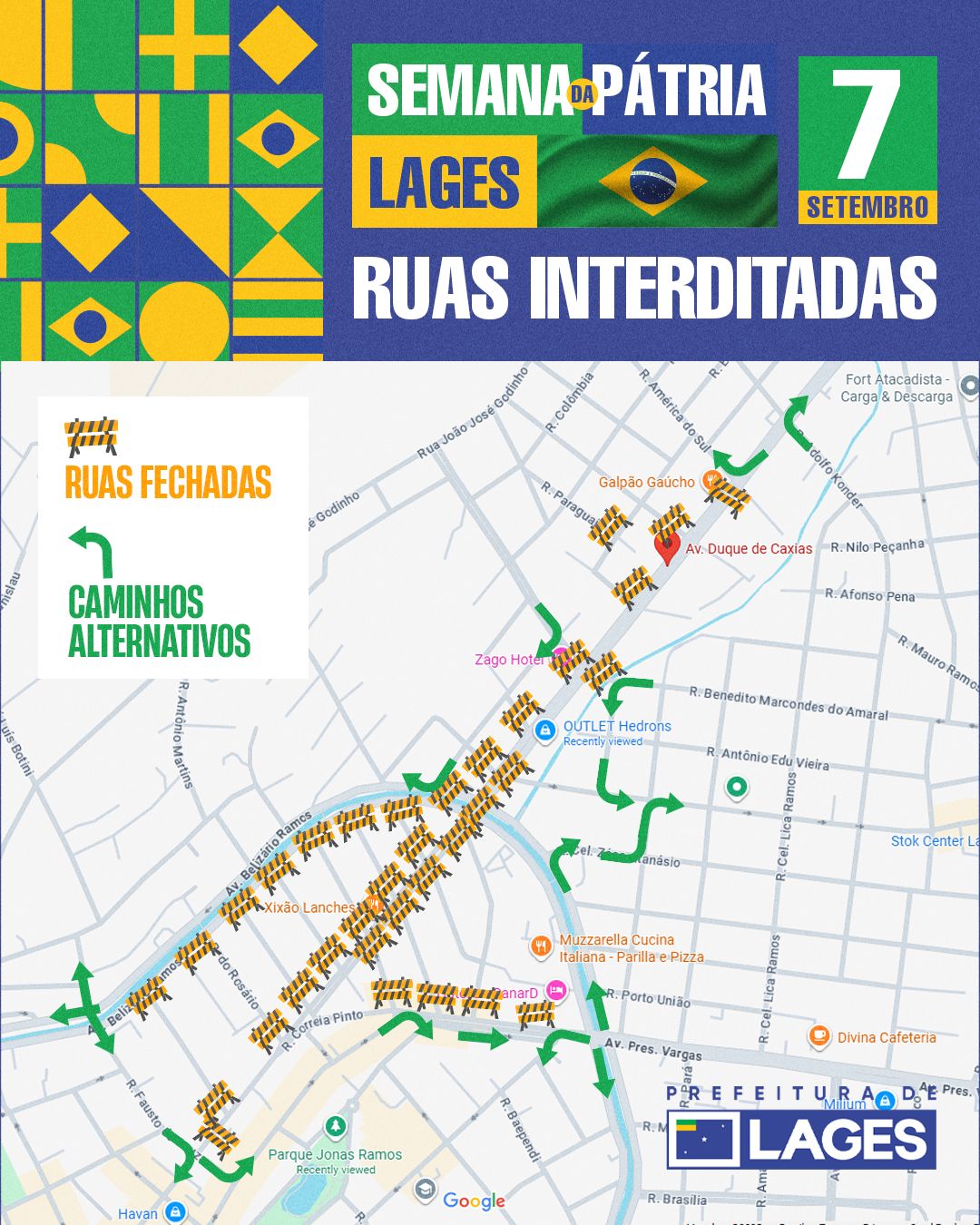 A Diretoria de Trânsito (Diretran) informa à comunidade que neste sábado (6 de setembro) a partir das 13h e no domingo (7), a partir das 7h, as avenidas Luiz de Camões e Duque de Caxias terão o trânsito interrompido, respectivamente, em razão dos desfiles cívicos que marcarão o encerramento da Semana da Pátria em Lages.