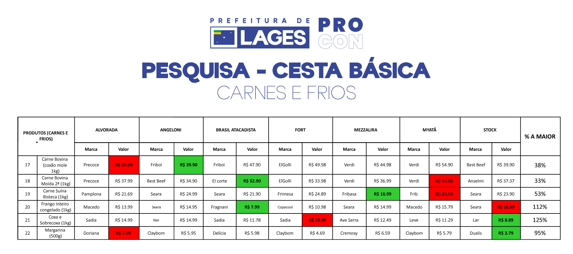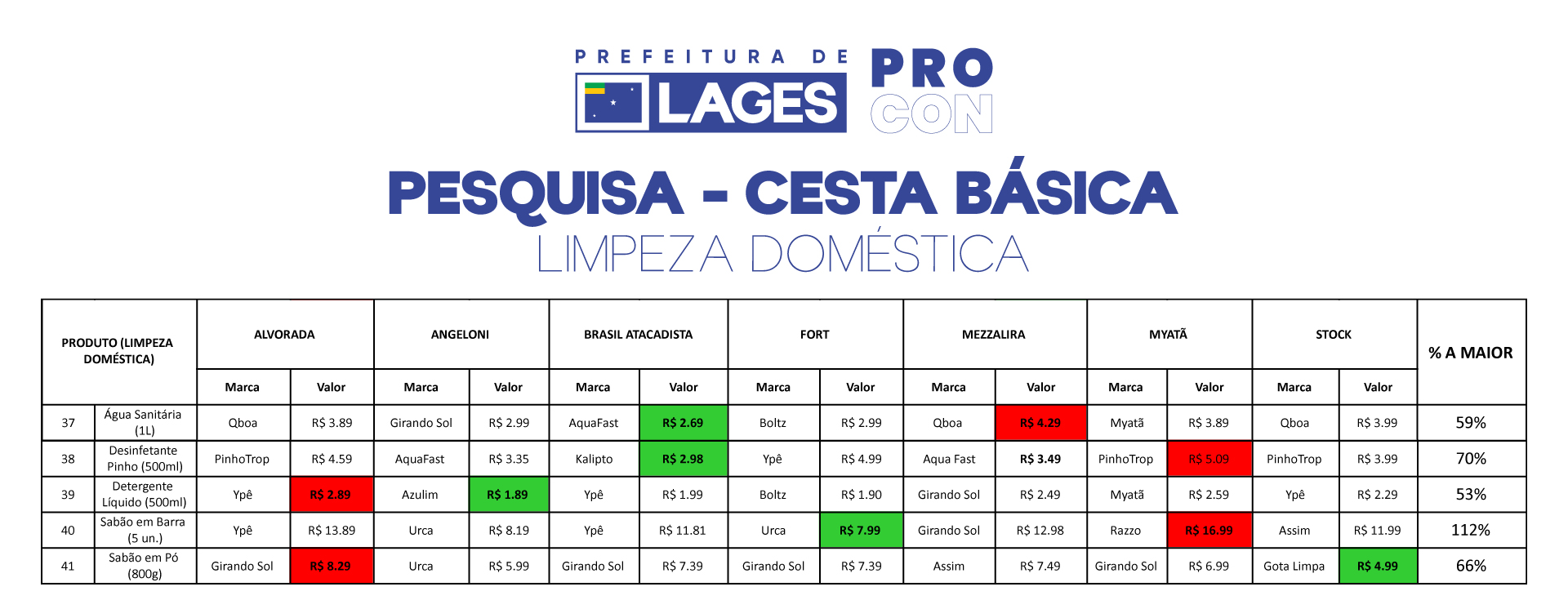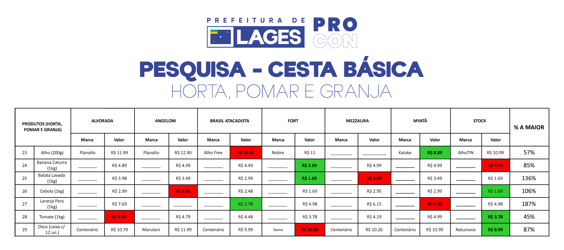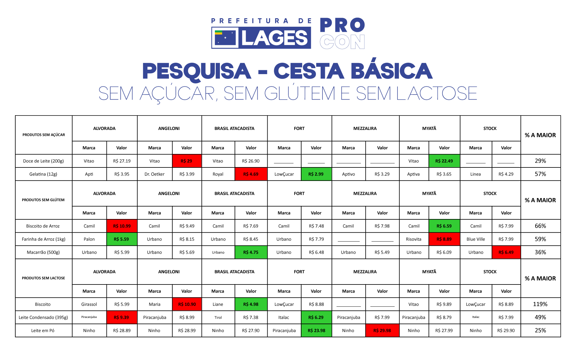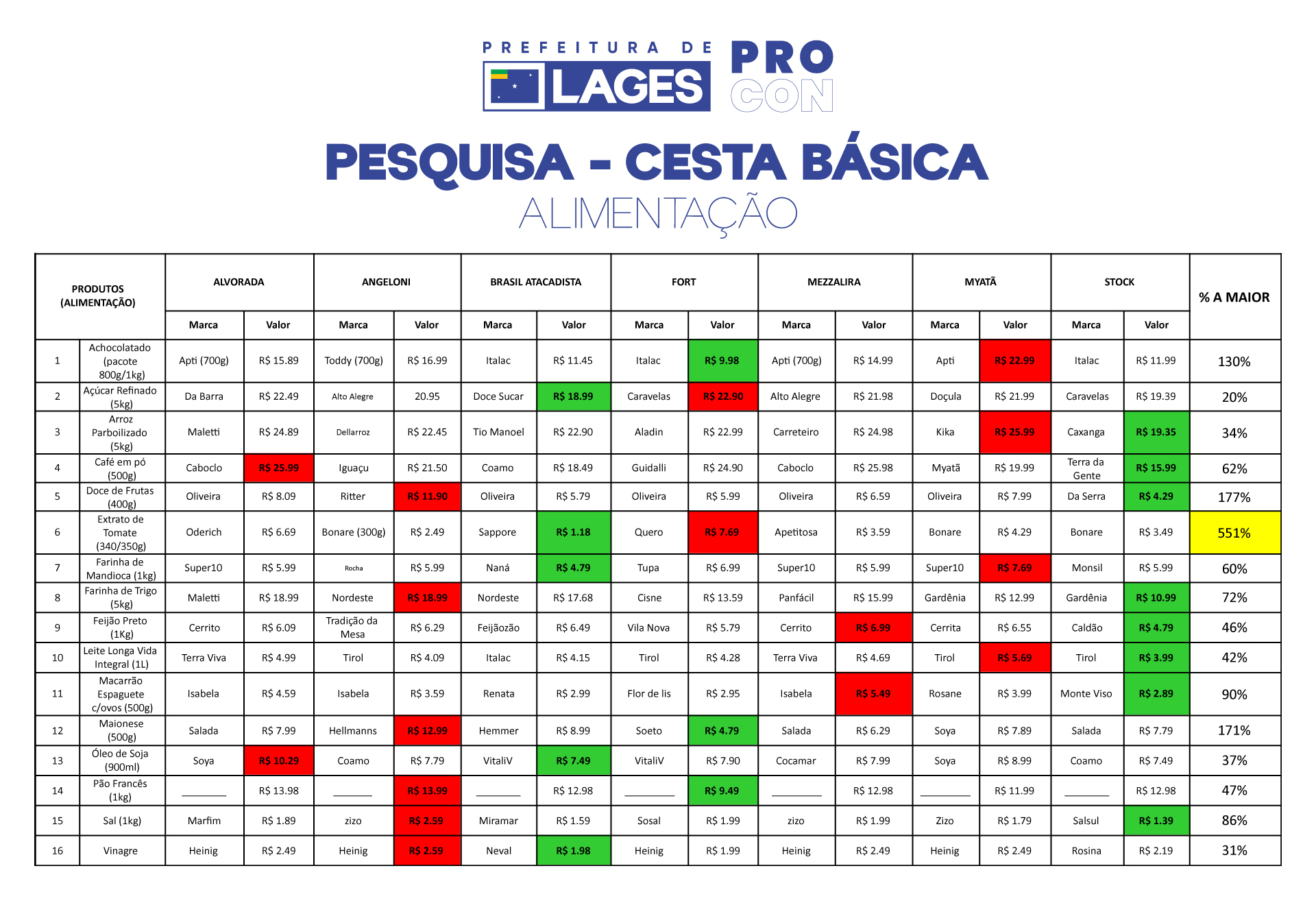 A pesquisa foi realizada em sete supermercados da cidade: Alvorada; Angeloni; Brasil Atacadista; Fort; Martendal; Myatã e Stock Center