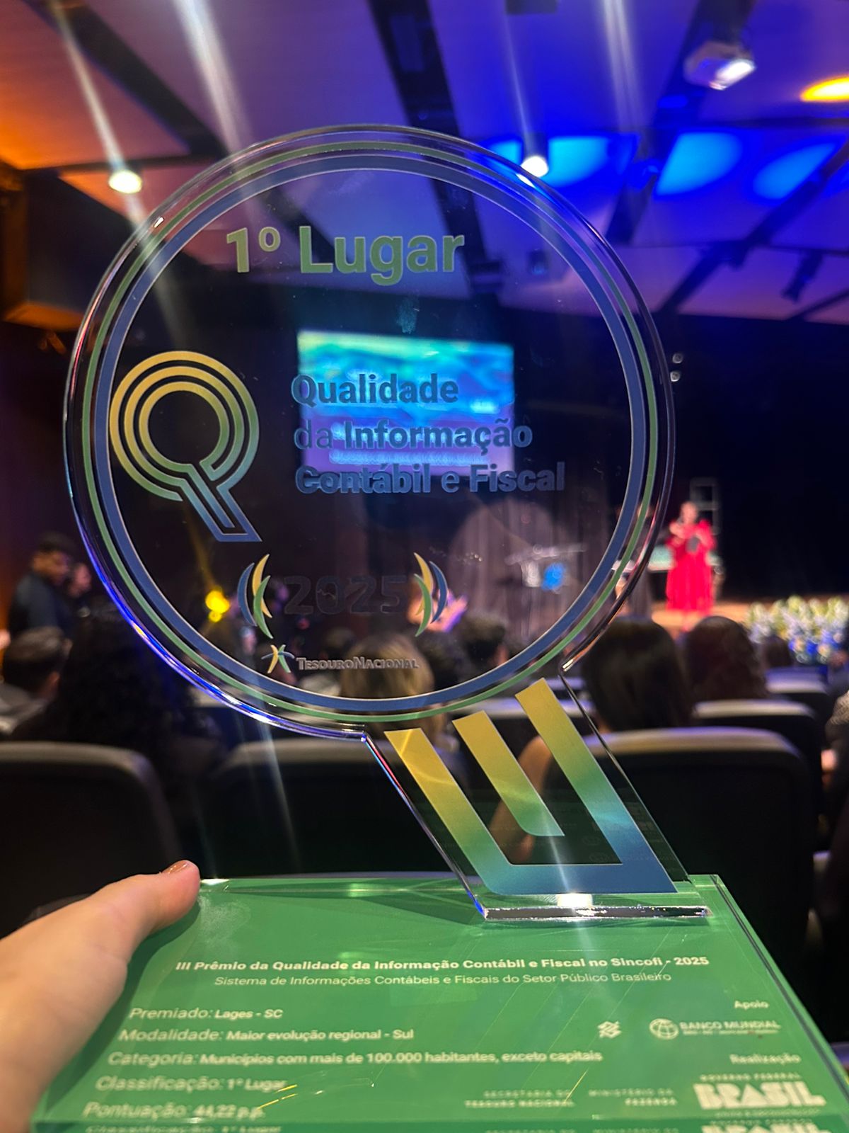 Lages foi classificada em 1º lugar na categoria Municípios com mais de 100 mil habitantes, exceto capitais, da modalidade Maior Evolução Regional - Sul, do III Prêmio de Qualidade da Informação Contábil e Fiscal no Sincofi - 2025 - Sistema de Informações Contábeis e Fiscais do Setor Público Brasileiro. Premiação pelo fortalecimento e responsabilidade com a gestão fiscal, demonstrando dados contábeis de forma fidedigna e consistente. Como pontuação, o município de Lages obteve um acréscimo de 44,22 p.p.