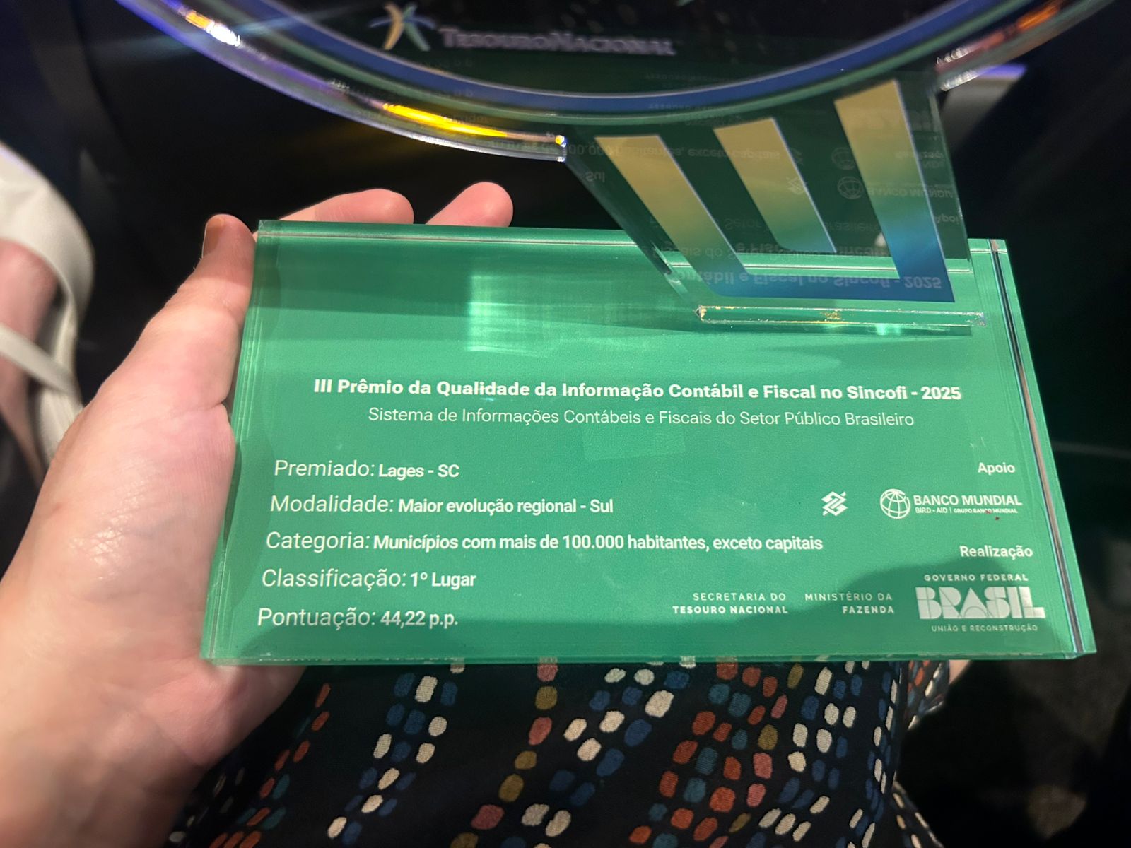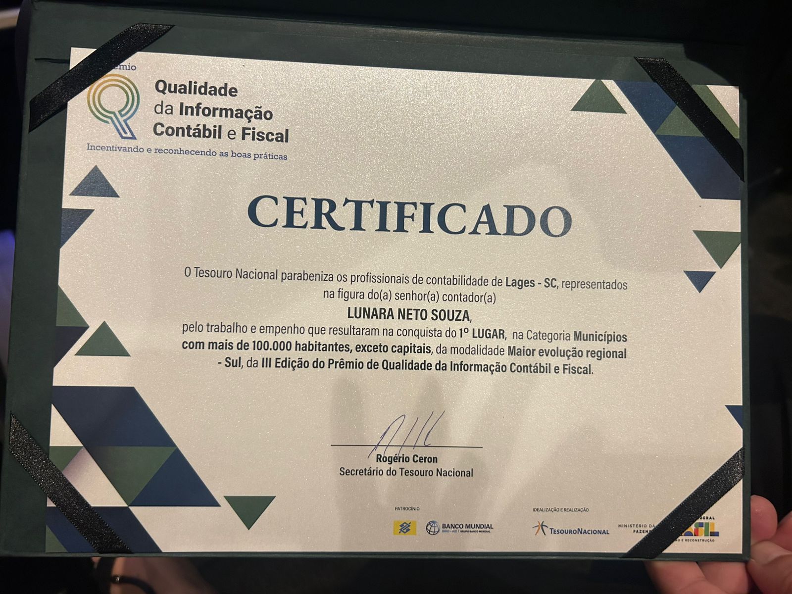 Em paralelo houve o recebimento do Certificado de congratulações do Tesouro Nacional, parabenizando os profissionais de contabilidade de Lages, representados na figura da contadora da Prefeitura, servidora pública, Lunara Neto Souza, pelo trabalho e empenho que resultaram na conquista do 1º lugar. Certificado assinado pelo secretário do Tesouro Nacional, Rogério Ceron.