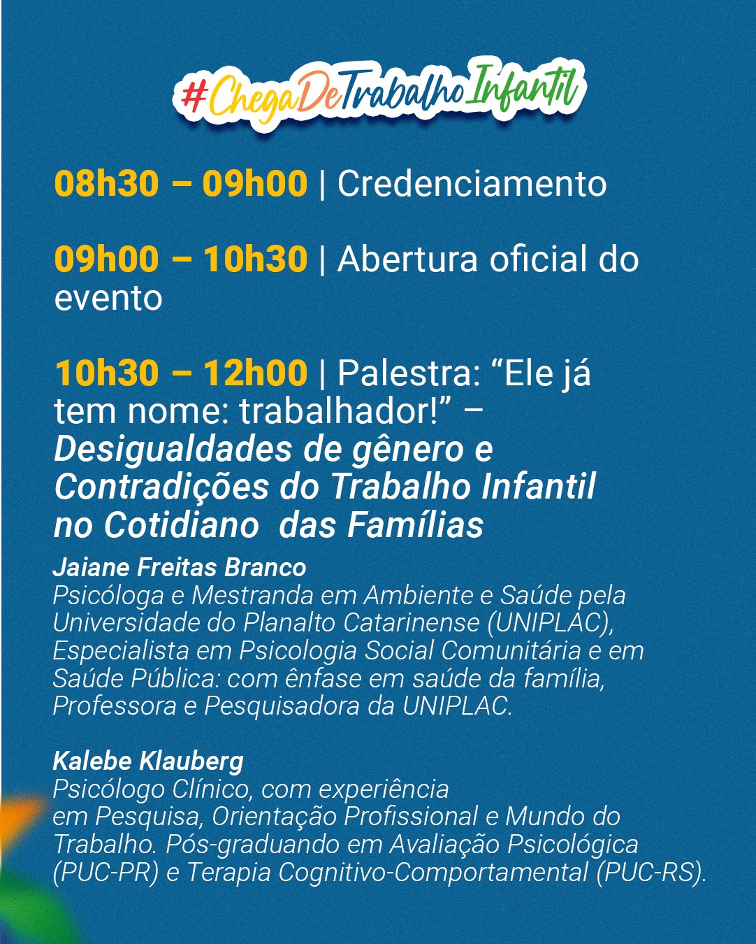 08h30min – 09h | Credenciamento 09h – 10h30min | Abertura oficial do evento 10h30min – 12h | Palestra: “Ele já tem nome: trabalhador! ” – Desigualdades de gênero e Contradições do Trabalho Infantil no Cotidiano das Famílias