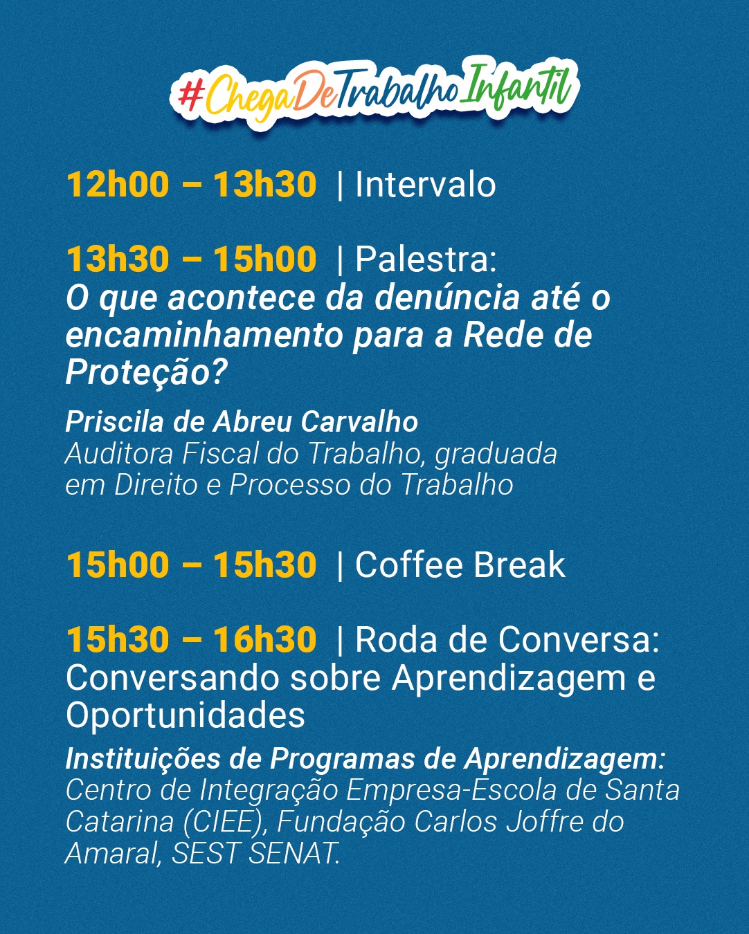 12h – 13h30min | Intervalo 13h30min – 15h | Palestra: O que acontece da denúncia até o encaminhamento para a Rede de Proteção?
