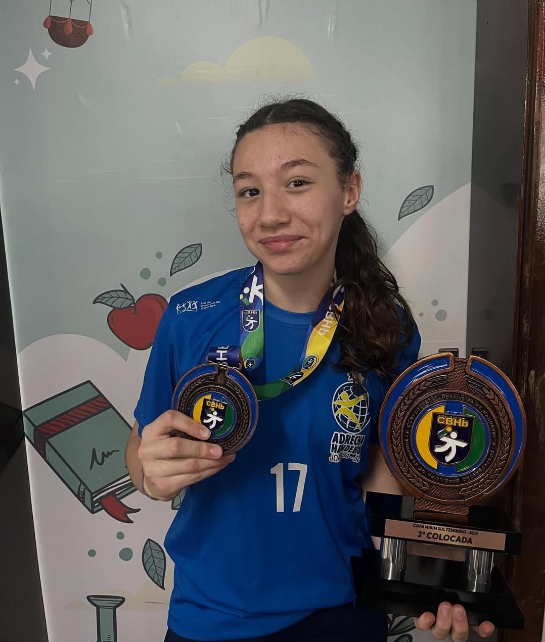 A equipe feminina da Associação Desportiva e Cultural de Handebol (Adrecha), de Joaçaba, reforçada por atletas lageanas, conquistou a medalha de bronze na Copa Sul Mirim de Handebol, disputada entre os dias 9 e 12 de outubro, em Guarapuava (PR). A competição reuniu as principais equipes de base do Sul do país e garantiu às meninas uma vaga no Campeonato Brasileiro Mirim 2026, que será realizado em São Bernardo do Campo (SP).