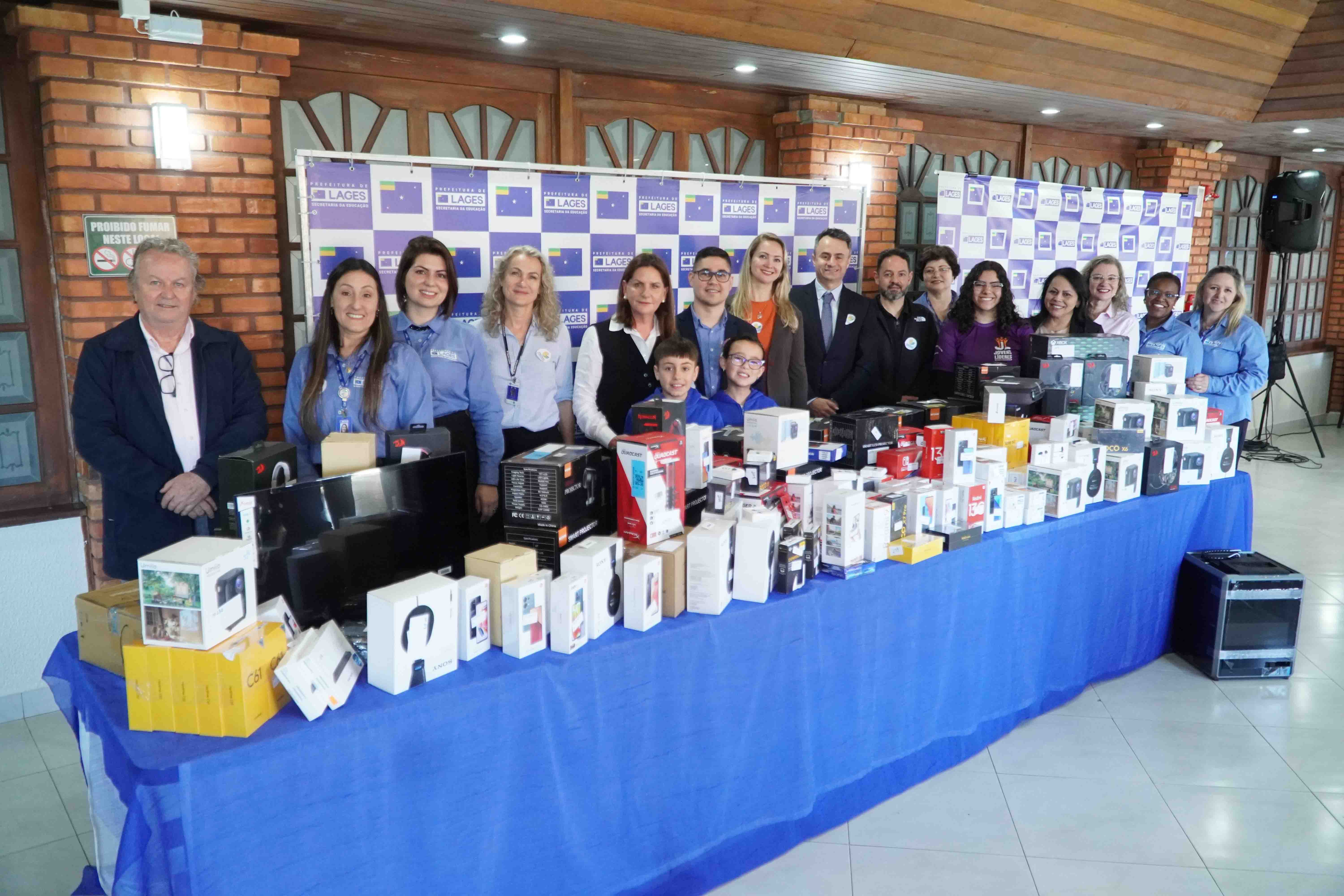 A Secretaria Municipal da Educação realizou, na manhã de terça-feira (14), o 2º Café Cidadania. O evento foi marcado pelo recebimento de quase R$ 500 mil em produtos doados pela Receita Federal, que serão utilizados para premiar as crianças e estudantes dos Programas de Educação Fiscal. O encontro também celebrou a assinatura do termo de adesão e cooperação técnica com o Programa Educando Cidadãos, do Ministério Público de Santa Catarina.