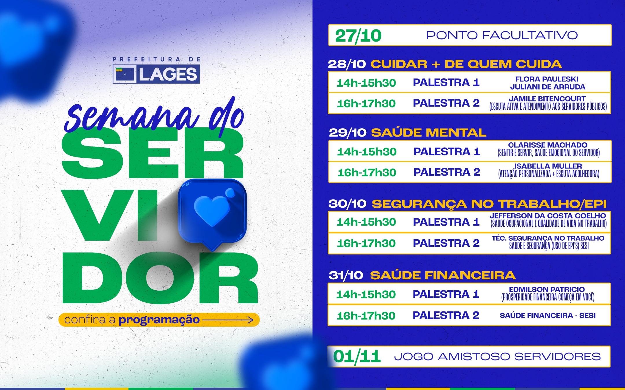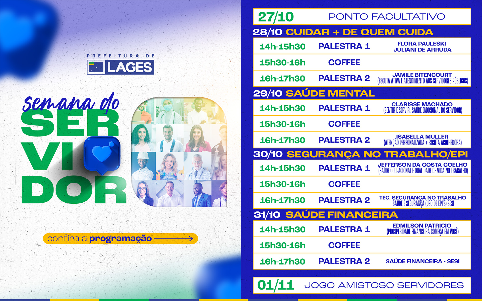 E para valorizar e reconhecer o trabalho dos servidores públicos municipais de todas as secretarias e órgãos vinculados à Prefeitura de Lages, o Município planejou, idealizou e desenvolverá a Semana do Servidor Público Municipal, de 28 de outubro a 1º de novembro, com um roteiro de palestras em relação a diversos temas, proporcionando tardes de aprendizado, troca de experiências e acolhimento. Como público-alvo, servidores públicos municipais de todas as secretarias e órgãos da Prefeitura de Lages, incluindo efetivos, comissionados, temporários e estagiários.