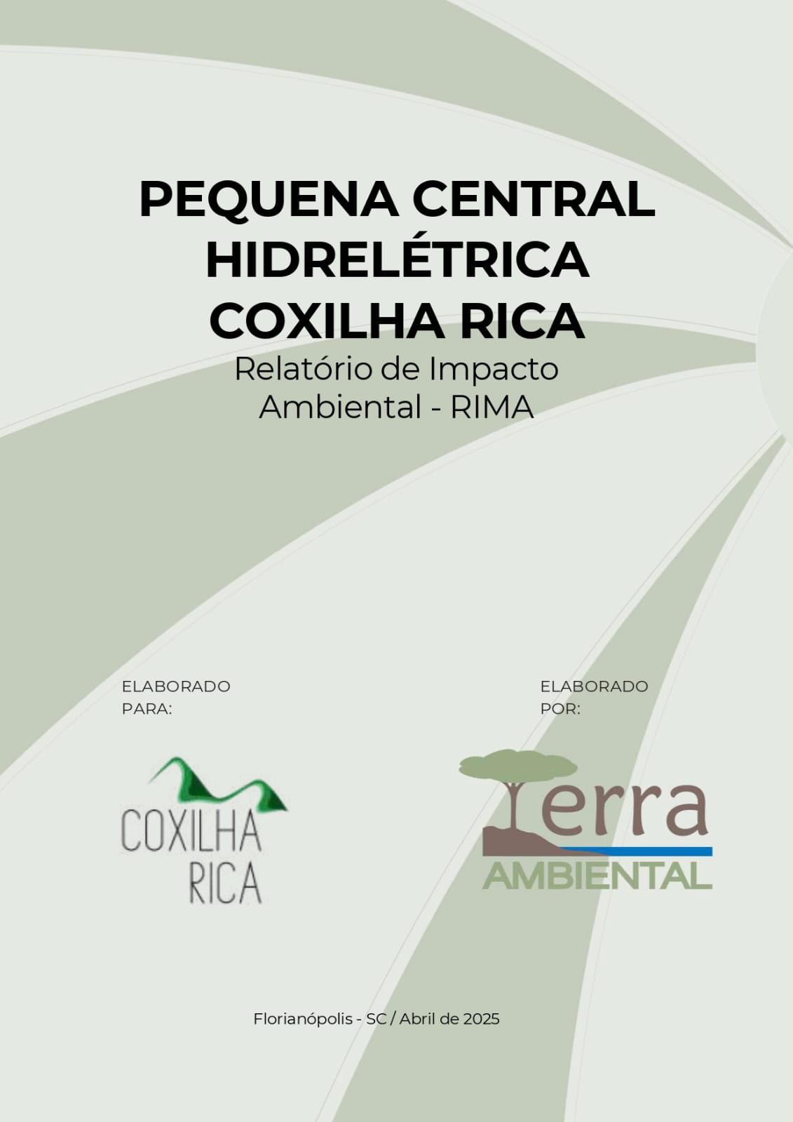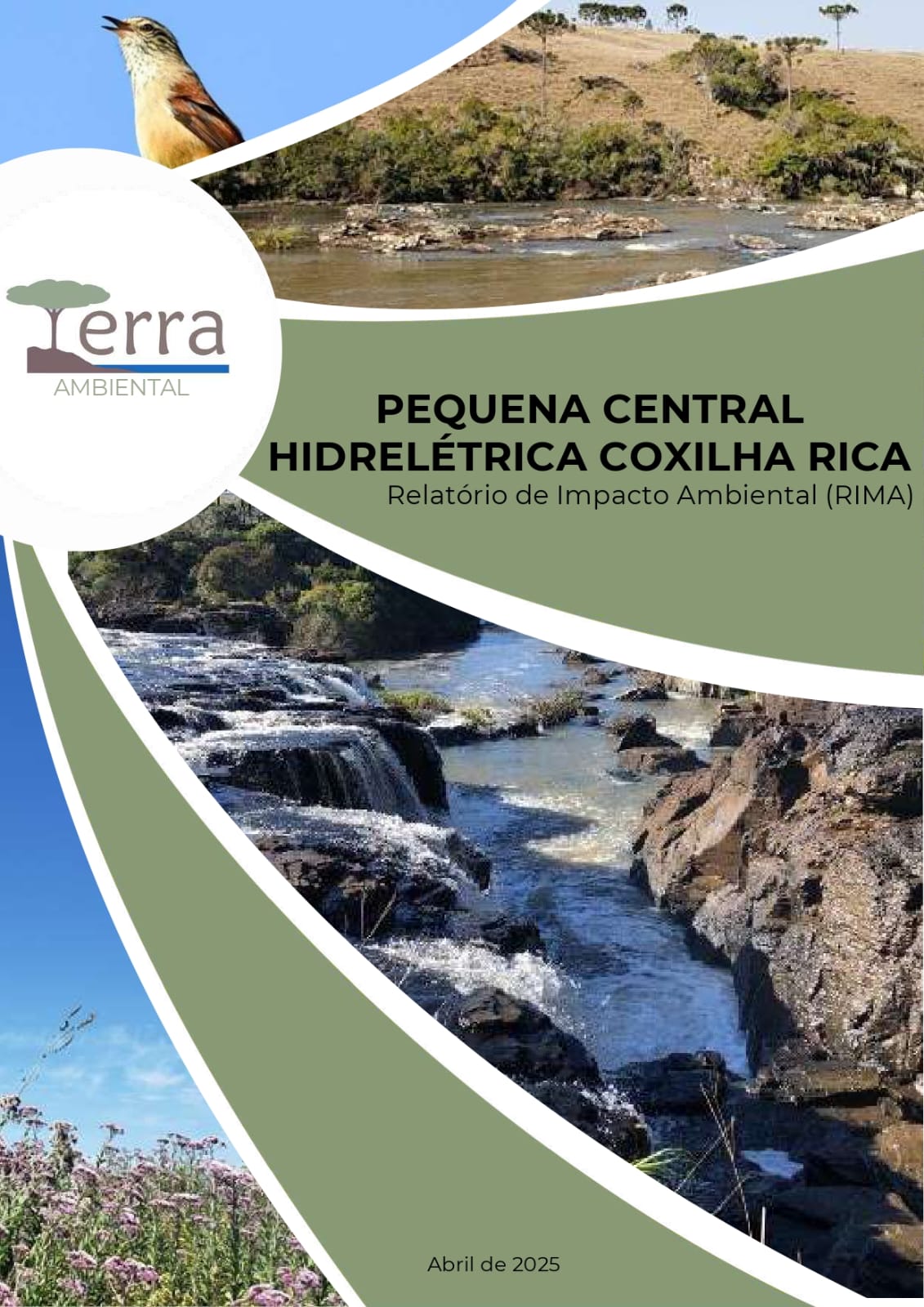Portanto, o Relatório de Impacto Ambiental (Rima) compreende um documento resumido do Estudo de Impacto Ambiental (EIA), que analisa e avalia as consequências socioambientais de um projeto, ou seja, olha para as possíveis alterações no meio ambiente que pode causar. Como objetivo do Rima, esclarecer a população sobre o tipo de obra pensada, sua localização e sua função na economia local e regional, os potenciais impactos ambientais a ela associados e as medidas previstas para amenizar ou evitar os impactos negativos e potencializar os impactos positivos. O Estudo de Impacto Ambiental (EIA) e o Relatório de Impacto Ambiental (Rima) da Pequena Central Hidrelétrica (PCH) Coxilha Rica foram elaborados pela empresa Terra Ambiental Consultoria em Meio Ambiente Ltda. [registro no Instituto Brasileiro do Meio Ambiente e dos Recursos Naturais Renováveis - Ibama], encomendados por Coxilha Rica, com material digital pronto em abril deste ano de 2025/Florianópolis.