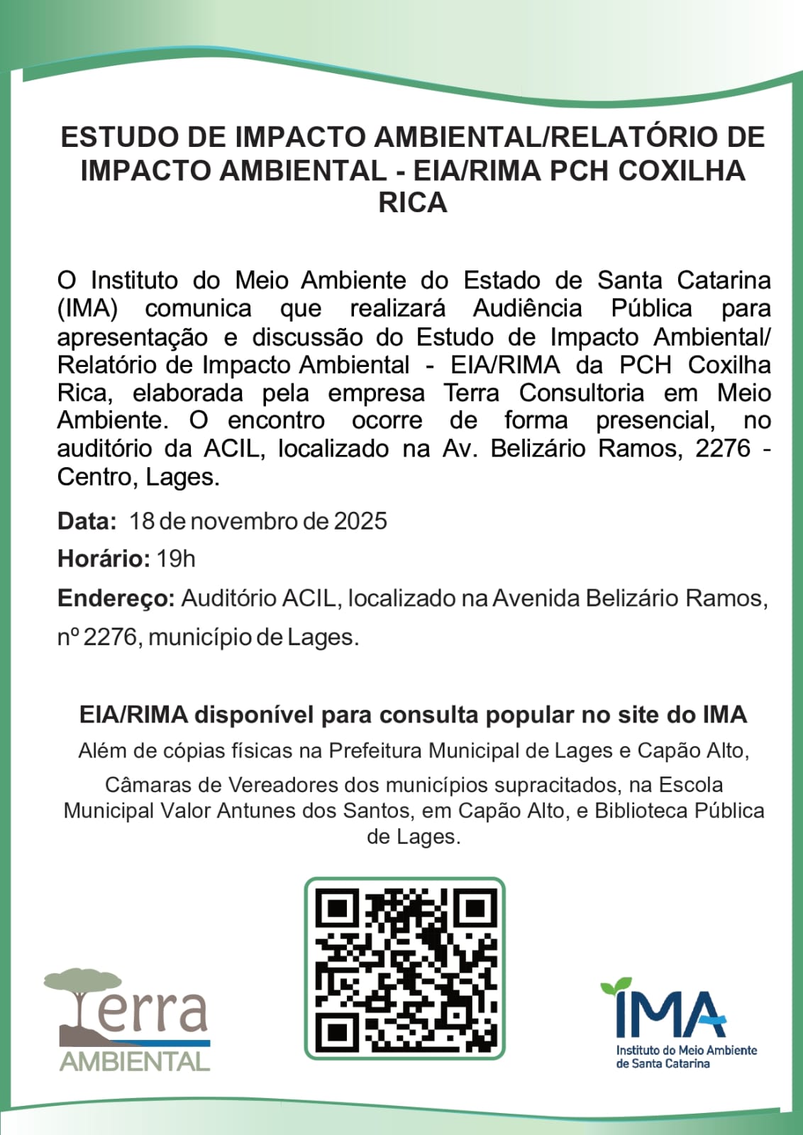 Agora, no próximo dia 18 de novembro, será realizada uma audiência pública para apresentação e discussão do Estudo de Impacto Ambiental/Relatório de Impacto Ambiental da PCH Coxilha Rica, no auditório da Associação Empresarial de Lages (Acil), às 19h. Audiência pública ocorrerá também no município de Capão Alto.