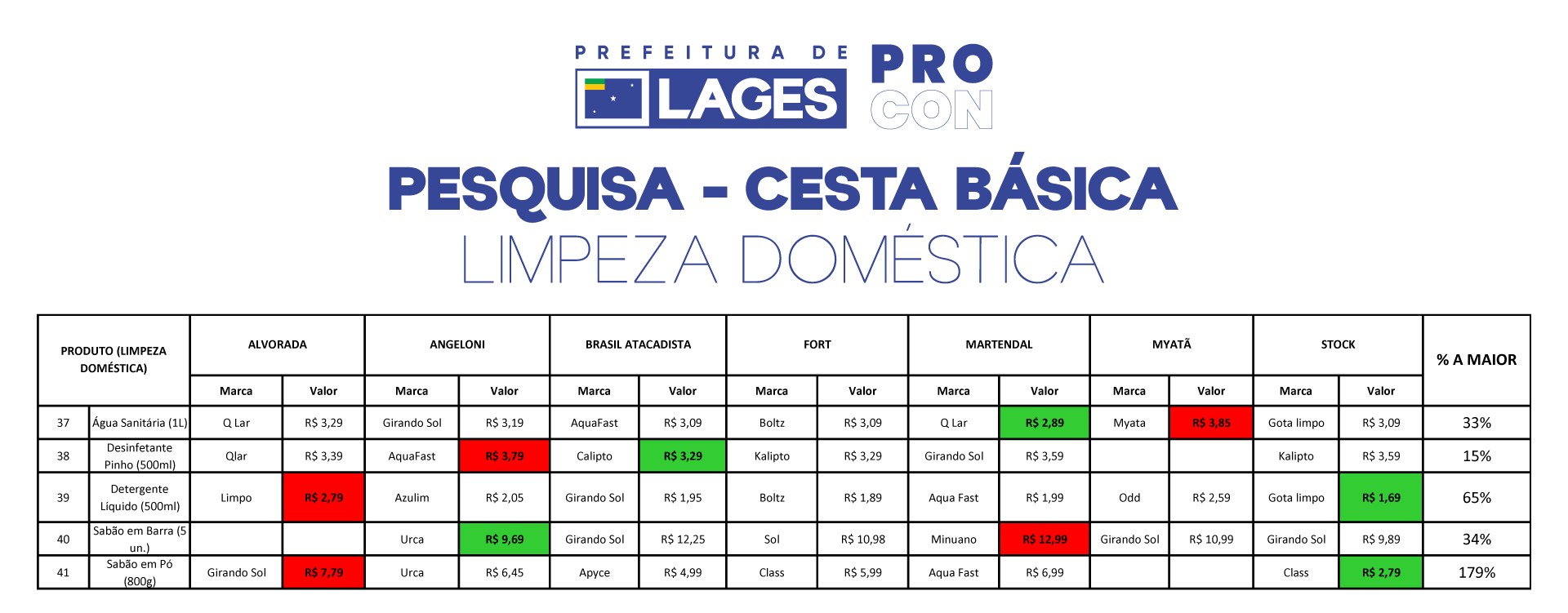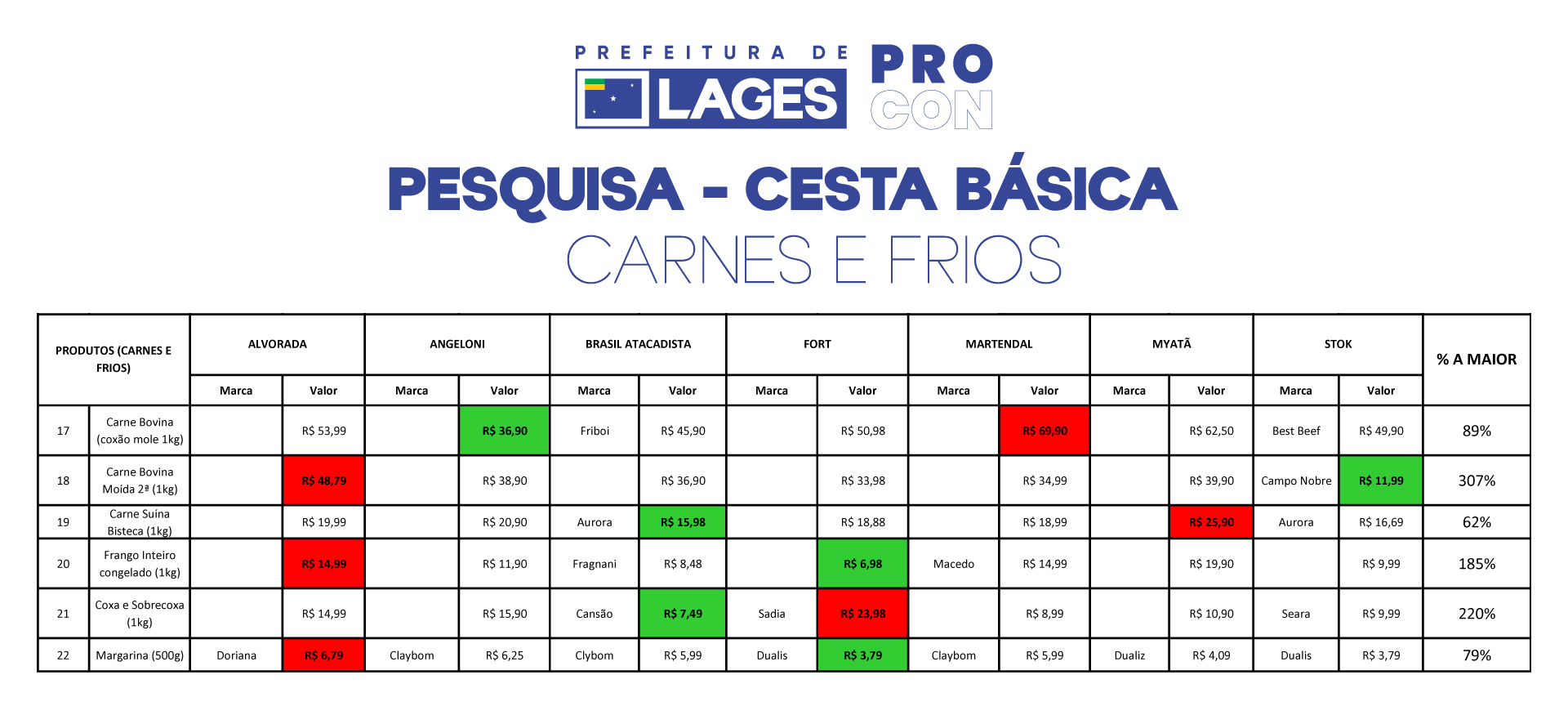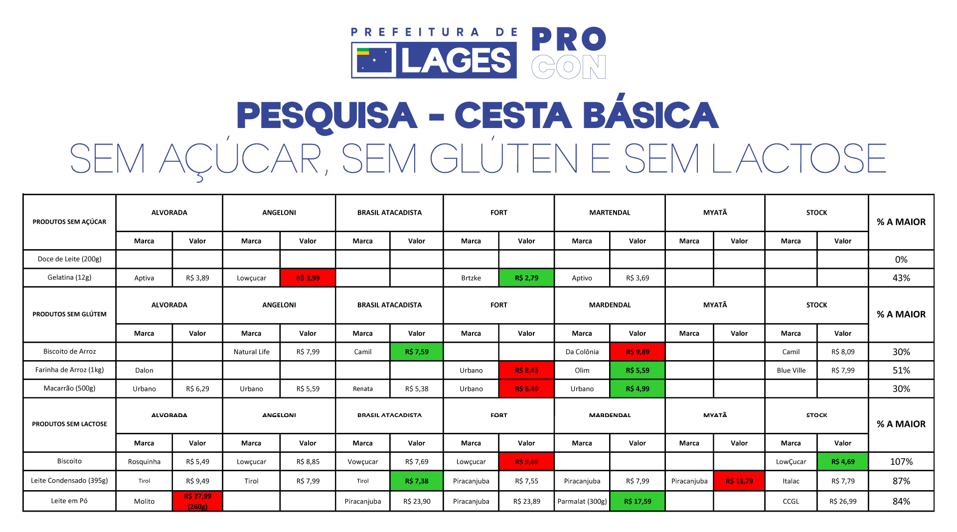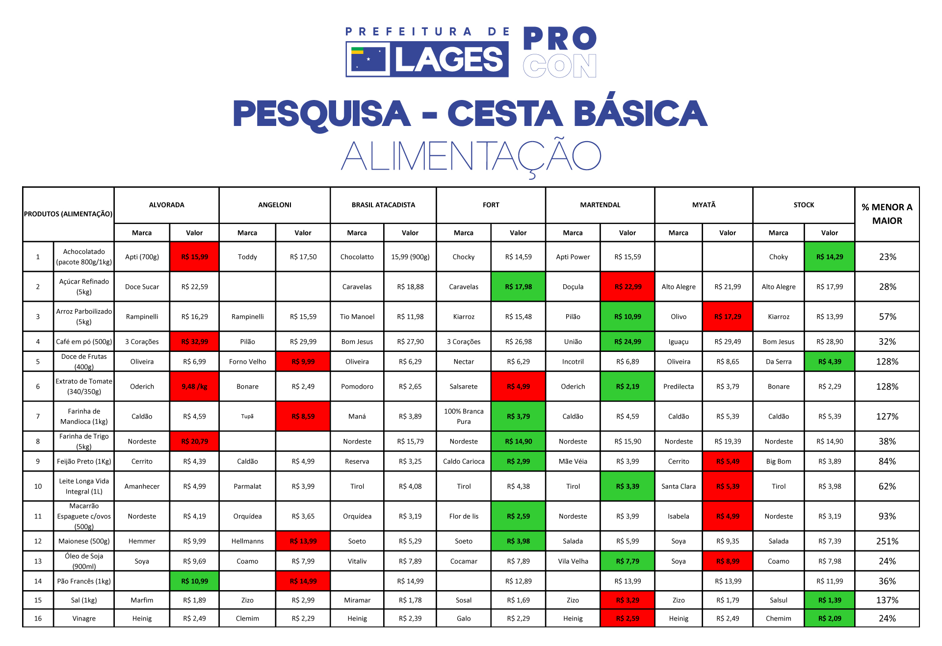 A variação entre os preços de produtos do mesmo tipo a pesquisa geral de alimentação podem chegar a 251% para o mais caro e 23% para o mais barato. No topo da lista, a maionese de 500g é que apresenta maior diferença com valores entre R$ 5,29 a R$ 13,99. “É importante ressaltar que os produtos pesquisados que constam na lista do Procon são os mais em conta em cada estabelecimento, independentemente de marca”, explica o coordenador do Procon de Lages, Kevin Gonçalves Calbusch.
