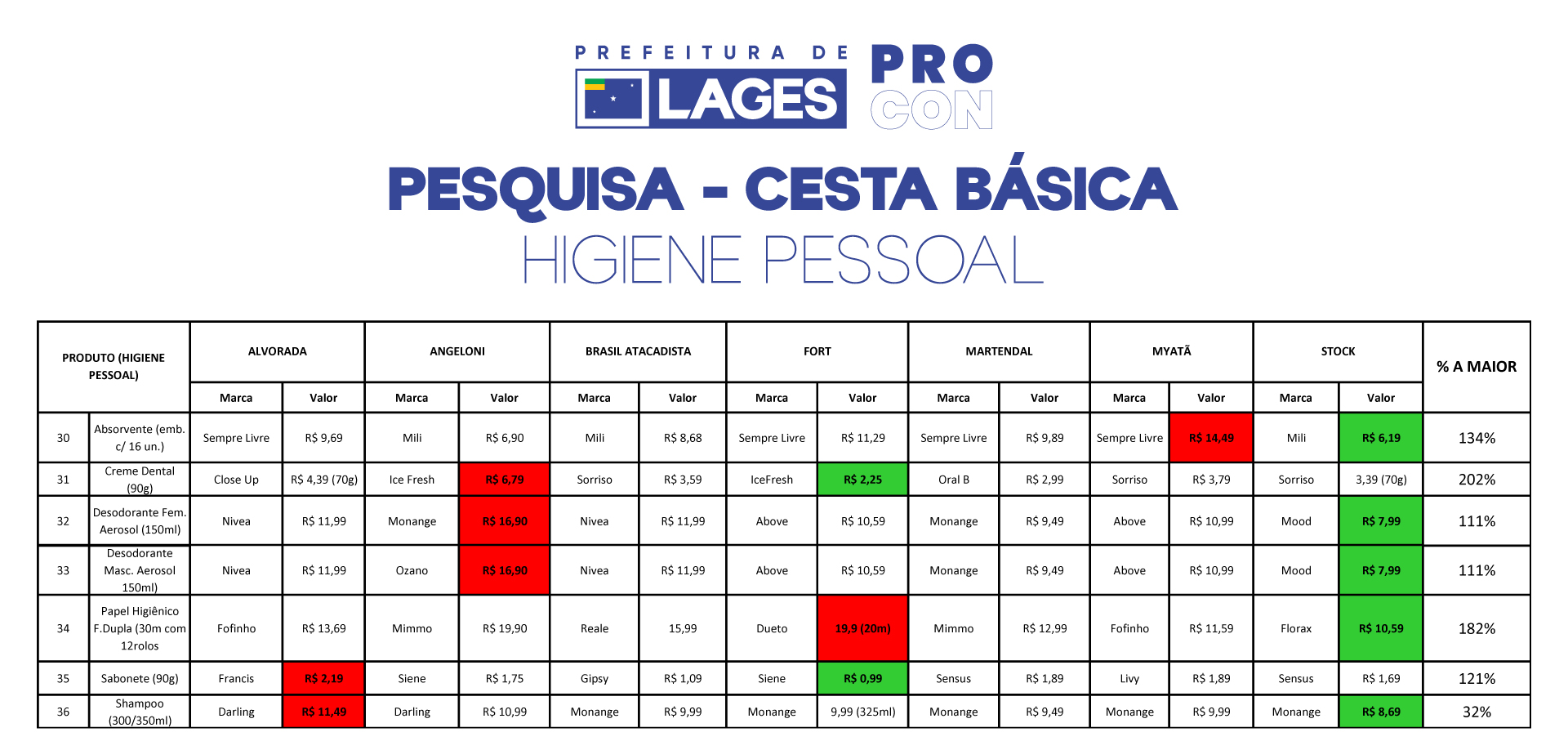 Higiene pessoal e produtos especiais – Entre os itens de higiene pessoal destacam-se absorventes, creme dental, desodorantes, sabonete e shampoo. O item com maior variação, assim como no mês anterior, foi o creme dental, com oscilação de preços de 202%, variando entre R$2,25 e R$ 6,79.