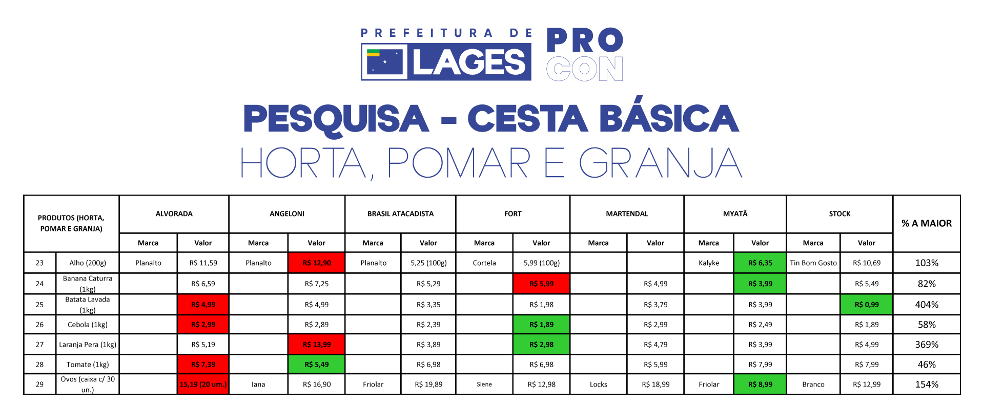 Os produtos pesquisados vão desde os mais básicos como arroz e feijão, passando por carnes, itens de higiene pessoal, horta, pomar e granja, limpeza doméstica e alimentos sem glúten e sem lactose