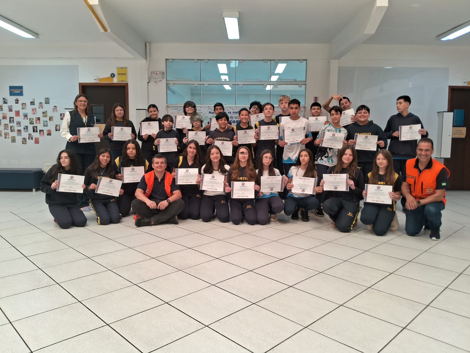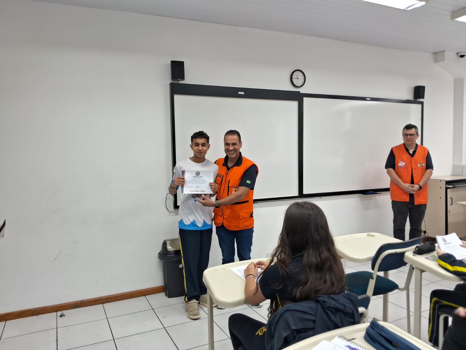 Tendo em vista os cenários de risco, histórico de desastres e zonas de perigo no município, a equipe explanou sobre a origem e papel da Defesa Civil e os ciclos de desastres. Na oportunidade, houve também a entrega dos certificados de conclusão do programa Defesa Civil nas Escolas para a turma do 7º ano. “Esta é uma maneira muito simbólica de incentivar esses estudantes para o reconhecimento de práticas que consolidam a Proteção e Defesa Civil em Lages. Ao prestigiar este feito enaltecemos todo o esforço dos professores e levamos nossos serviços para mais perto da comunidade”, destaca.