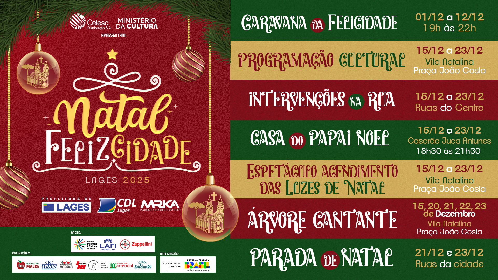 O Natal Feliz Cidade será de 1º de dezembro de 2025 a 6 de janeiro de 2026 (decorativo), com programação artística e cultural de 15 até 23 de dezembro. A Magia do Natal no Coração da Serra Catarinense no centro da cidade - Calçadão da Praça João Costa - Palco Espaço Cultural Aristiliano Ramos e em outros estimáveis locais da área central.