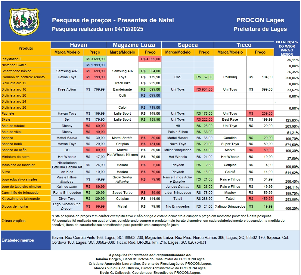 Na pesquisa da ceia de Natal foram levantadas as informações nos supermercados/ atacadistas: Alvorada, Angeloni, Brasil Atacadista, Fort, Martendal, Myatã e Stock Center. Já para a pesquisa dos brinquedos foram selecionadas quatro lojas, sendo elas: Havan, Magazine Luiza, Sapeca Brinquedos e Ticco Brinquedos do Lages Shopping Center. “As duas pesquisas mostraram grandes variações, o que revela a competitividade de mercado existente em Lages, além do comércio eletrônico. Isso é bom para o consumidor que possui várias opções para escolher a que mais se encaixa no seu orçamento”, salienta.