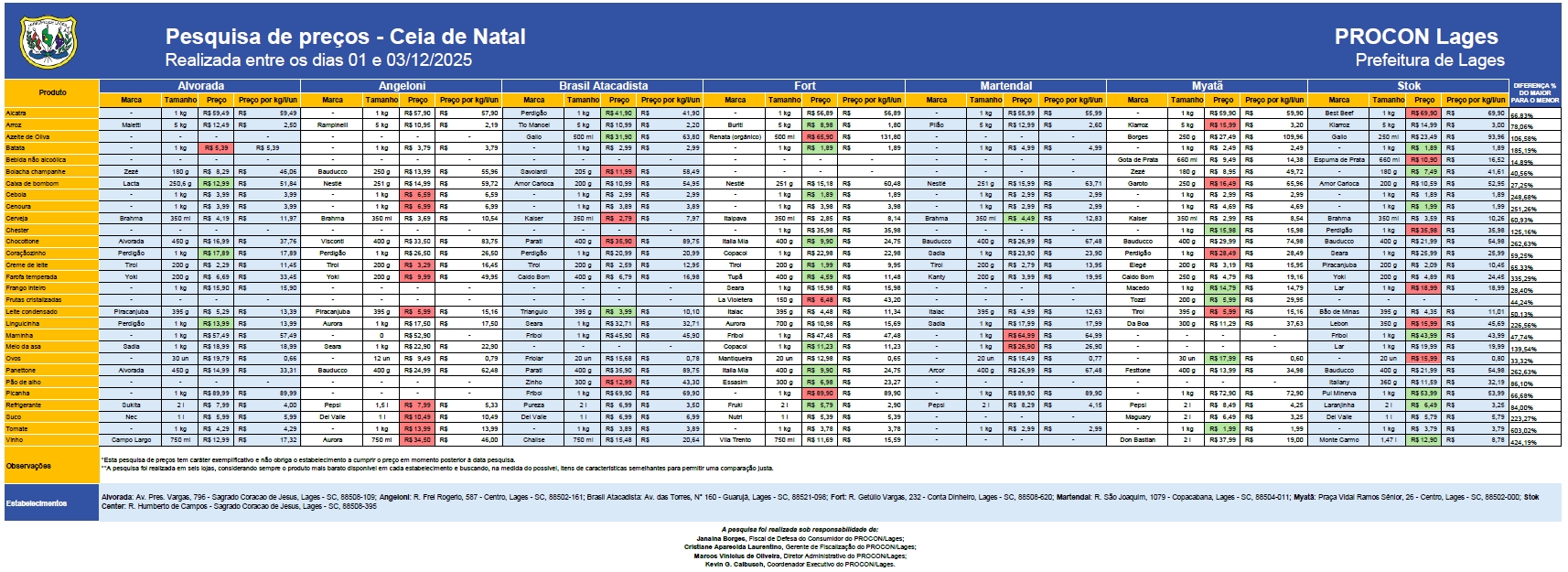 Este levantamento especial de fim de ano, de acordo com o coordenador do Procon de Lages, Kevin Gonçalves Calbusch, foi feito para poder informar o consumidor sobre a comum variação de preços nesta época do ano. “Sabendo que esta é a data mais importante do ano para o aquecimento da economia, buscamos auxiliar os consumidores a economizarem na hora de comprar a ceia de Natal, mostrando os comparativos de preços e os locais em que estão os produtos mais baratos, assim como a proximidade dos estabelecimentos com suas residências”, explica Kevin.