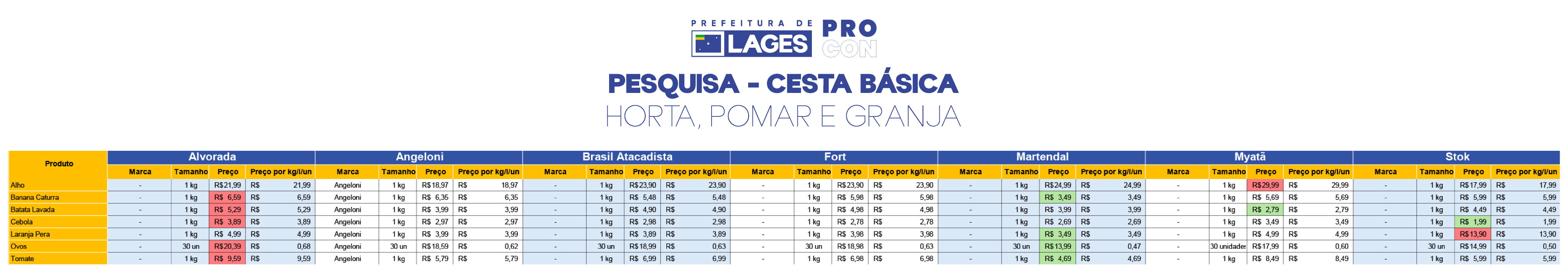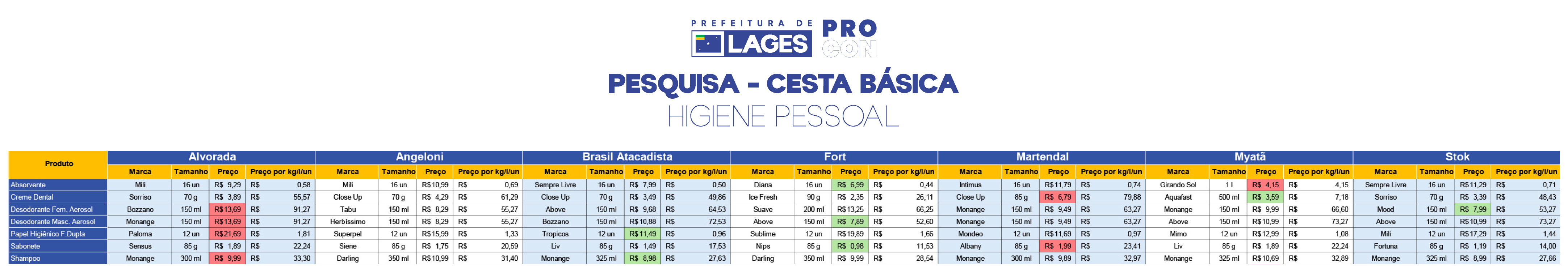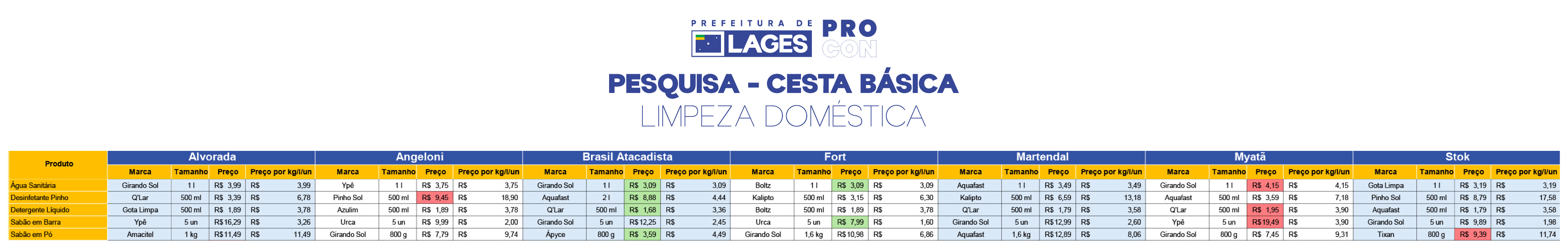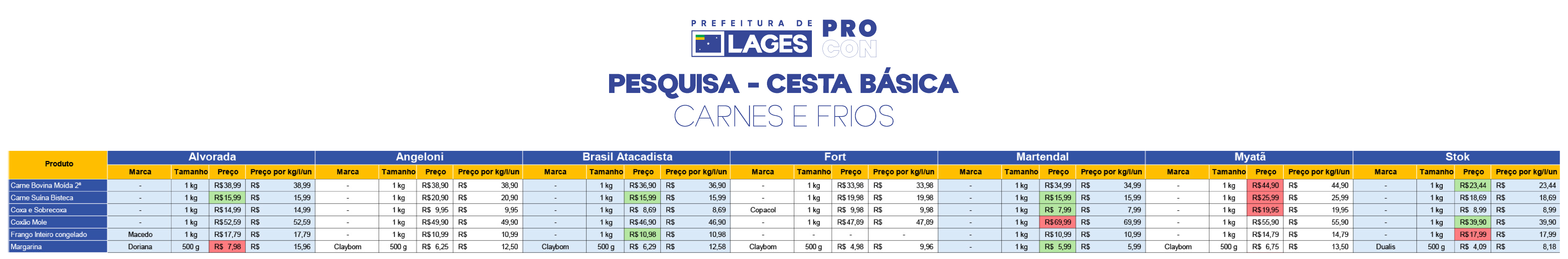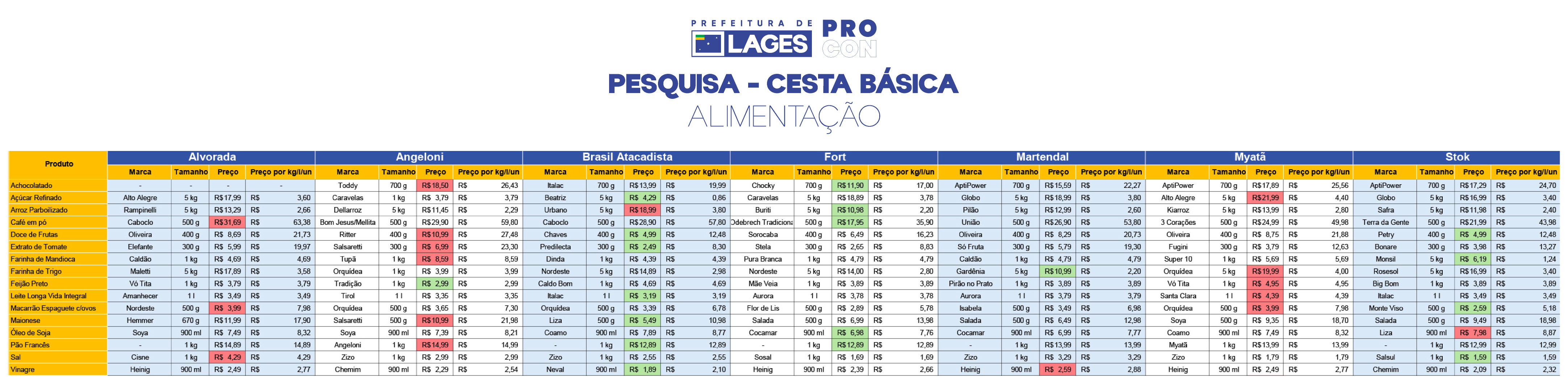 O Programa de Defesa do Consumidor (Procon) de Lages divulgou o resultado da Pesquisa de Preços da Cesta Básica realizada nos dias 5 e 6 de janeiro de 2026, com o objetivo de orientar os consumidores e promover a transparência nas relações de consumo. O levantamento foi feito em sete estabelecimentos comerciais do município: Alvorada, Angeloni, Brasil Atacadista, Fort, Martendal, Myatã e Stock Center.