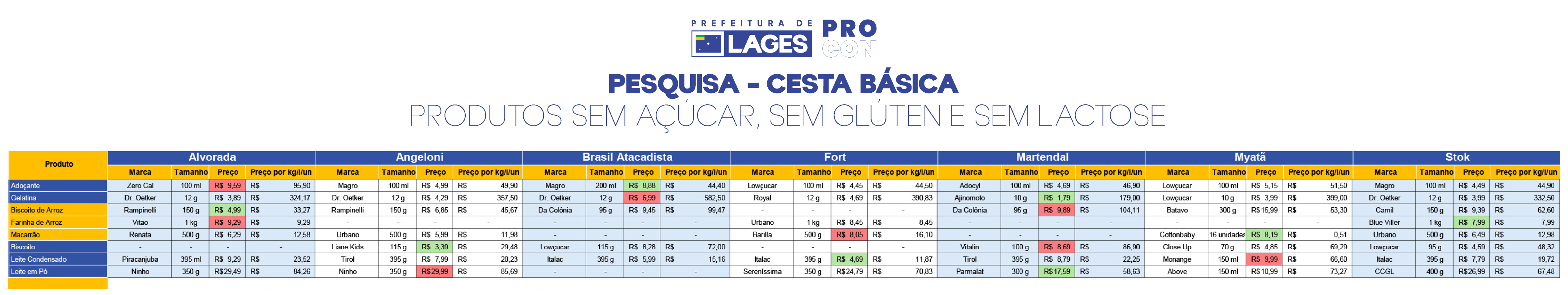 A pesquisa contemplou ampla variedade de produtos e categorias: Alimentos básicos, Carnes e Frios, Horta, Pomar e Granja, Higiene Pessoal, Limpeza Doméstica, Produtos sem Açúcar e Produtos sem Lactose. As maiores variações do mês constatadas estão condizentes com o valor do macarrão sem glúten, que apresentou 3.045,30%, e o creme dental, com variação de 1.012,57% entre os estabelecimentos pesquisados.