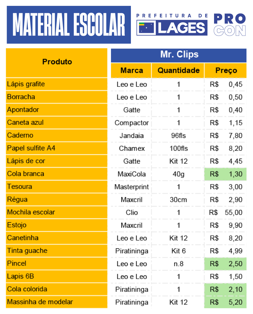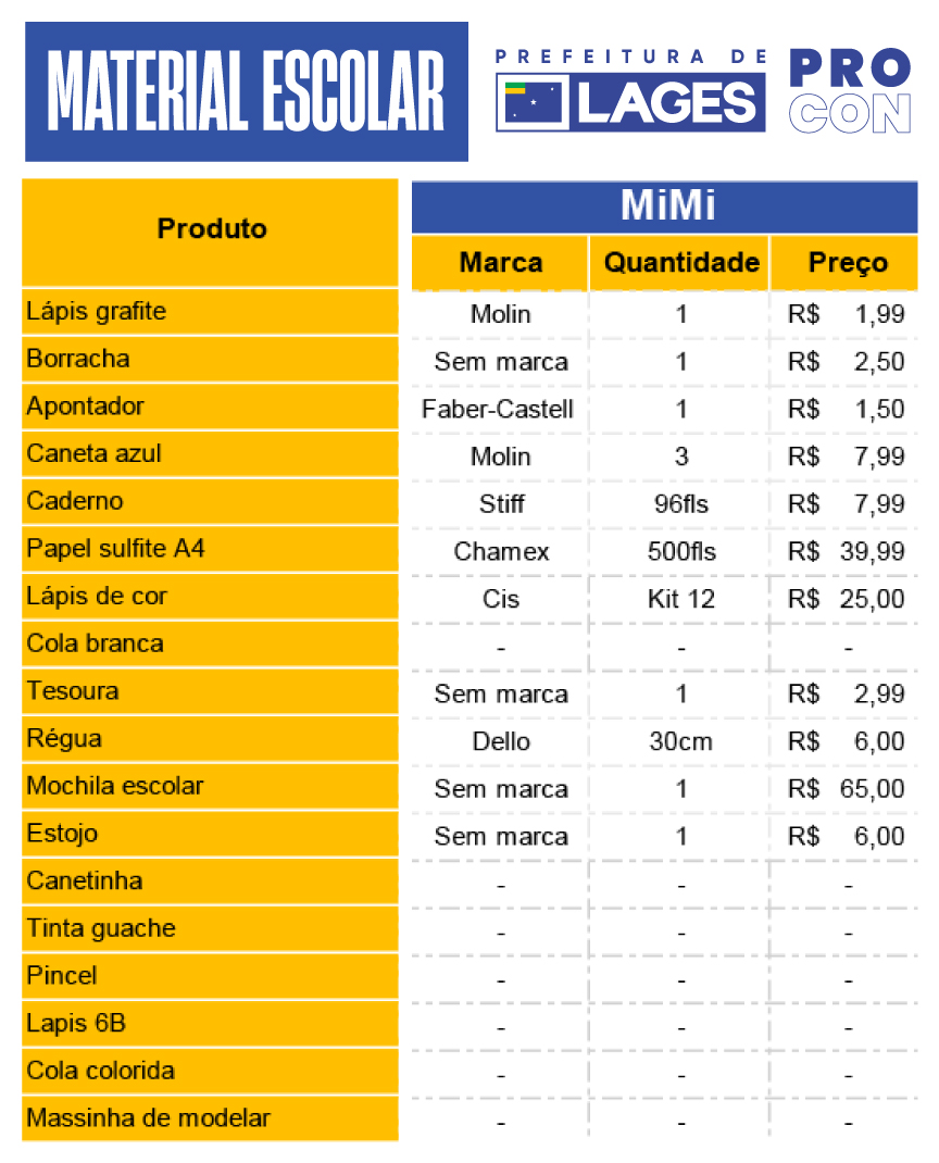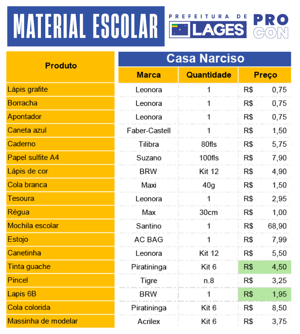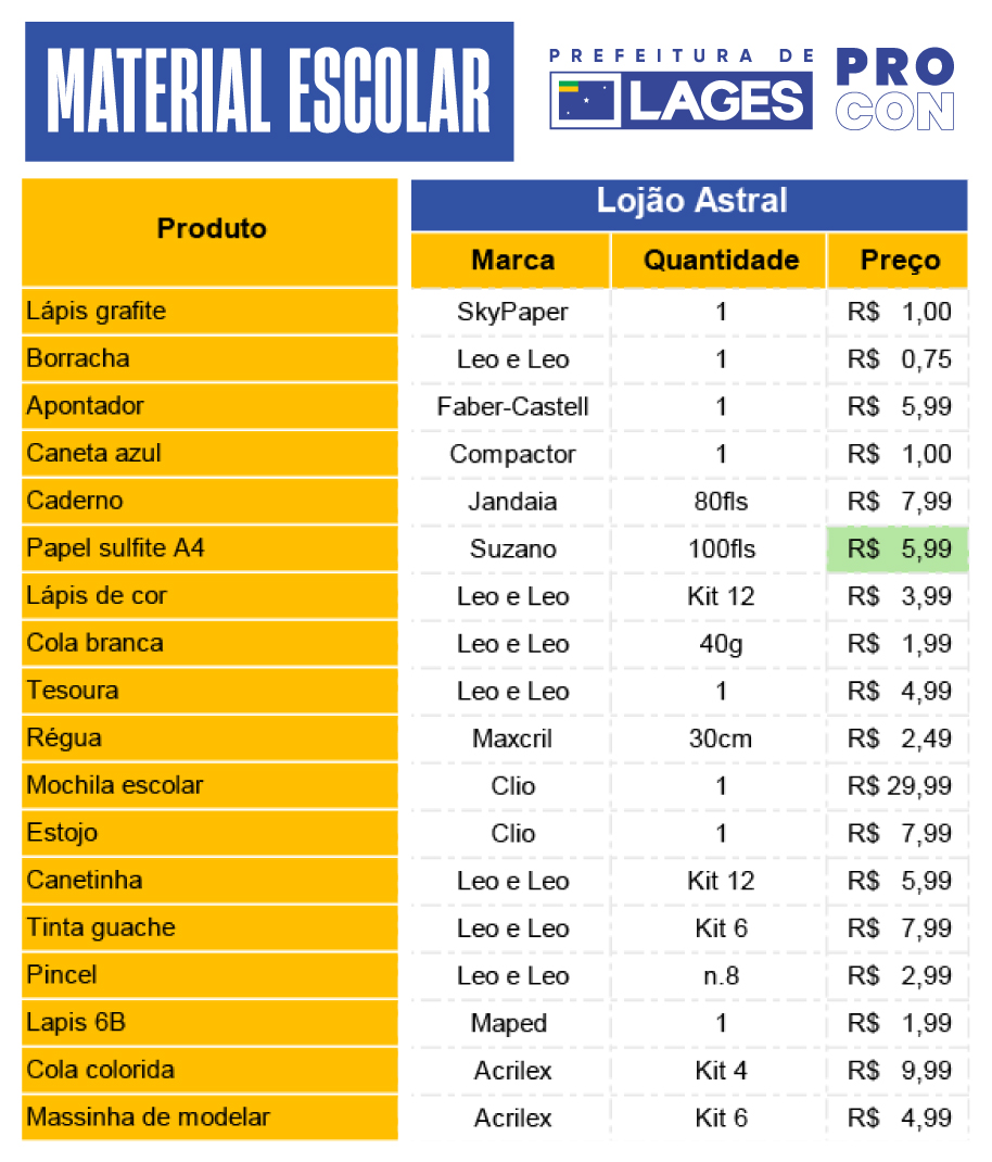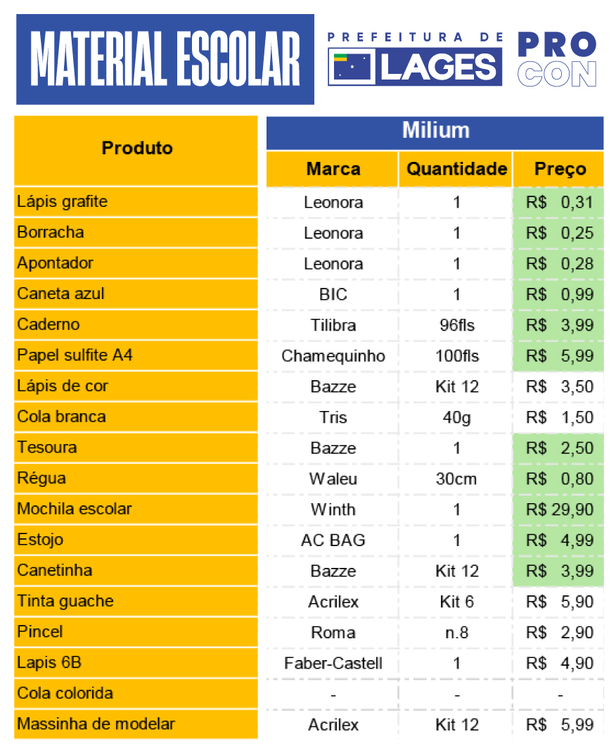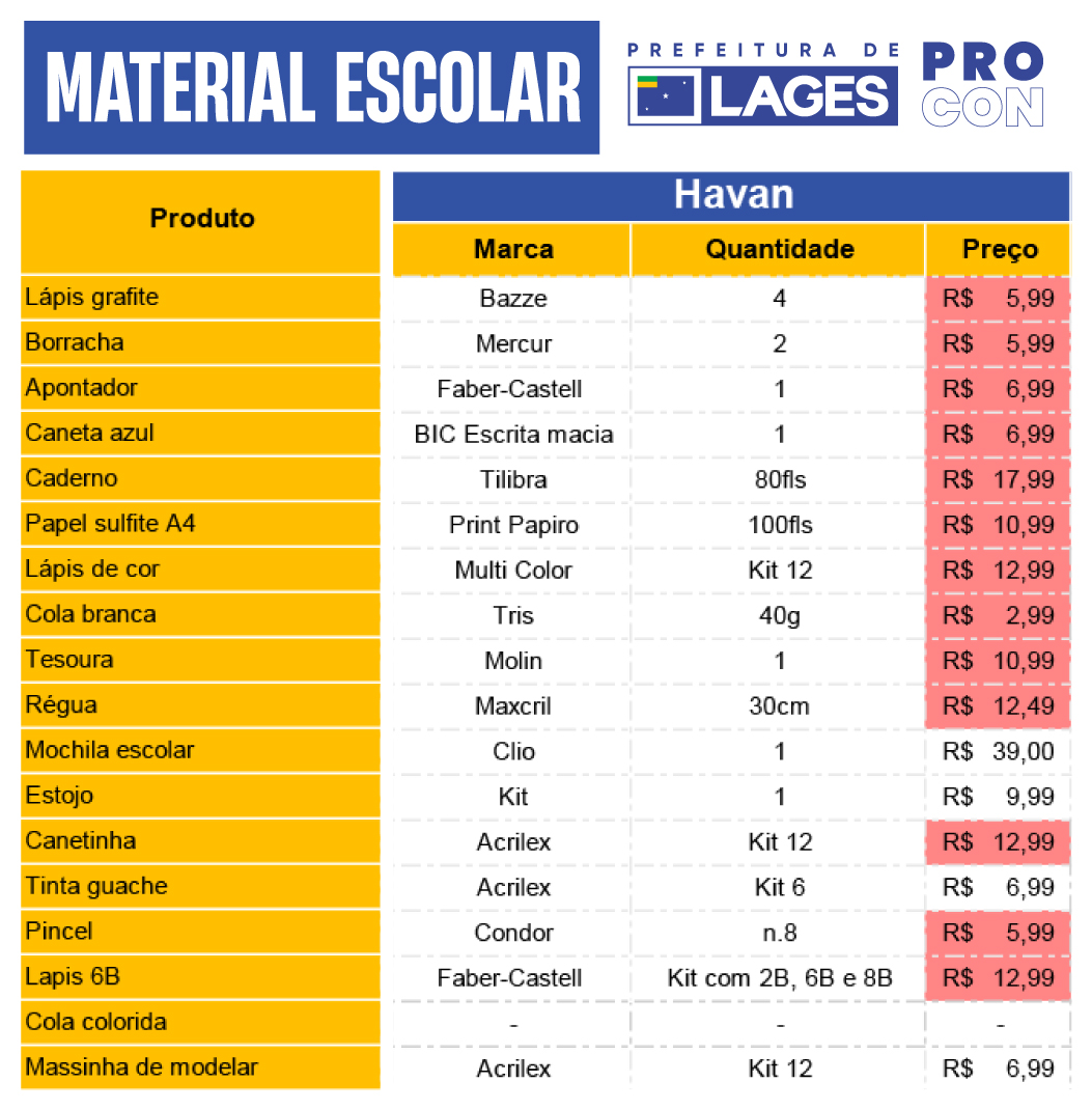 Minuciosa pesquisa de preços de materiais escolares, com os objetivos de orientar os consumidores neste período de início de ano na volta às aulas, e estimular a comparação de valores antes das compras, foi produzida no dia 6 de janeiro de 2026 pelo Programa de Defesa do Consumidor (Procon), órgão atrelado à Prefeitura de Lages. O levantamento foi praticado em sete lojas de departamentos e papelarias da cidade, englobando distintas categorias de consumo.
