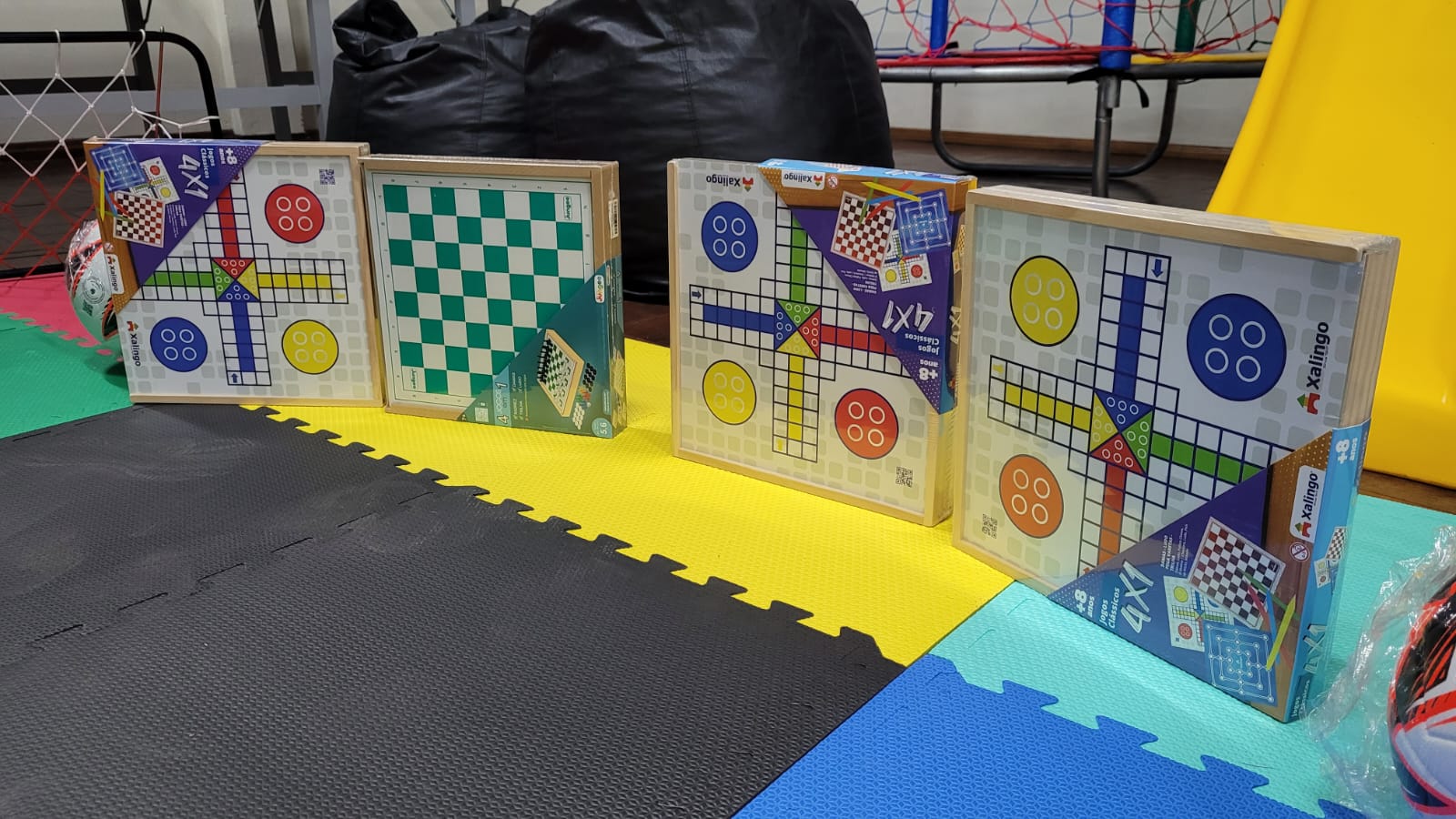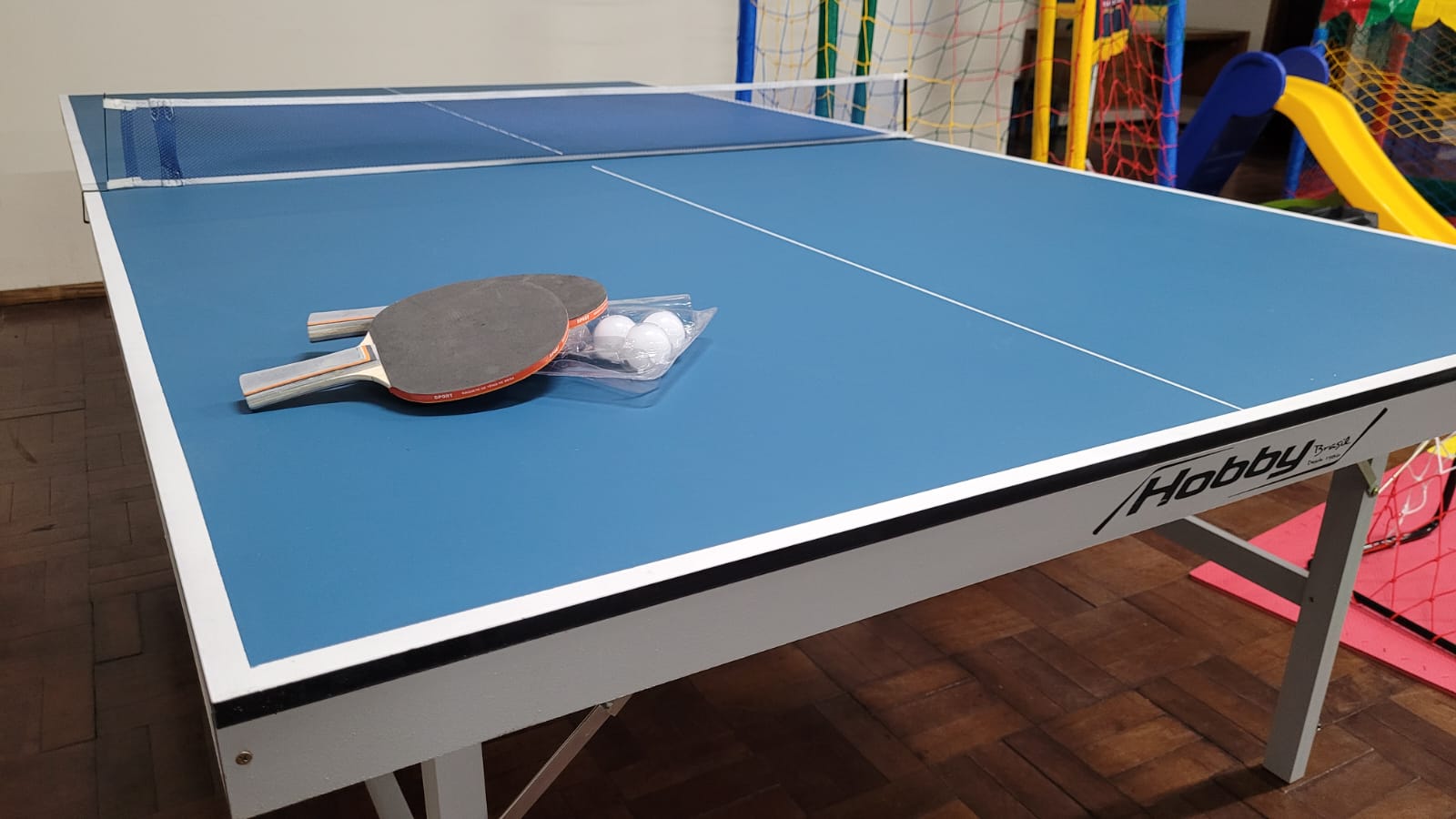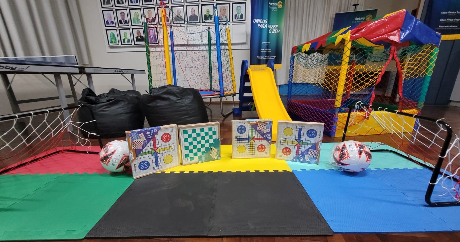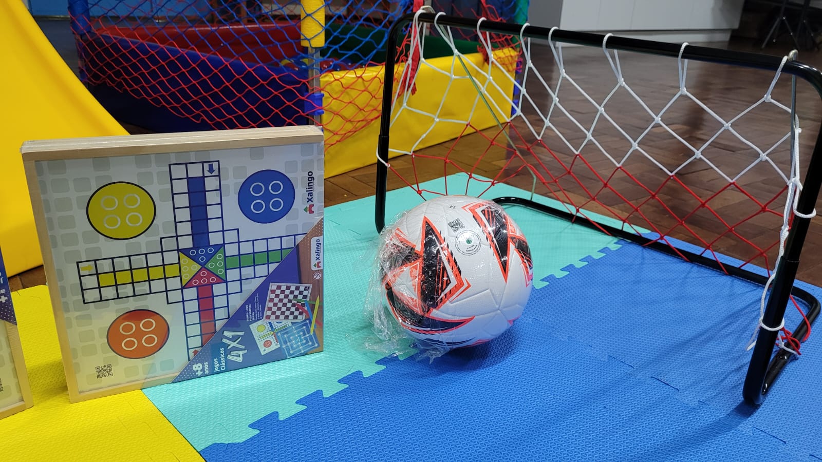 A entrega contempla um kit completo com: - 01 unid. cama elástica (pula-pula), piscina de bolinhas e escorregador; - 01 unid. mesa hobby oficial em MDF; - 01 unid. mini gol com trave e rede; - 02 unid. bolas de campo; - 02 unid. puffs tipo pera; - 12 unid. tatame em EVA; - 04 unid. jogos de tabuleiro 4x1.