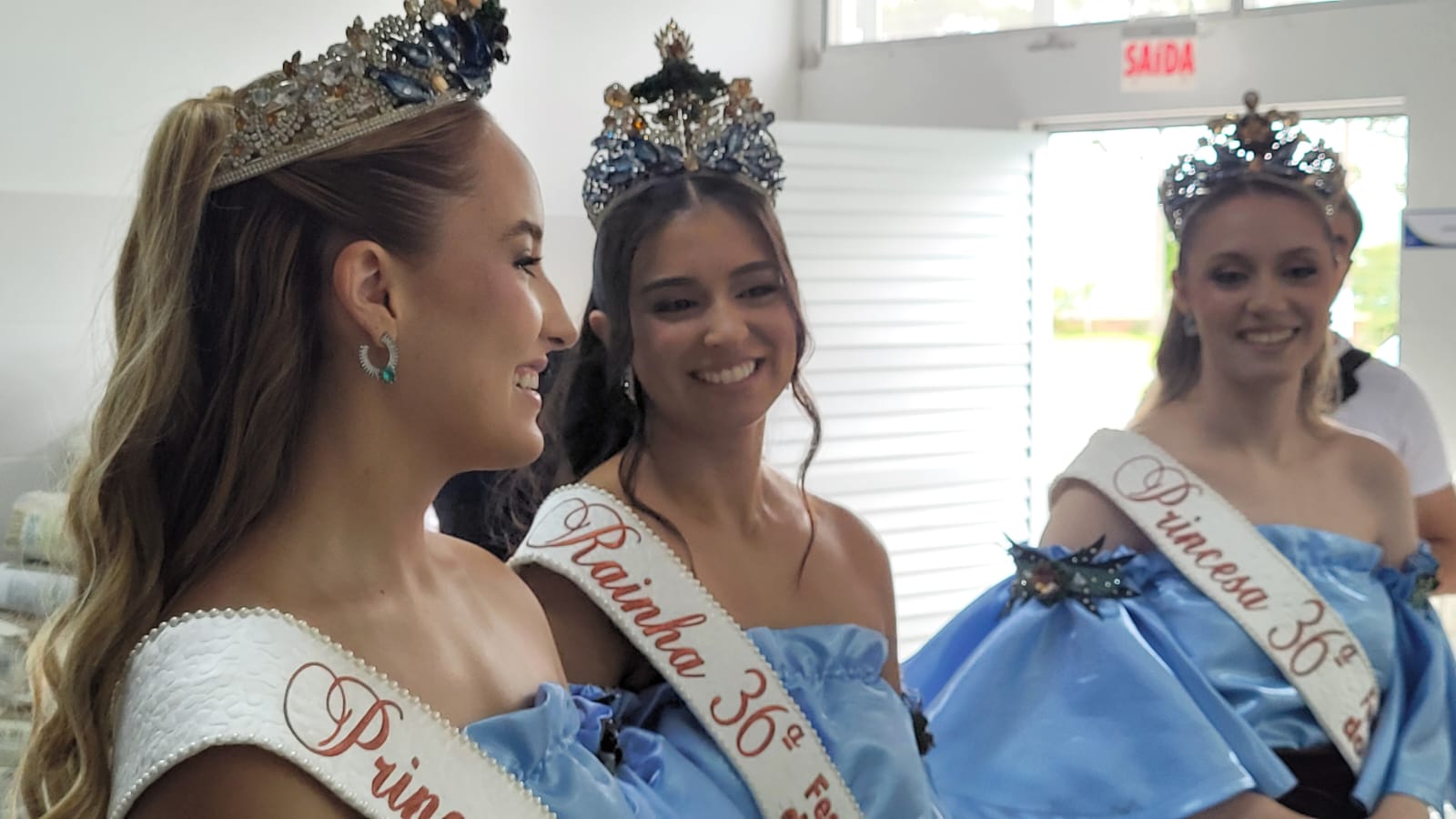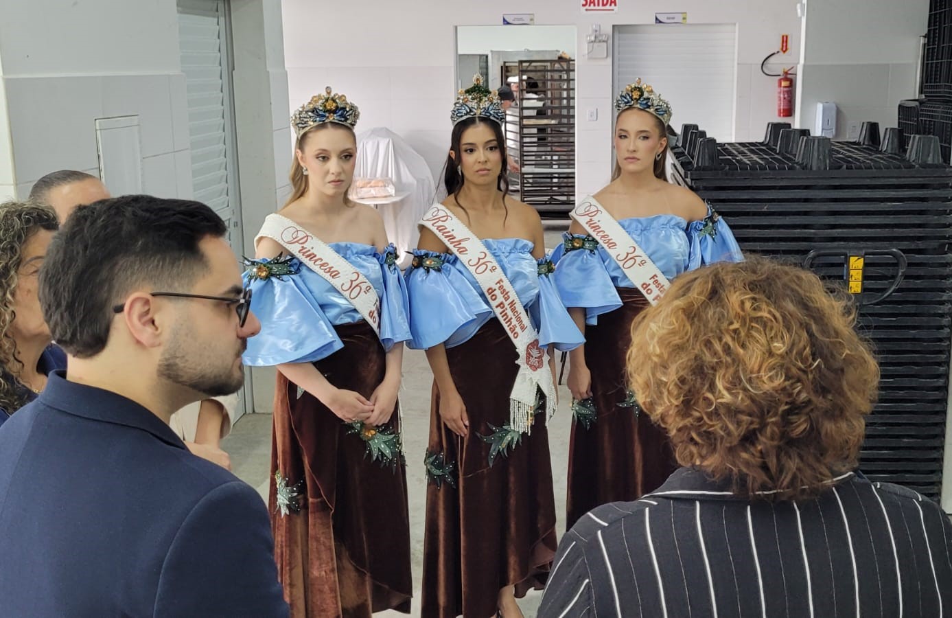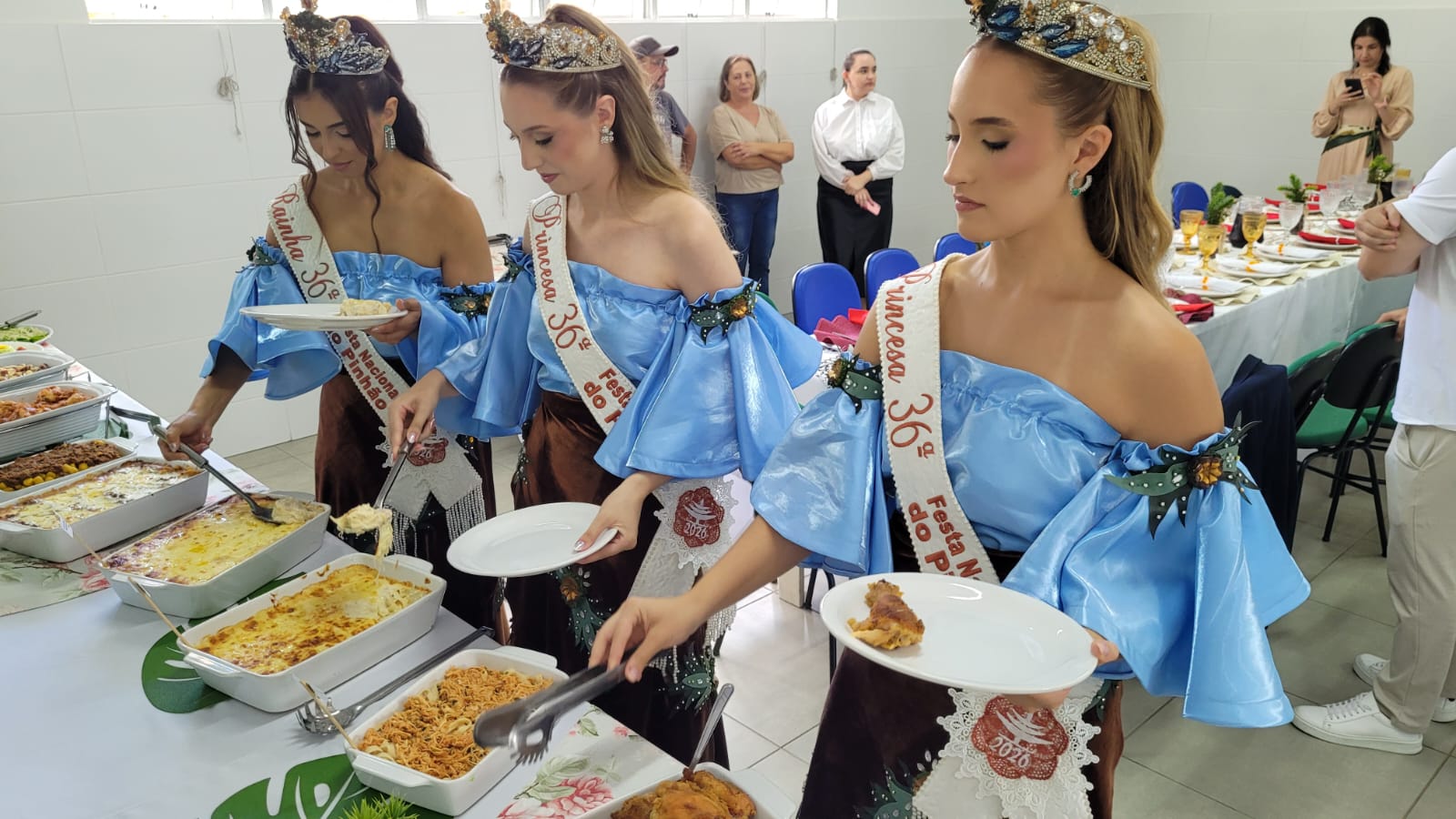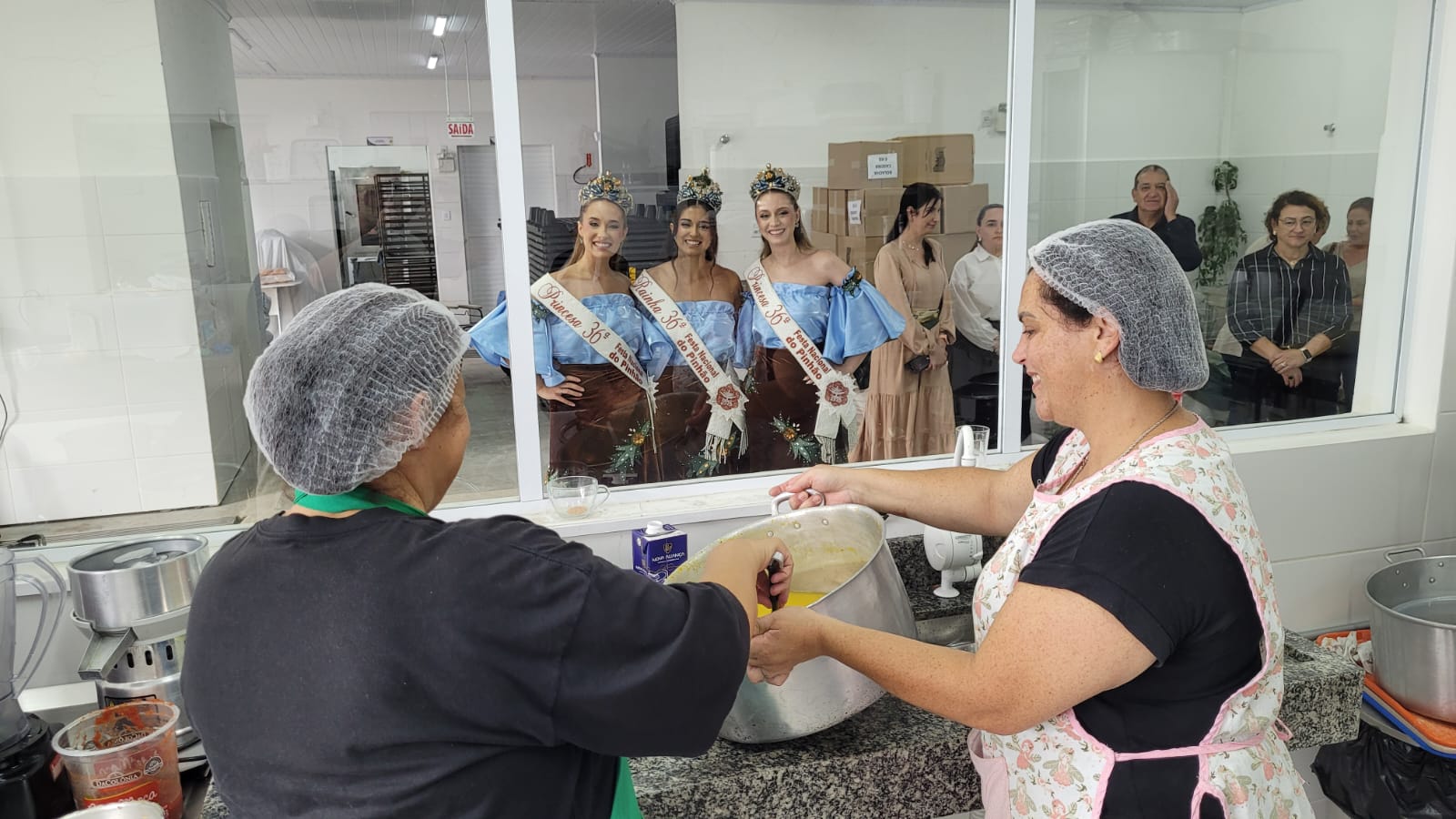 A realeza da 36ª Festa Nacional do Pinhão visitou, nesta quinta-feira (12 de março), as instalações do Banco de Alimentos de Lages, um dos principais equipamentos da rede de assistência social do município. A rainha Maria Júlia Branco da Silveira, a 1ª princesa Maria Luisa Furtado Boeno e a 2ª princesa Emilie da Silva Pereira foram recepcionadas com um almoço especial e tiveram a oportunidade de conhecer de perto a estrutura e o funcionamento do espaço.
