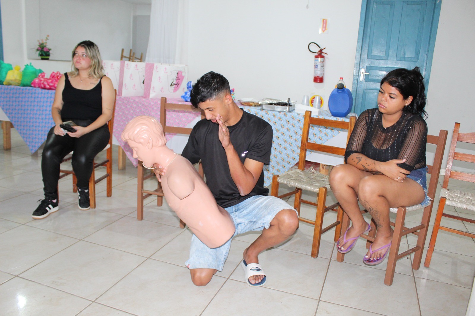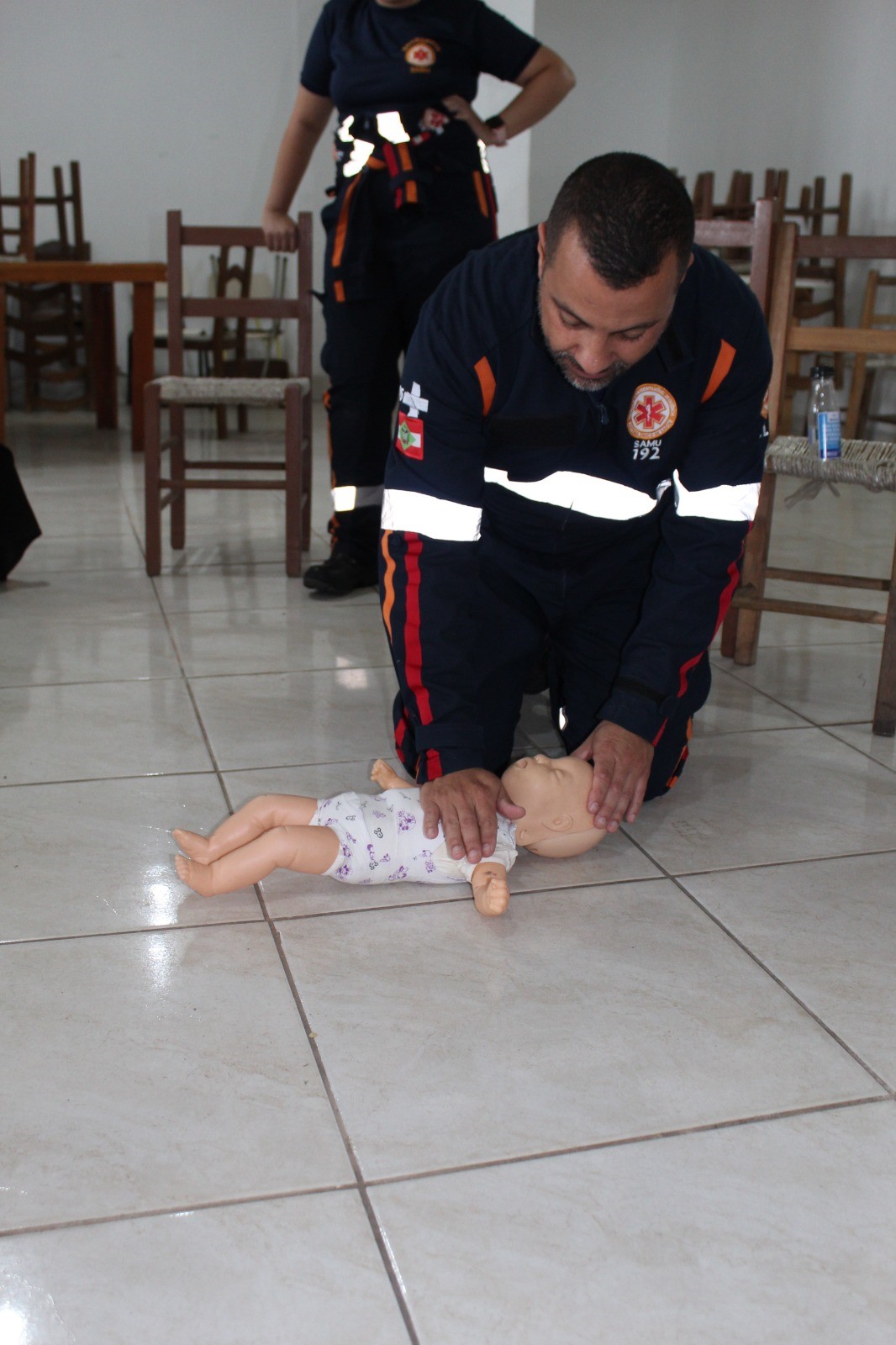 Durante a atividade, os socorristas abordaram especialmente o atendimento inicial em casos de engasgamento em recém-nascidos e crianças pequenas. A equipe explicou que os procedimentos variam conforme a idade da vítima e destacou que, em crianças maiores e adultos, a técnica utilizada é a manobra de Heimlich.