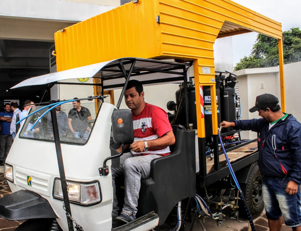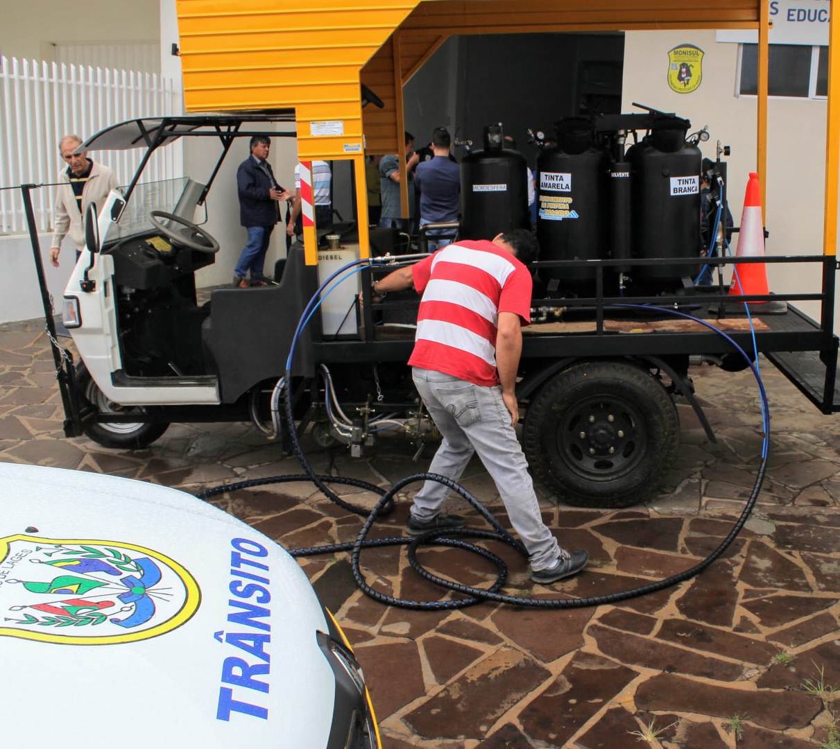 Compreende um triciclo novo com as devidas garantias, dotado de pistolas mecânicas, manual e espalhadores de microesfera e automático eletrônico. A vida útil, com as manutenções necessárias, deve passar de dez anos. Tecnicamente, o equipamento atrelado é composto por um motor à gasolina 23 cavalos (cv) de potência, compressor de ar 40 pés, dois reservatórios de tinta (branca e amarela) com capacidade para 100 litros cada um, reservatório para microesfera (pó que dá brilho) com capacidade para 60 litros, reservatório de tíner para limpeza automática de pistolas, mangueira de dez metros para pintura manual de faixa de pedestres e sistema de pintura de bordas, faixa central com duas pistolas de tinta e duas de microesfera.