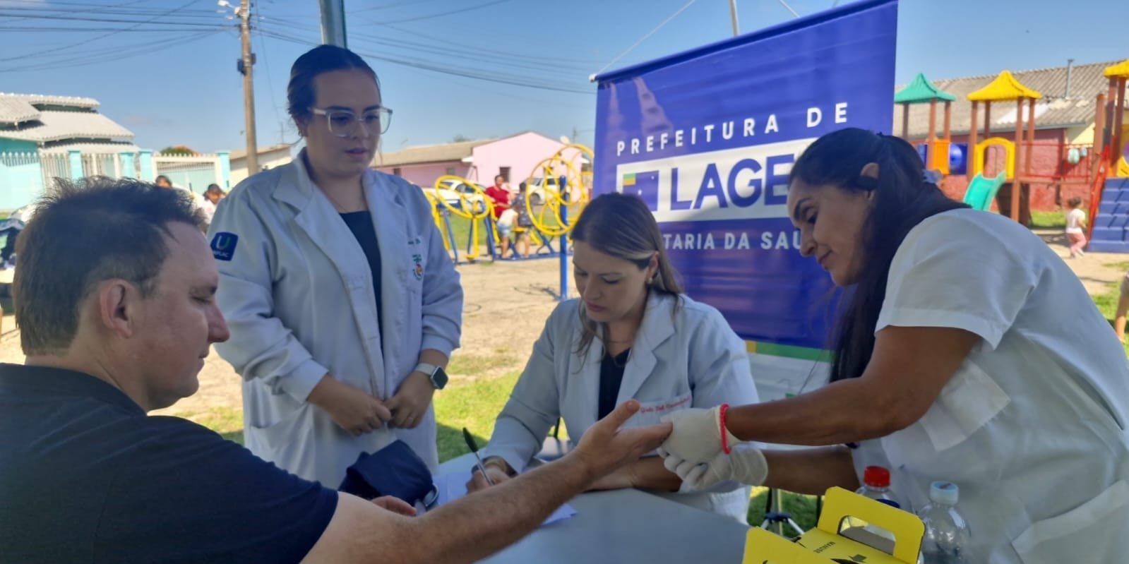 Já no bairro Guarujá, a Secretaria Municipal da Saúde, por intermédio da Diretoria de Atenção Primária (DAP), participou de uma ação destinada ao cuidado com a população, reforçando o compromisso com a organização e a ampliação do acesso aos serviços de saúde.