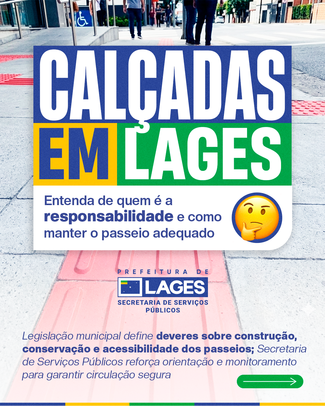 A organização e a segurança dos passeios públicos voltam ao centro das orientações da Prefeitura de Lages. De acordo com a legislação municipal, a responsabilidade pelas calçadas é dos proprietários, possuidores ou detentores do domínio útil dos imóveis lindeiros, ou seja, quem ocupa ou é dono do terreno deve garantir que o espaço esteja em boas condições de uso.